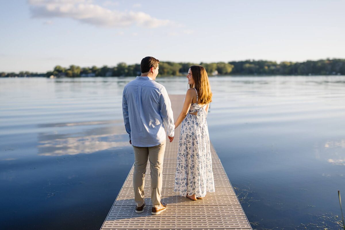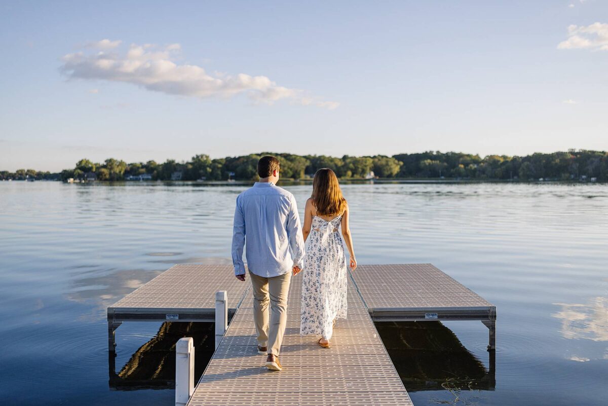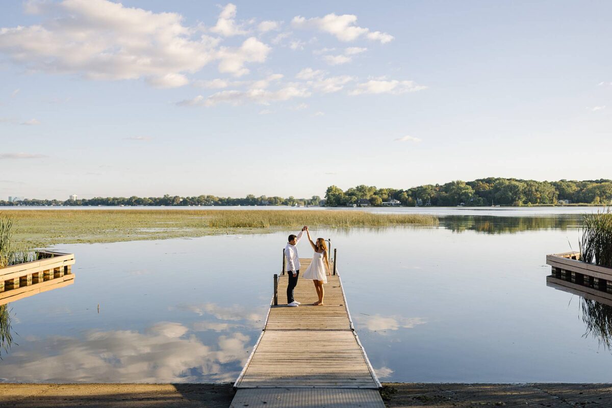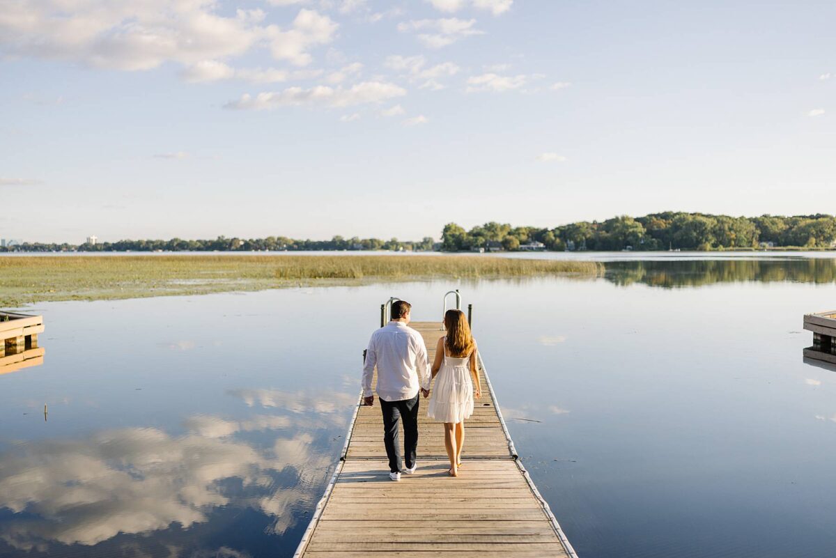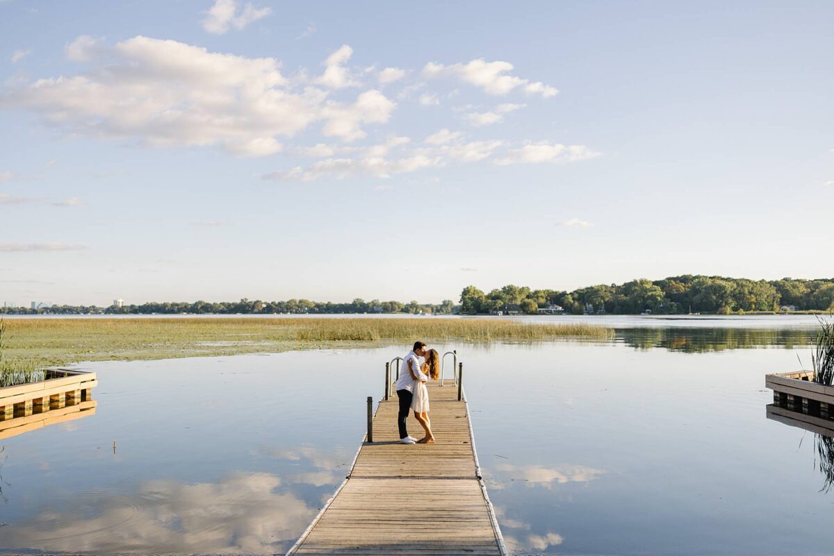Following a few portraits on the bridge, we headed for the docks overlooking the water. We had the best time chatting throughout the evening, and getting to know their story has been so much fun! They met while attending college at the University of North Dakota in Grand Forks. Friends of theirs were dating and invited them to come with to a hockey game. Little did they know it then, but Mitch would later surprise Shelby by proposing at that very same arena! Of course Shelby said yes, and the two spent the rest of the day visiting a few more of the meaningful spots in the area, officially soaking up the fall season as fiances.