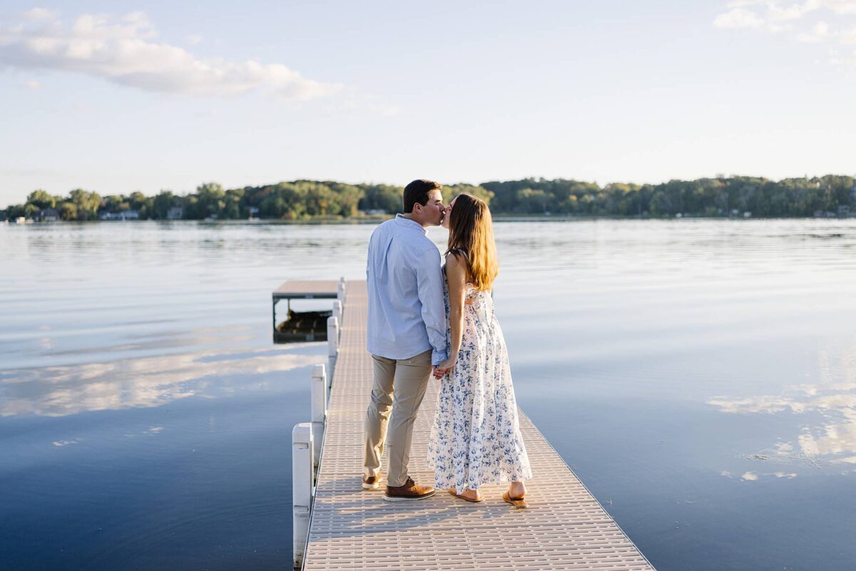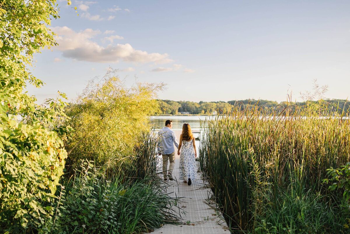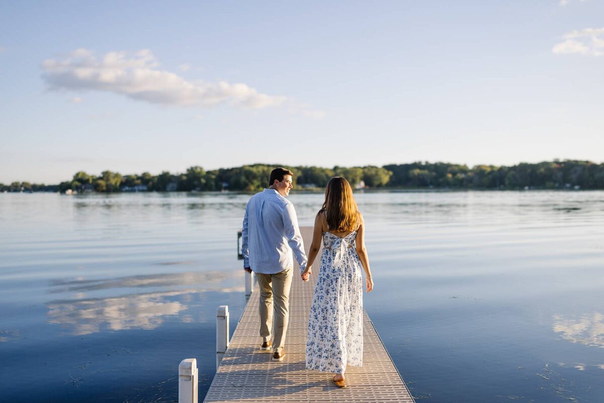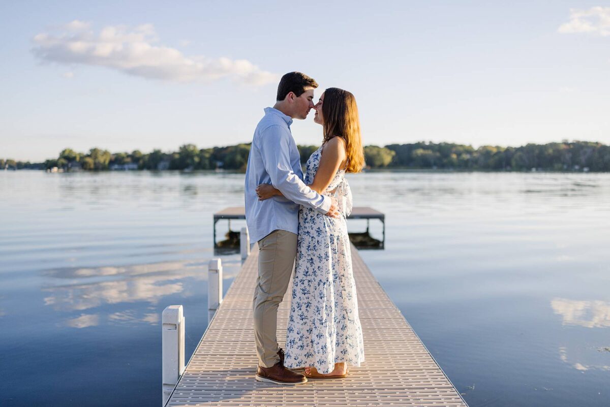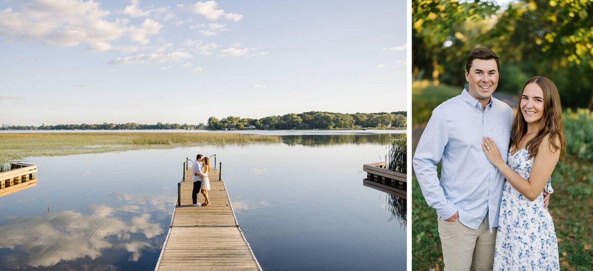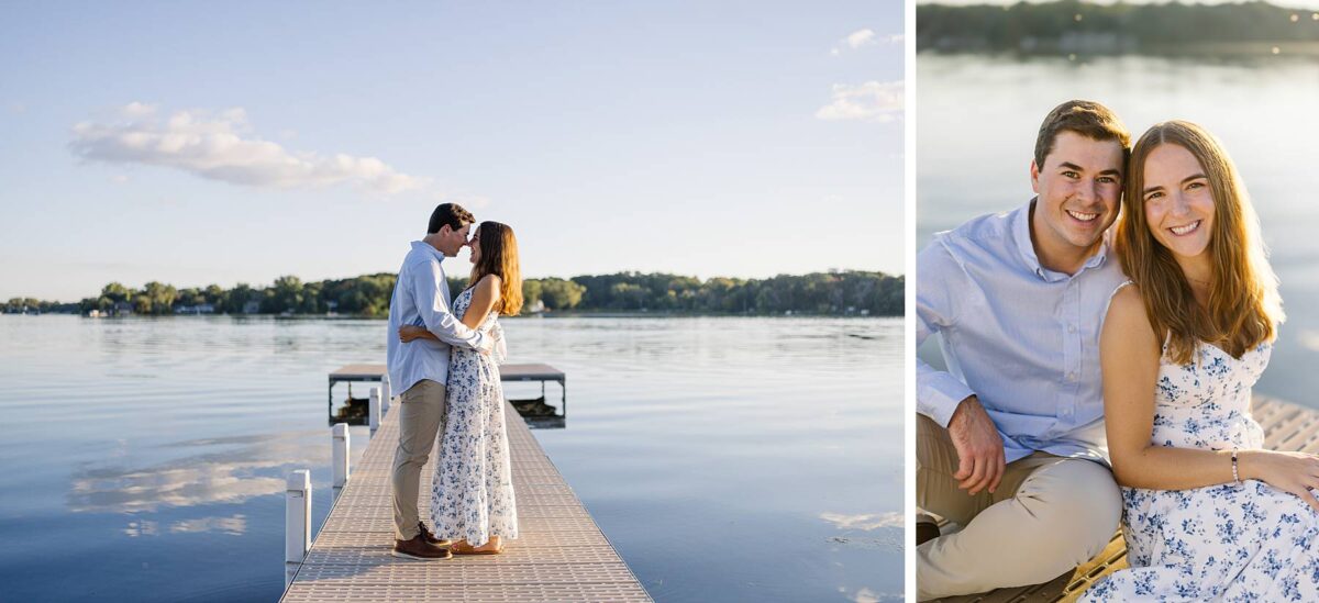 Following a few portraits on the bridge, we headed for the docks overlooking the water. We had the best time chatting throughout the evening, and getting to know their story has been so much fun! They met while attending college at the University of North Dakota in Grand Forks. Friends of theirs were dating and invited them to come with to a hockey game. Little did they know it then, but Mitch would later surprise Shelby by proposing at that very same arena! Of course Shelby said yes, and the two spent the rest of the day visiting a few more of the meaningful spots in the area, officially soaking up the fall season as fiances.