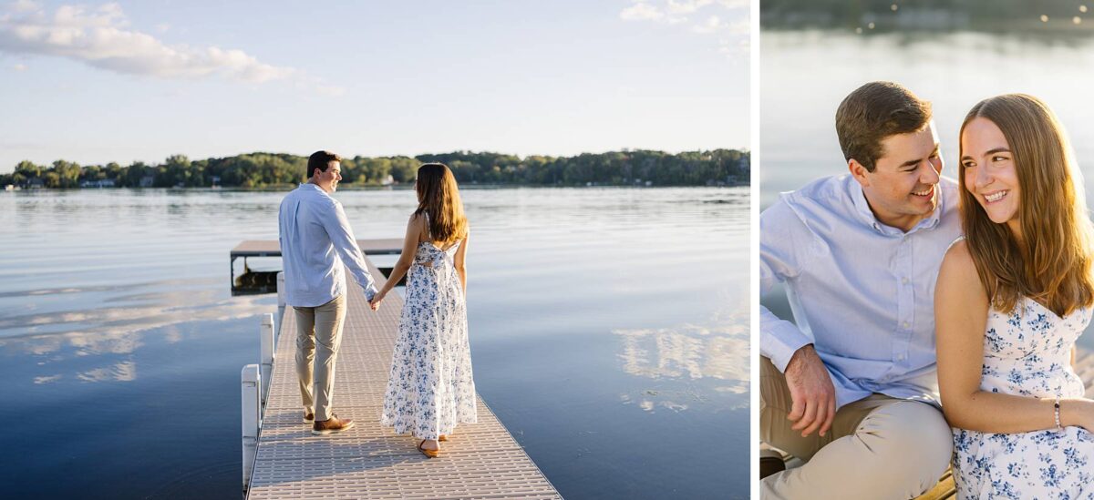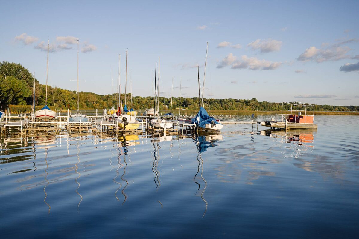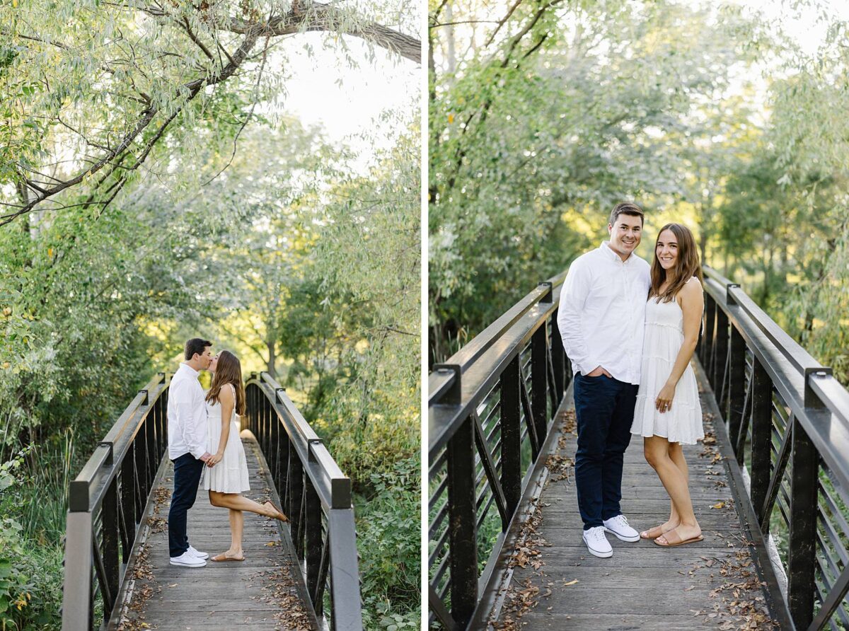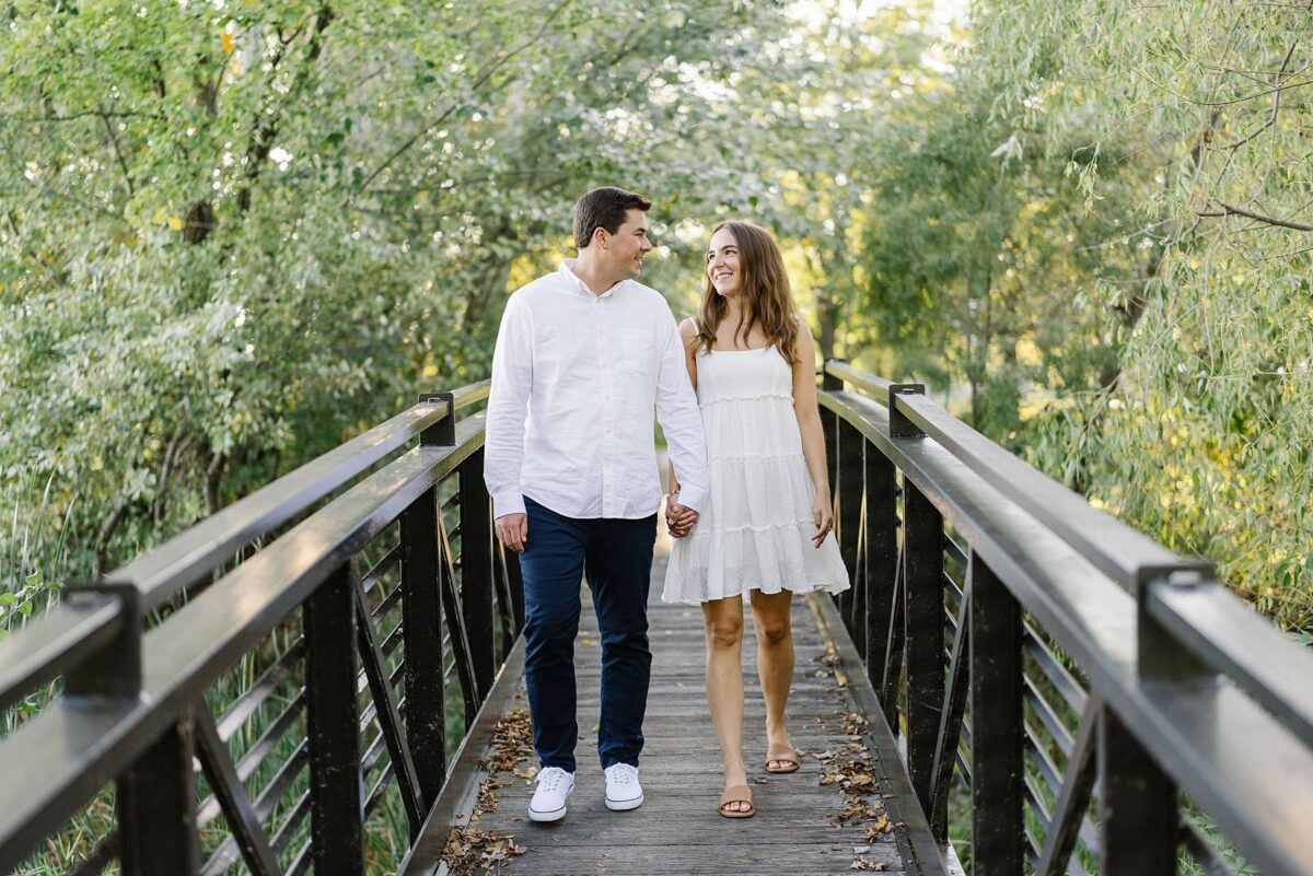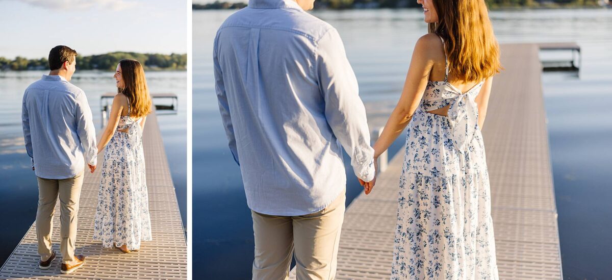 Following a few portraits on the bridge, we headed for the docks overlooking the water. We had the best time chatting throughout the evening, and getting to know their story has been so much fun! They met while attending college at the University of North Dakota in Grand Forks. Friends of theirs were dating and invited them to come with to a hockey game. Little did they know it then, but Mitch would later surprise Shelby by proposing at that very same arena! Of course Shelby said yes, and the two spent the rest of the day visiting a few more of the meaningful spots in the area, officially soaking up the fall season as fiances.