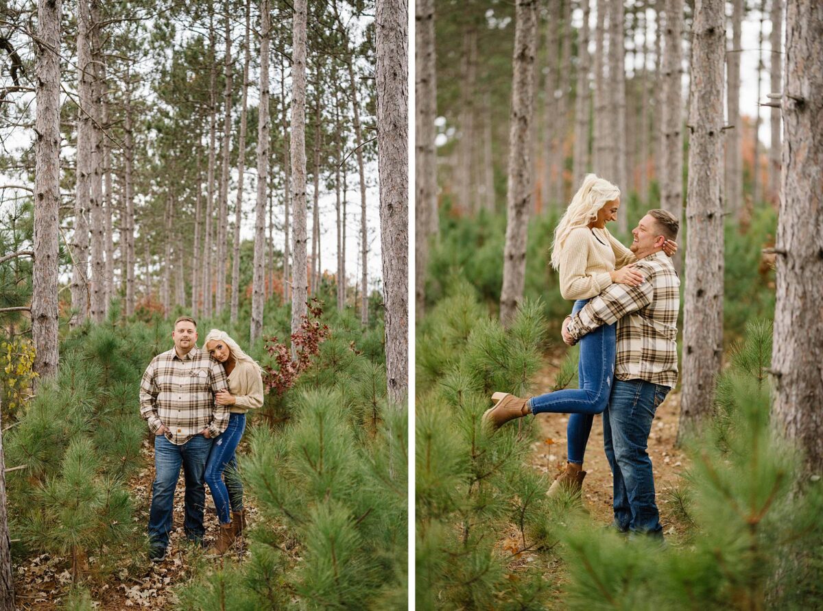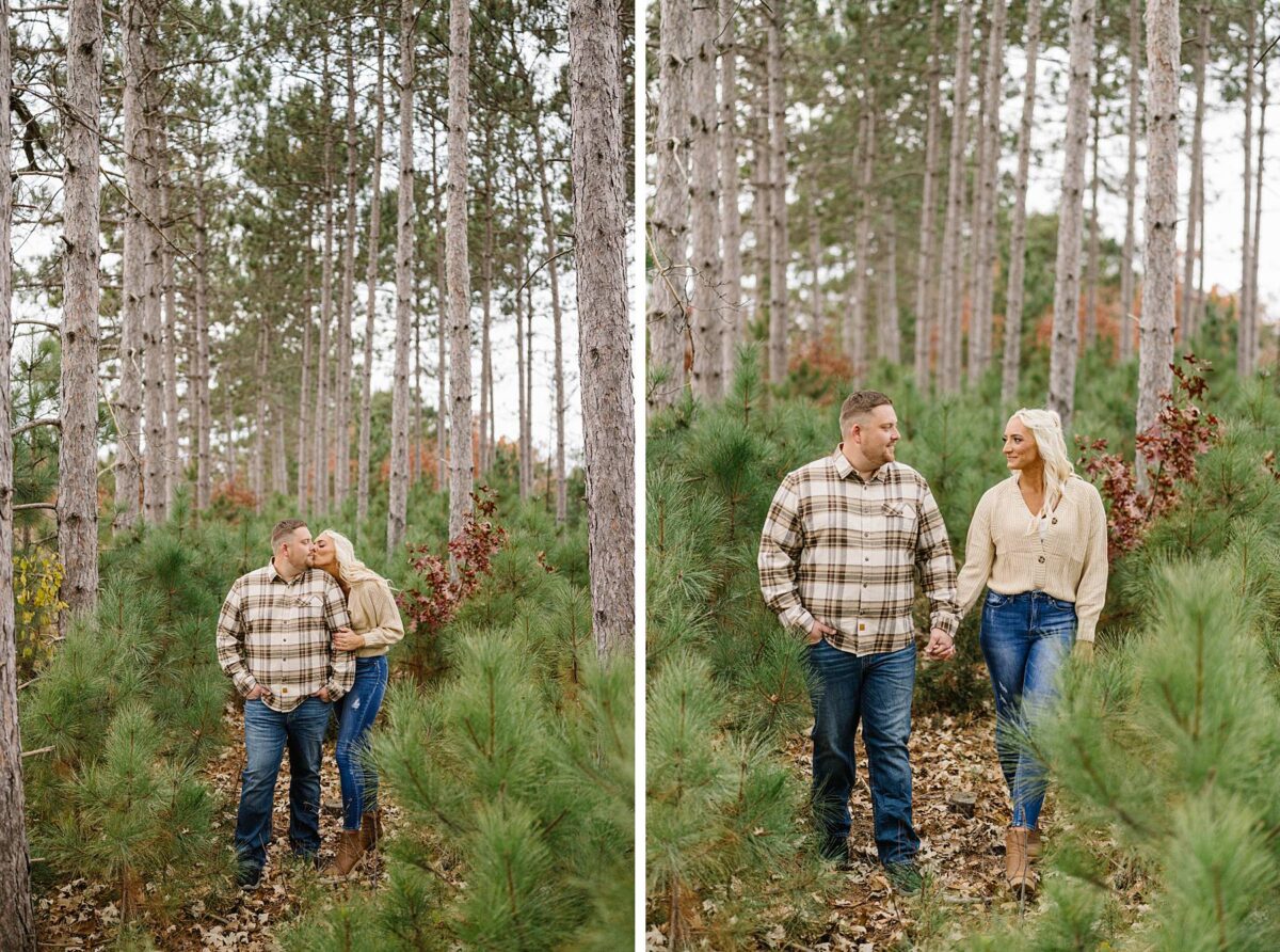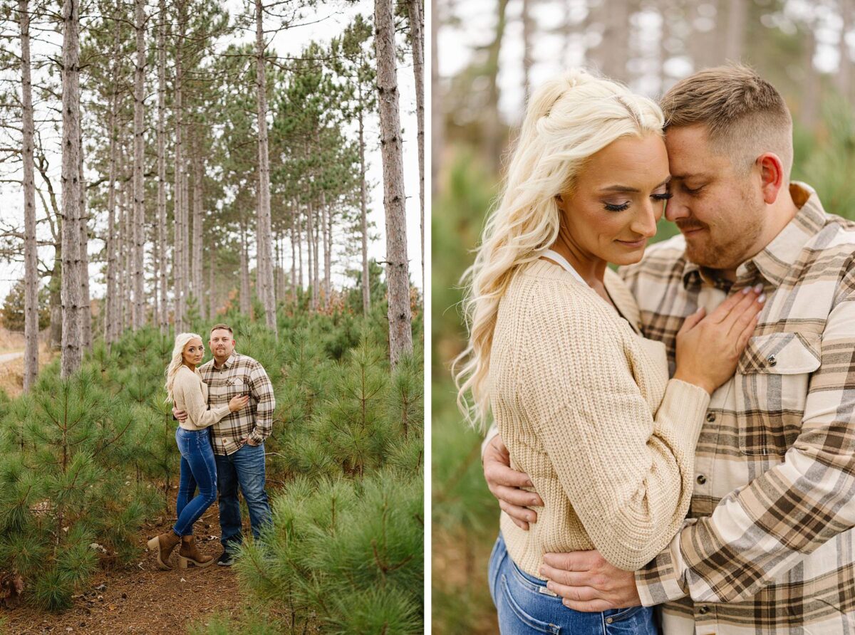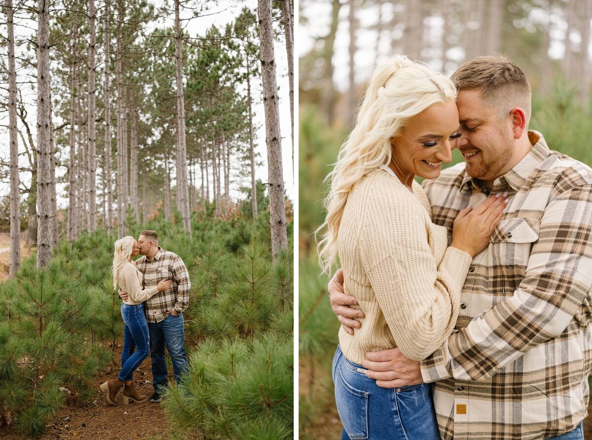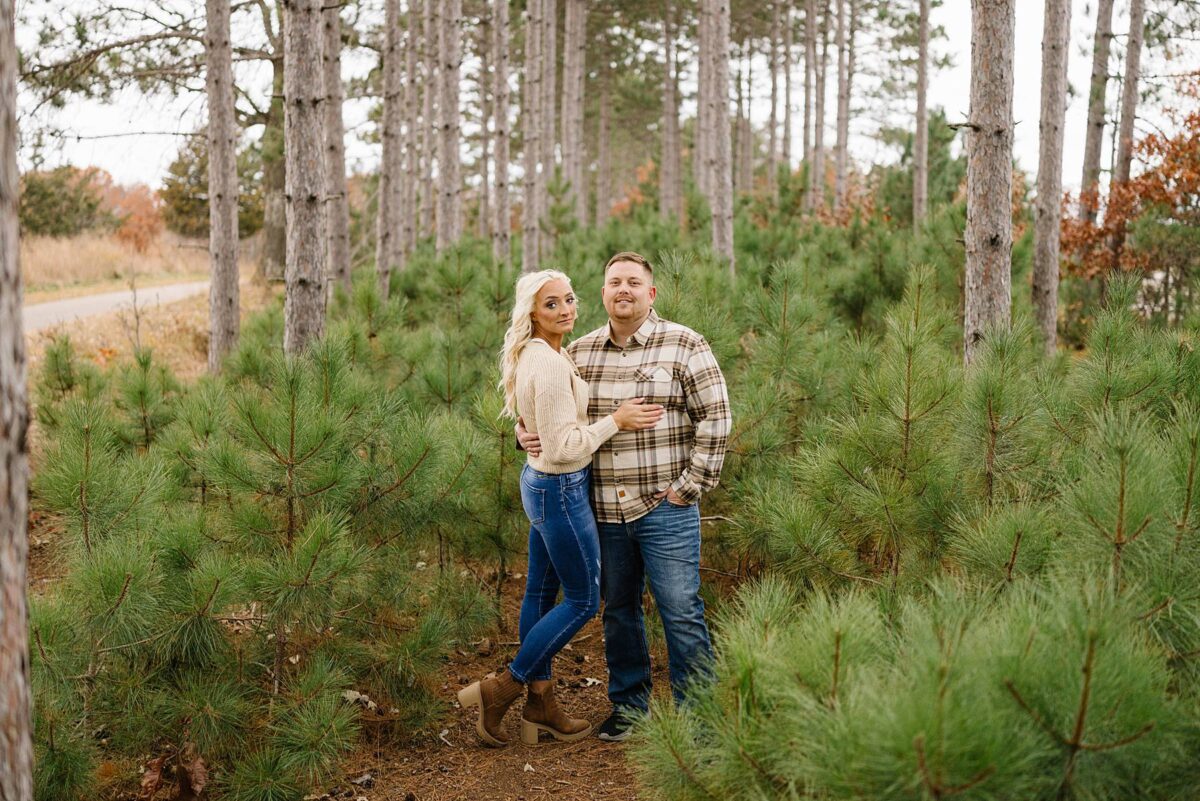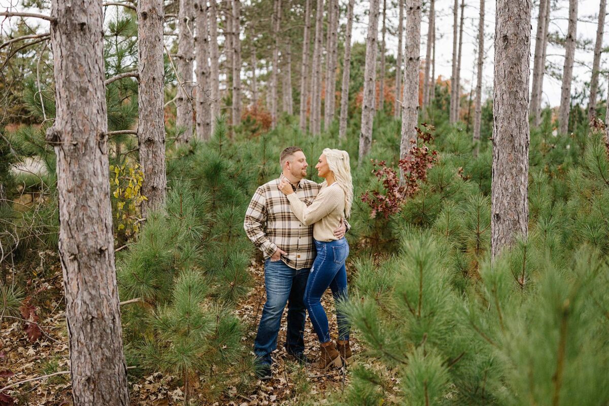 For couples planning their engagement session, I always recommend considering locations with a variety of backdrops, whether they be an urban or a more natural setting.  No matter the season, pine trees provide gorgeous texture, and year-round color – perfect for late autumn when the leaves begins to fade.  Pairing neutral outfits with the forest’s rich tones creates a timeless palette that always photographs beautifully, and Lindsey and Nick’s colors could not have been more perfect for the setting!  We had the best time with these two, and can’t wait to be a part of documenting their fall wedding at Woods & Co. Weddings + Events in Pepin!