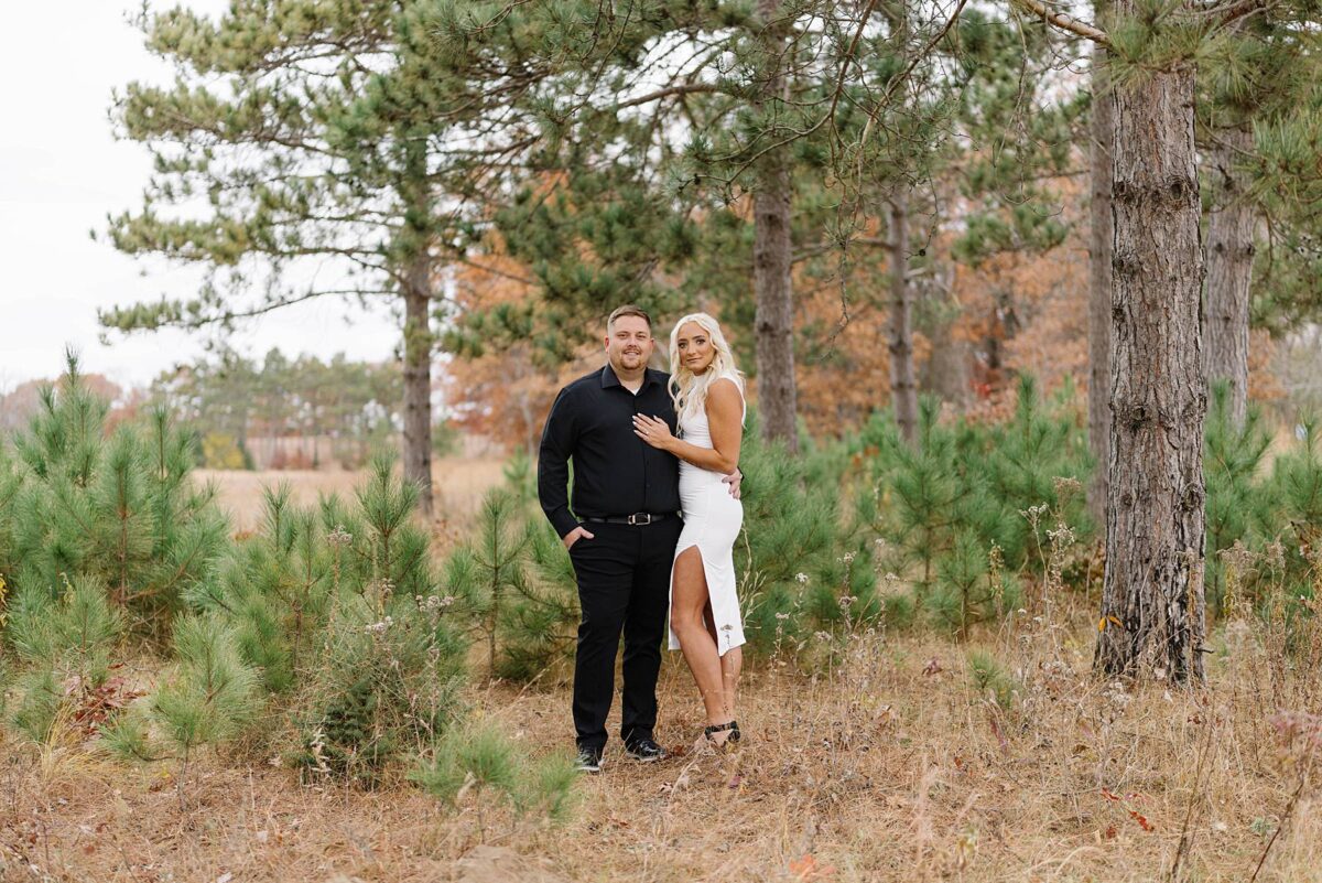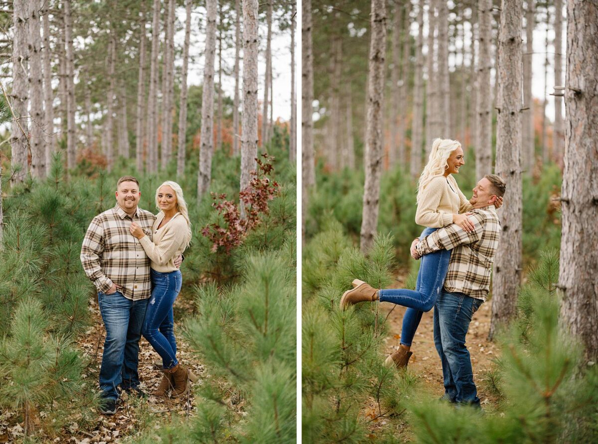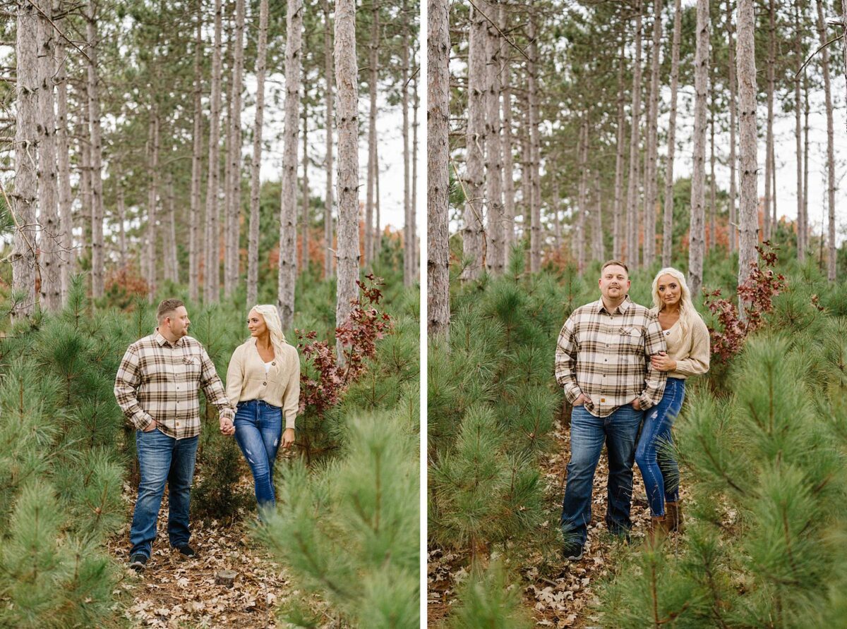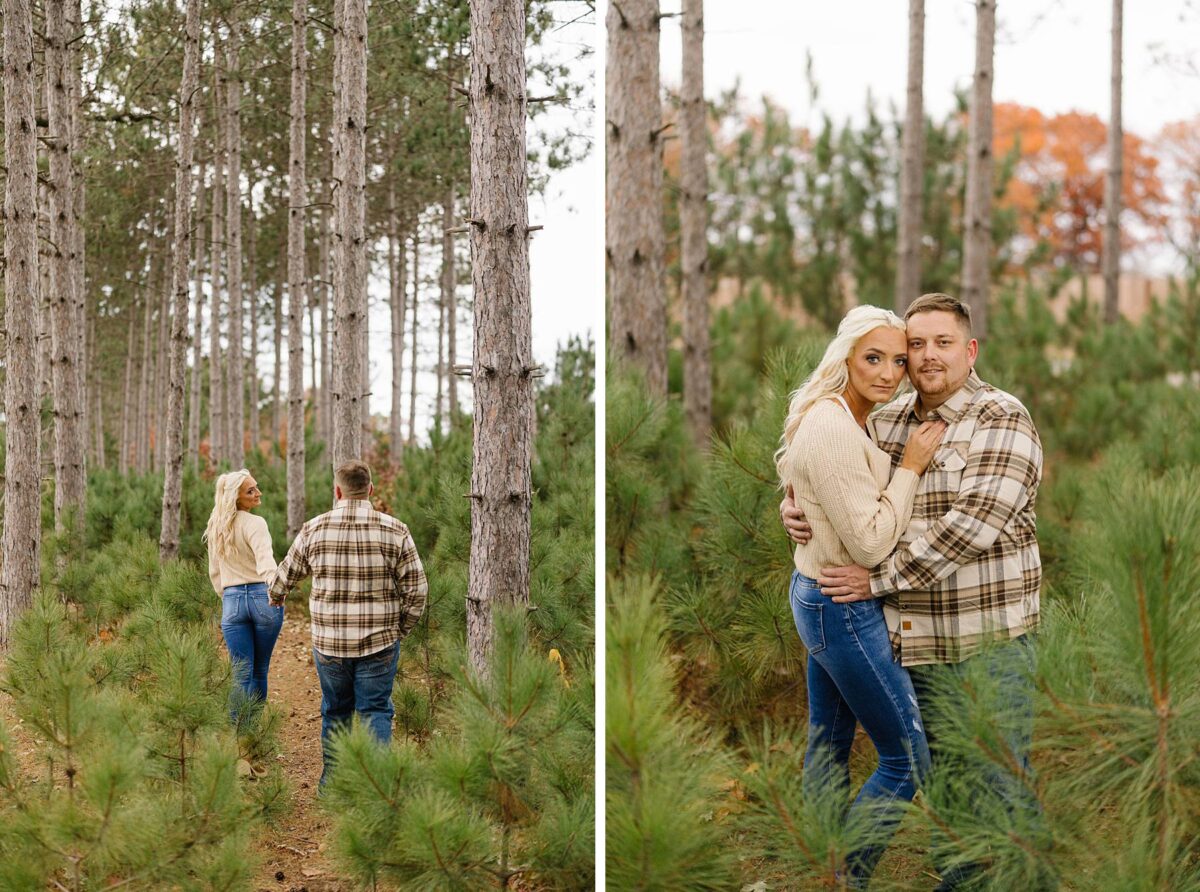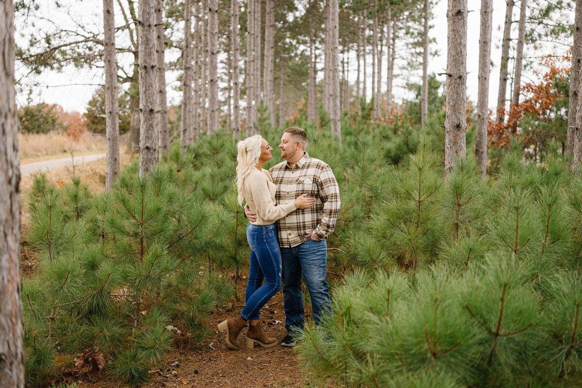 For couples planning their engagement session, I always recommend considering locations with a variety of backdrops, whether they be an urban or a more natural setting.  No matter the season, pine trees provide gorgeous texture, and year-round color – perfect for late autumn when the leaves begins to fade.  Pairing neutral outfits with the forest’s rich tones creates a timeless palette that always photographs beautifully, and Lindsey and Nick’s colors could not have been more perfect for the setting!  We had the best time with these two, and can’t wait to be a part of documenting their fall wedding at Woods & Co. Weddings + Events in Pepin!