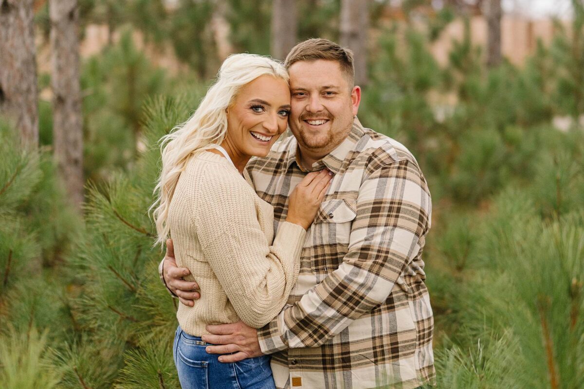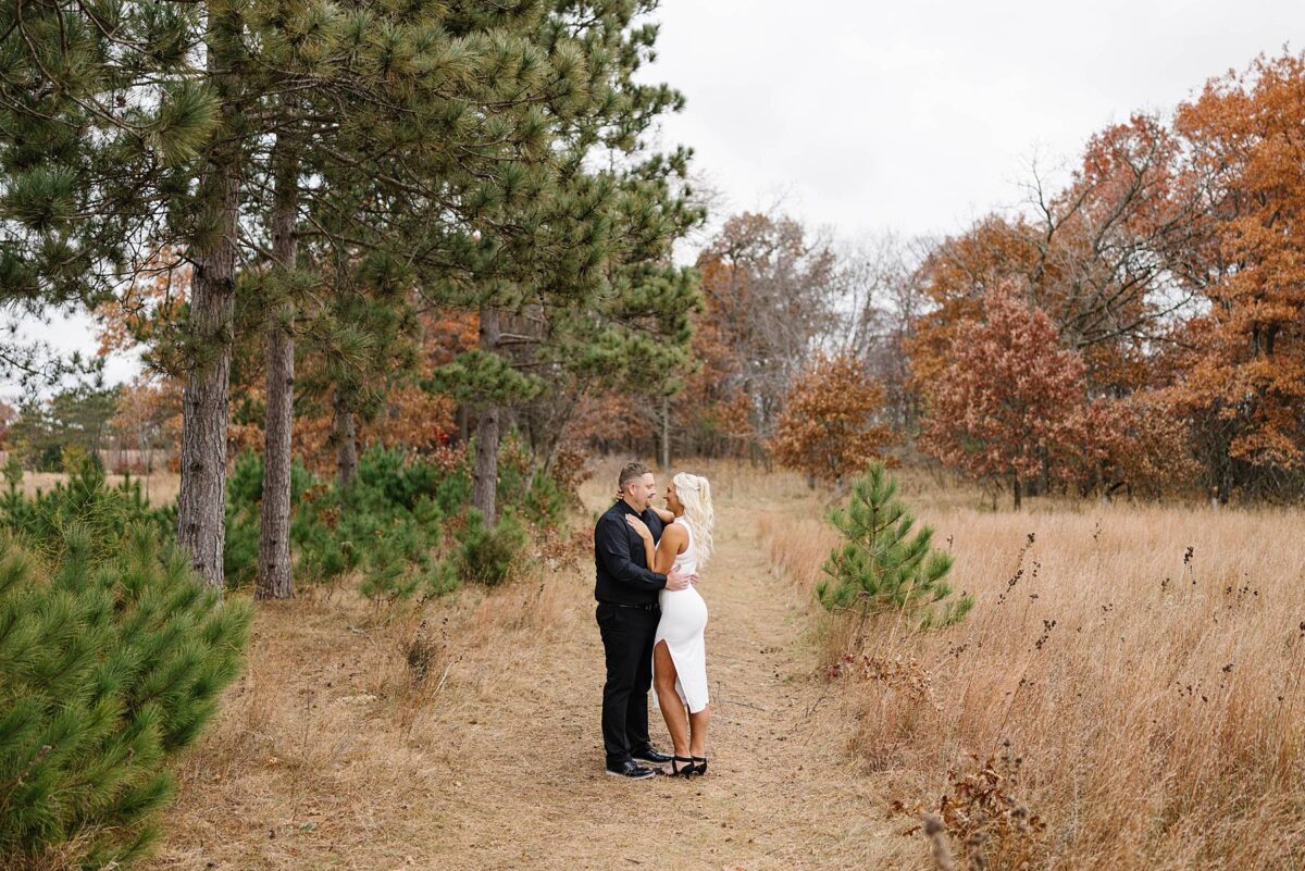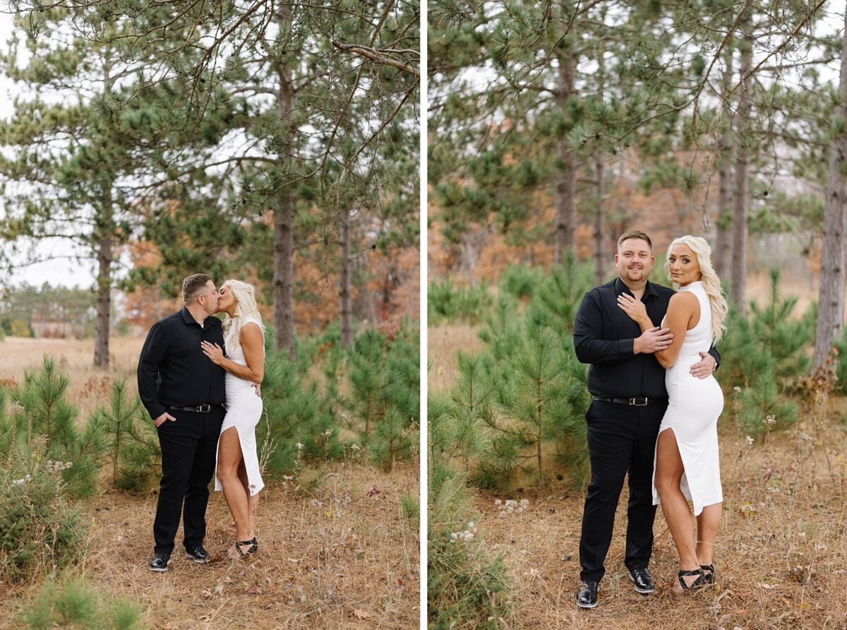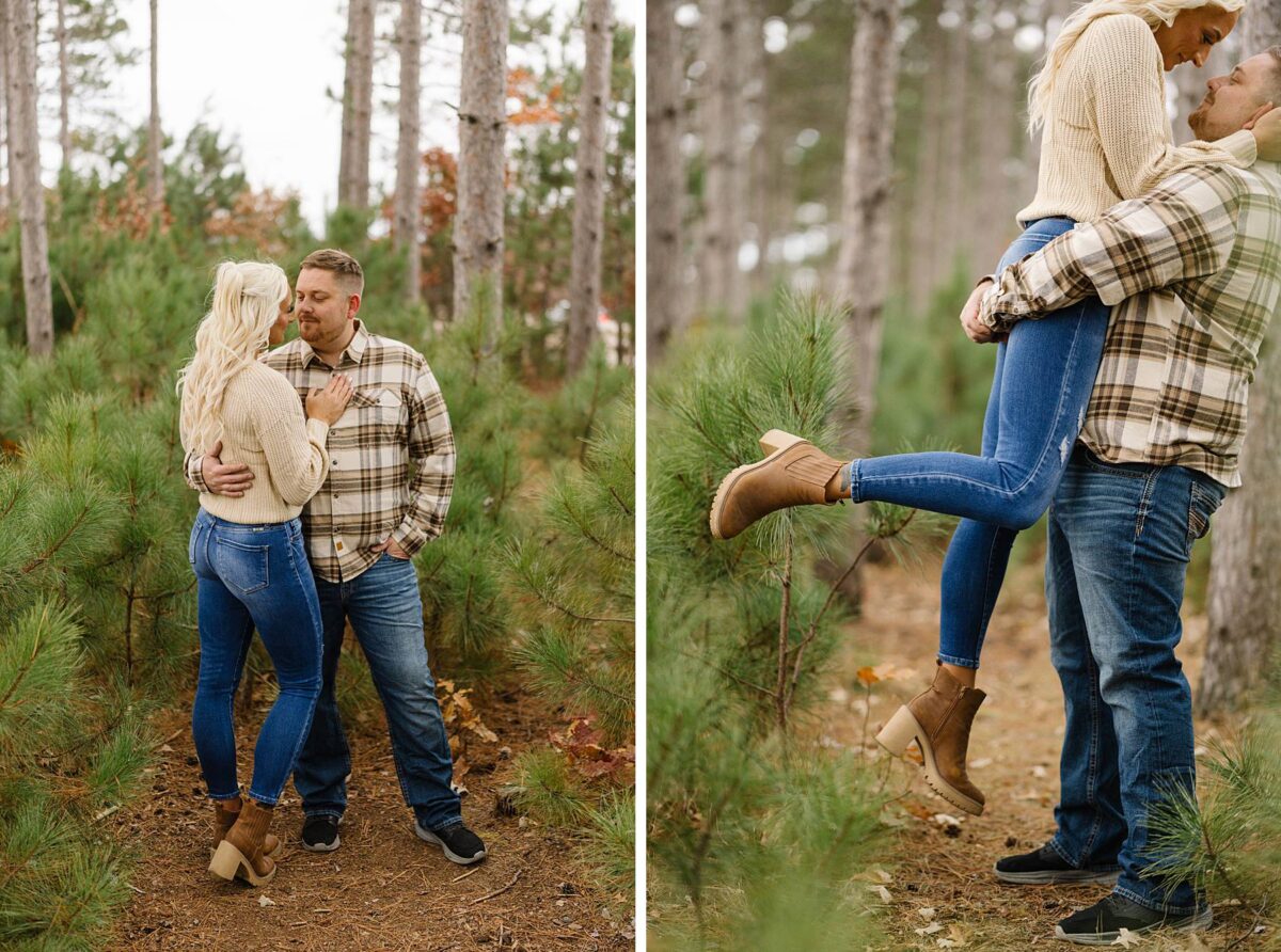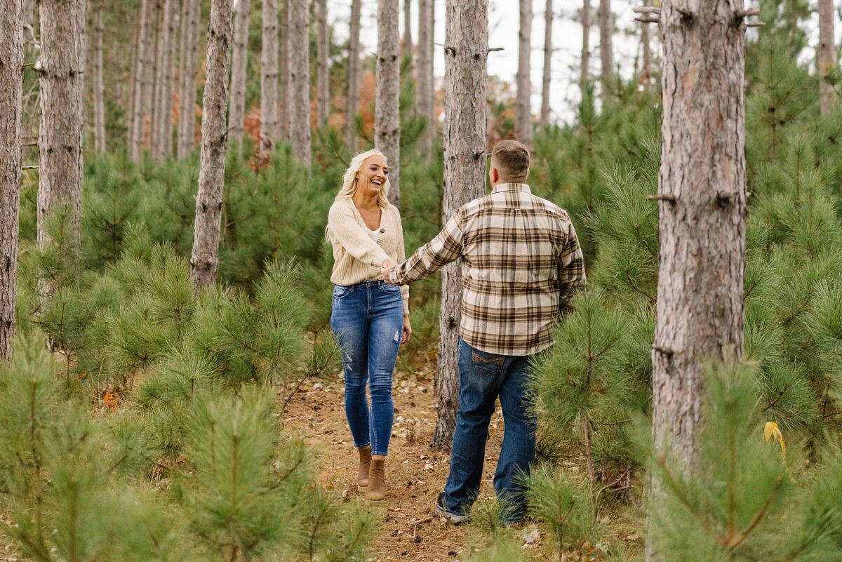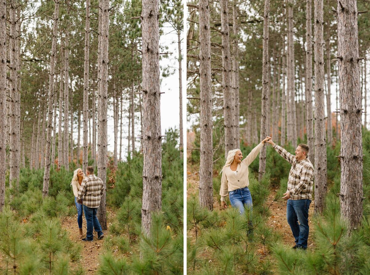 For couples planning their engagement session, I always recommend considering locations with a variety of backdrops, whether they be an urban or a more natural setting.  No matter the season, pine trees provide gorgeous texture, and year-round color – perfect for late autumn when the leaves begins to fade.  Pairing neutral outfits with the forest’s rich tones creates a timeless palette that always photographs beautifully, and Lindsey and Nick’s colors could not have been more perfect for the setting!  We had the best time with these two, and can’t wait to be a part of documenting their fall wedding at Woods & Co. Weddings + Events in Pepin!