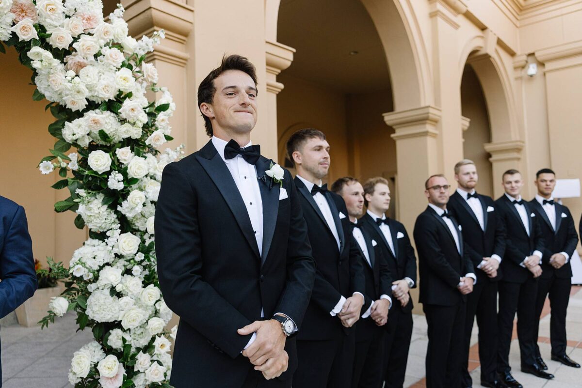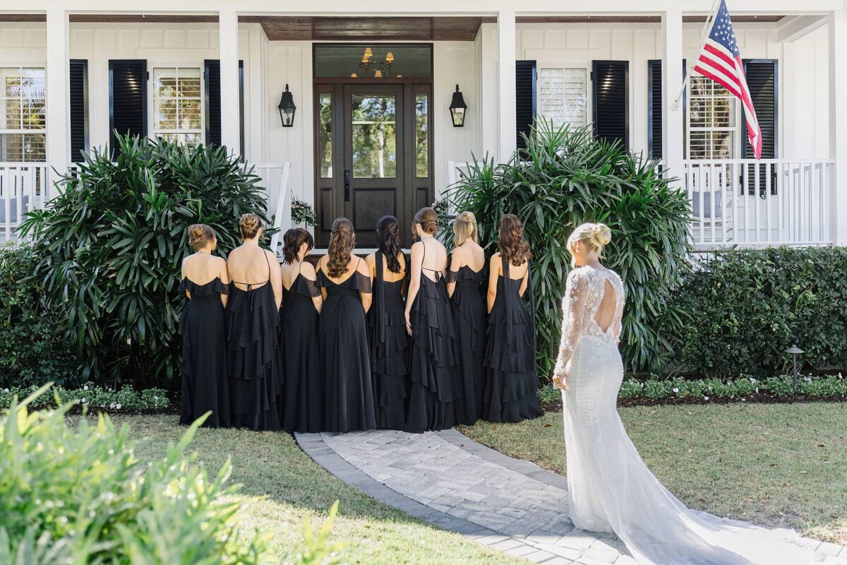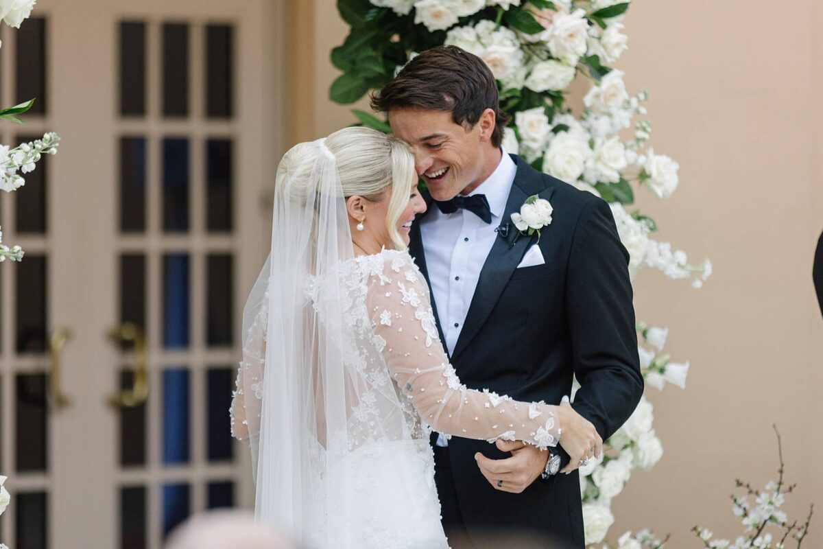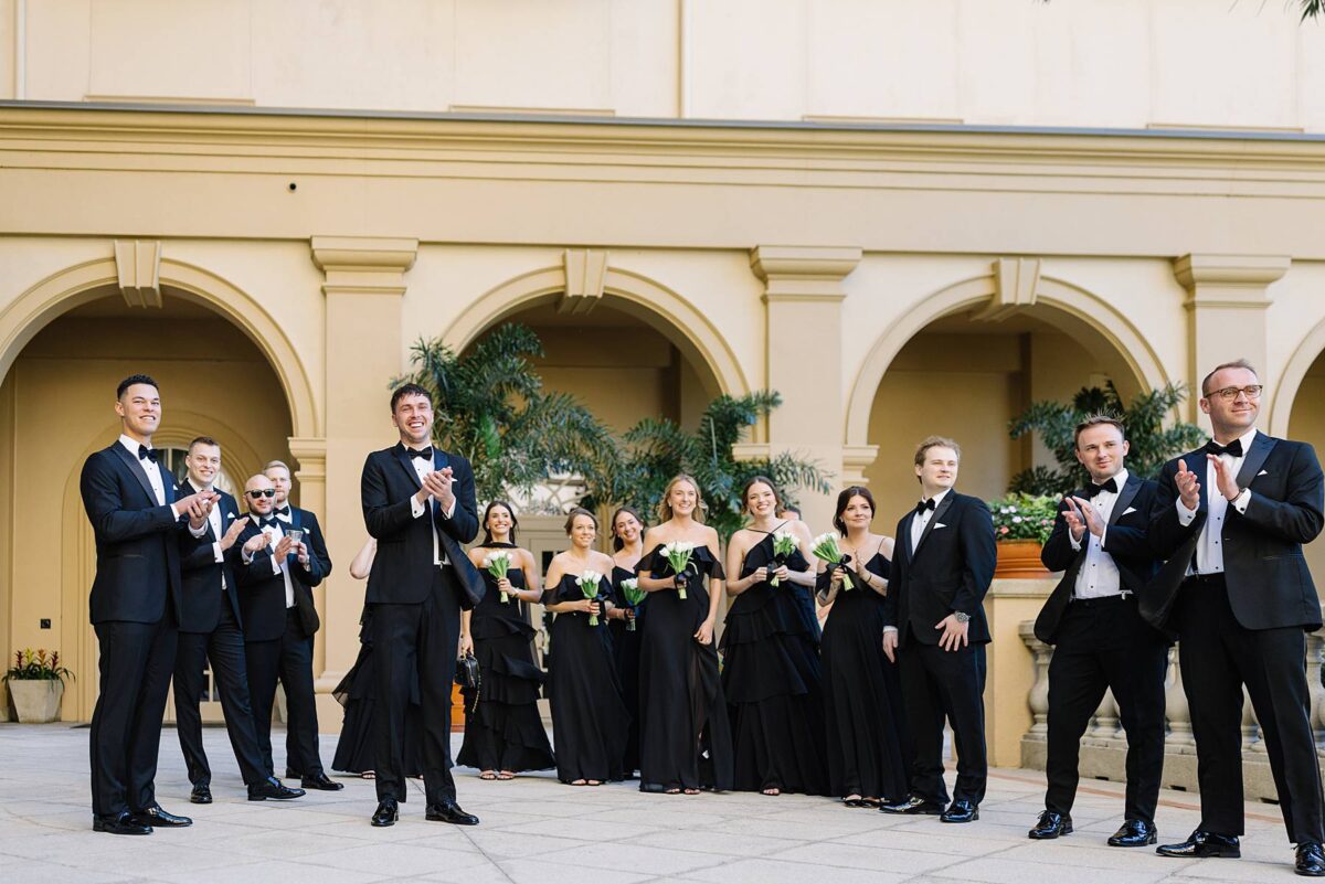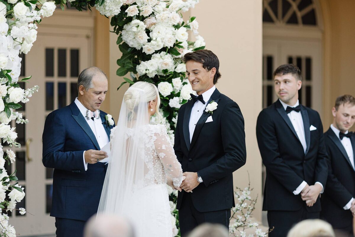 We began the morning by documenting the details including invitations by The Paper Merchant as the ladies prepared with Unbreakable Beauty on hair and makeup. Julia put on her gorgeous Beccar gown from Palm Bridal and headed to the Ritz for the sweetest first look with her groom! The tears began as Cooper turned to see his beautiful bride, and we set off to explore the grounds together for portraits. The wedding party joined us for photos, looking stunning in their Jenny Yoo dresses and suits from The Tuxxman, and we finished up with family portraits before guests arrived.