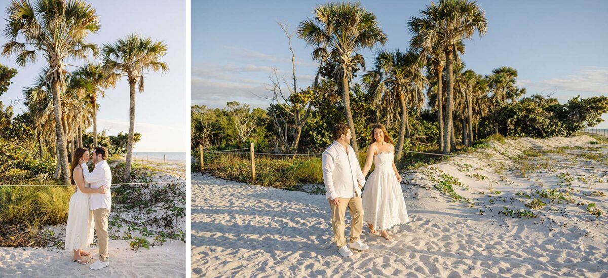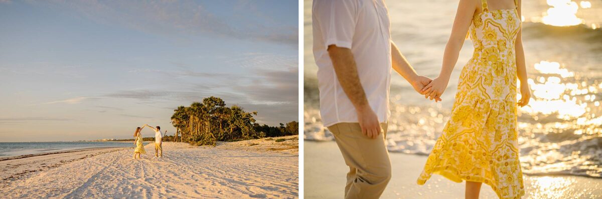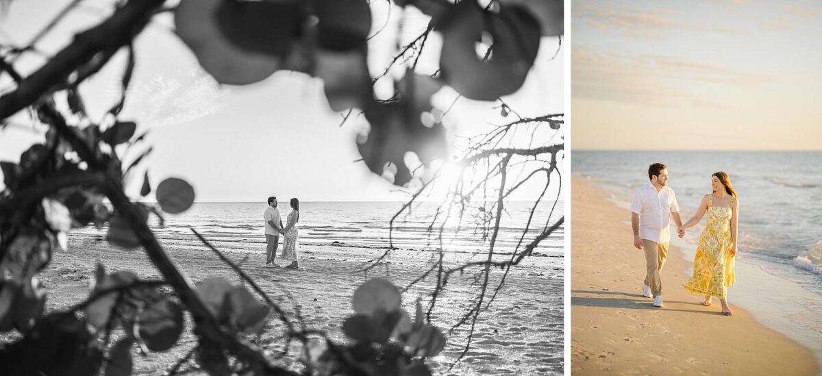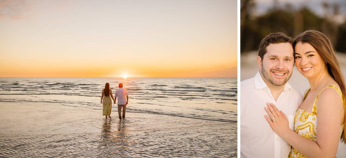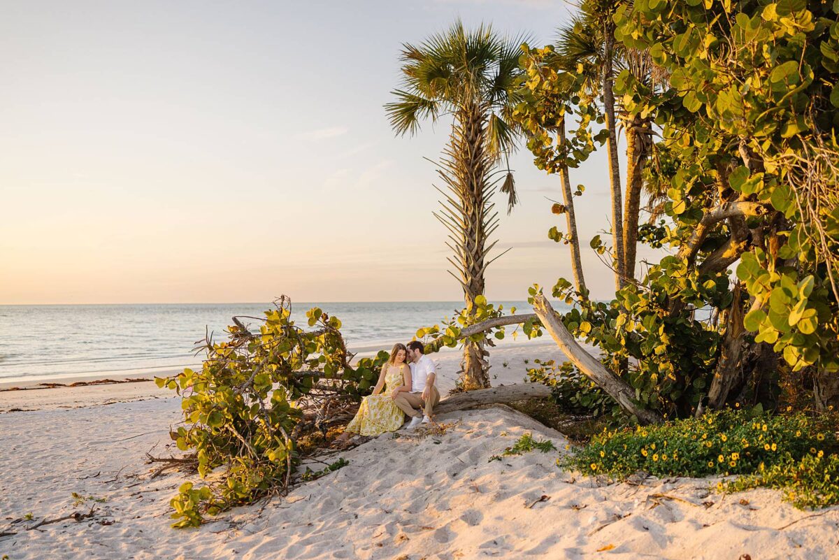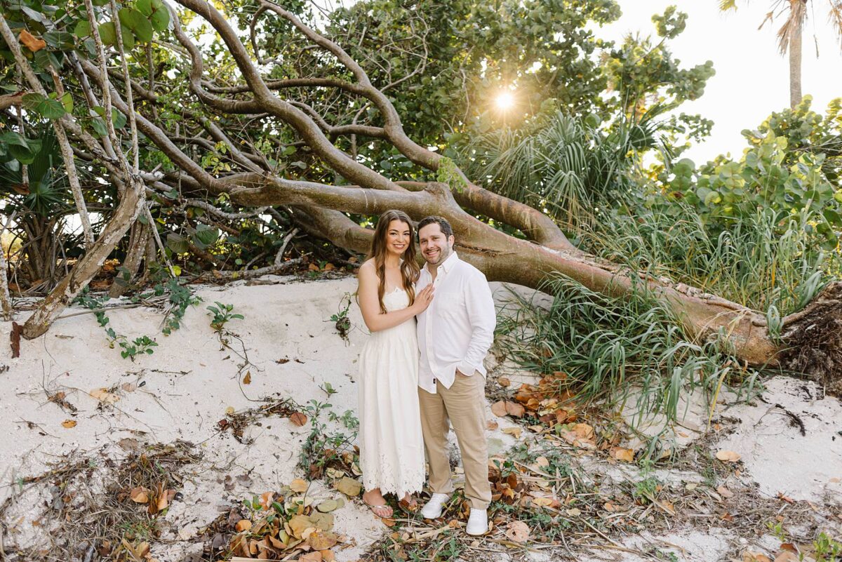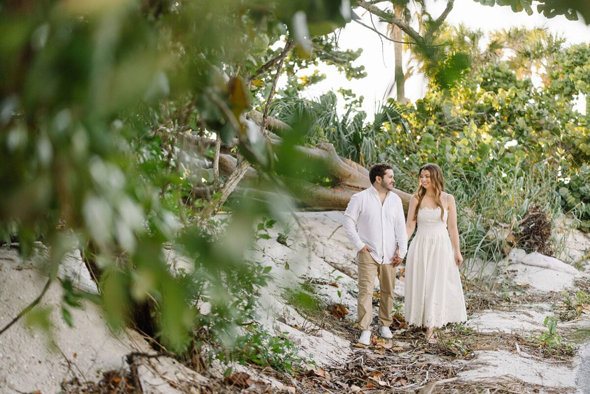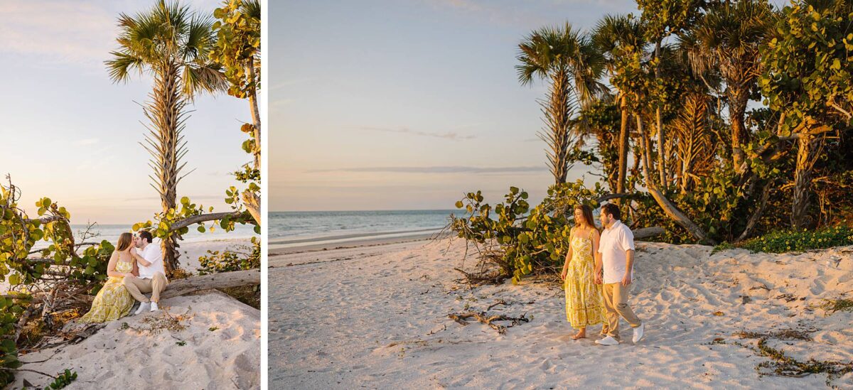 We still remember our first visit to Delnor-Wiggins Pass State Park and could have never imagined we would be documenting engagement sessions on its shoreline now over a decade later. From the moment we arrived and stepped out onto the sand, the evening felt effortless. After capturing a few photos surrounded by the trees, we set off to explore the beach. Golden hour was absolute perfection, creating a dreamy backdrop for portraits, and these two looked amazing in their soft, neutral tones. Elana’s outfits were perfect for the setting! Her white lace dress felt timeless and romantic, while her yellow floral dress added a gorgeous pop of color that fit the scene beautifully! We loved that she tied in colors from their wedding day, making the session feel even more personal and meaningful.