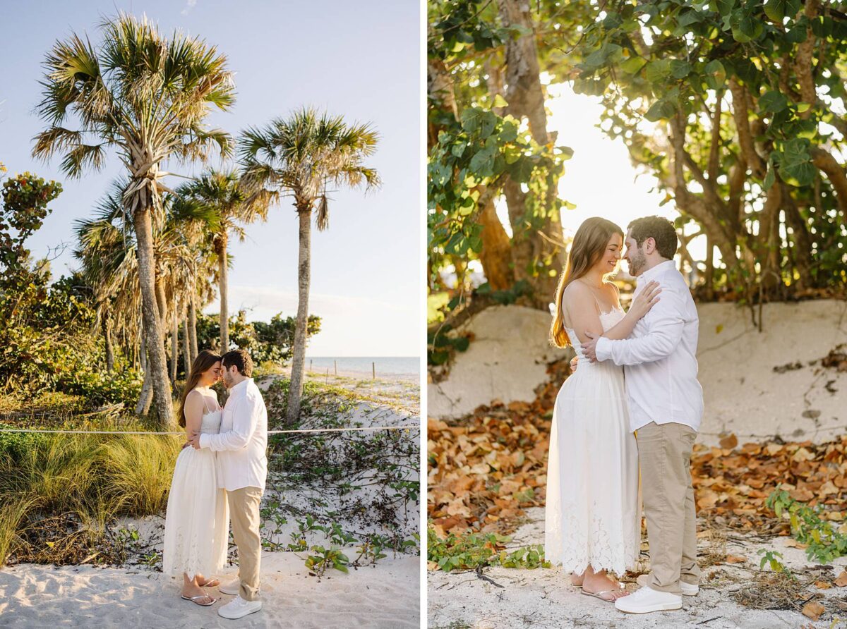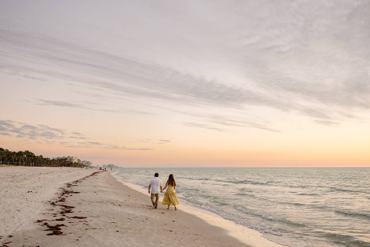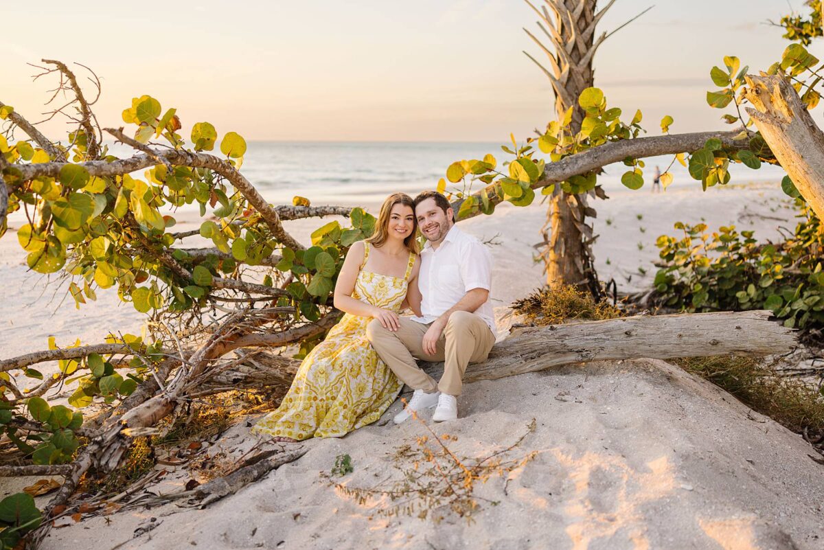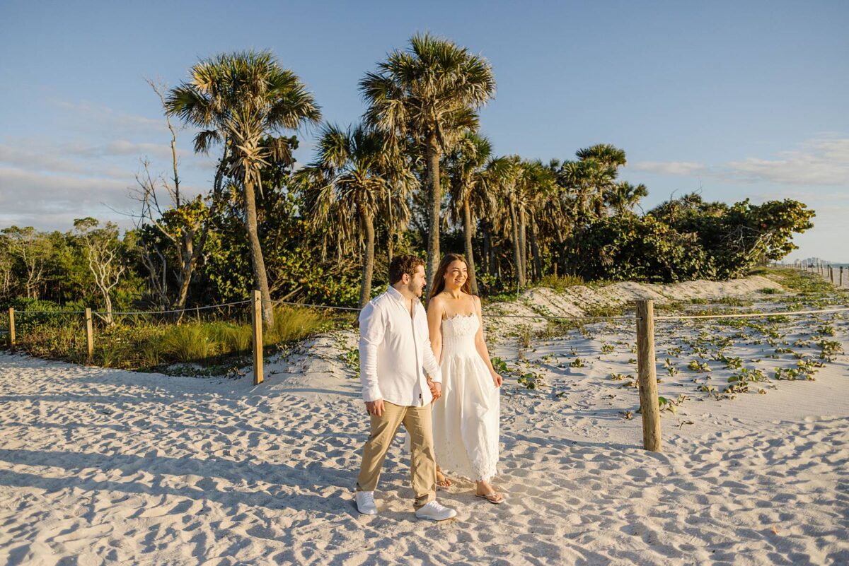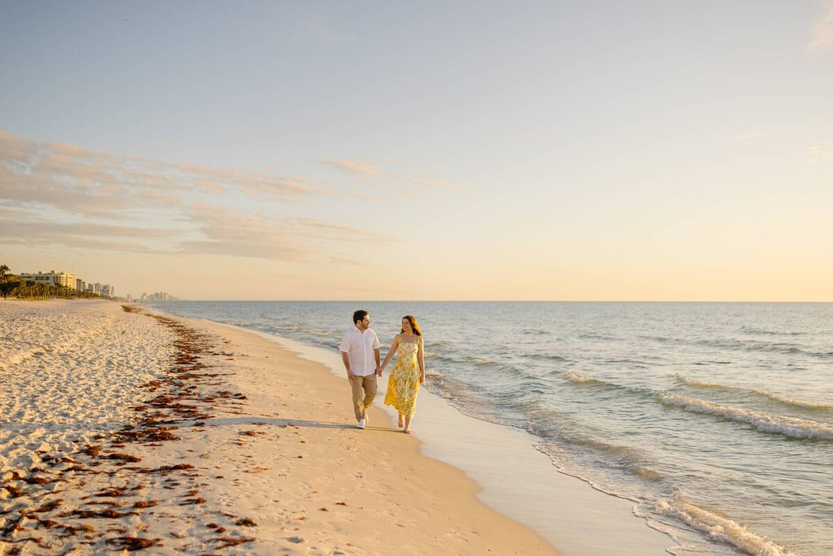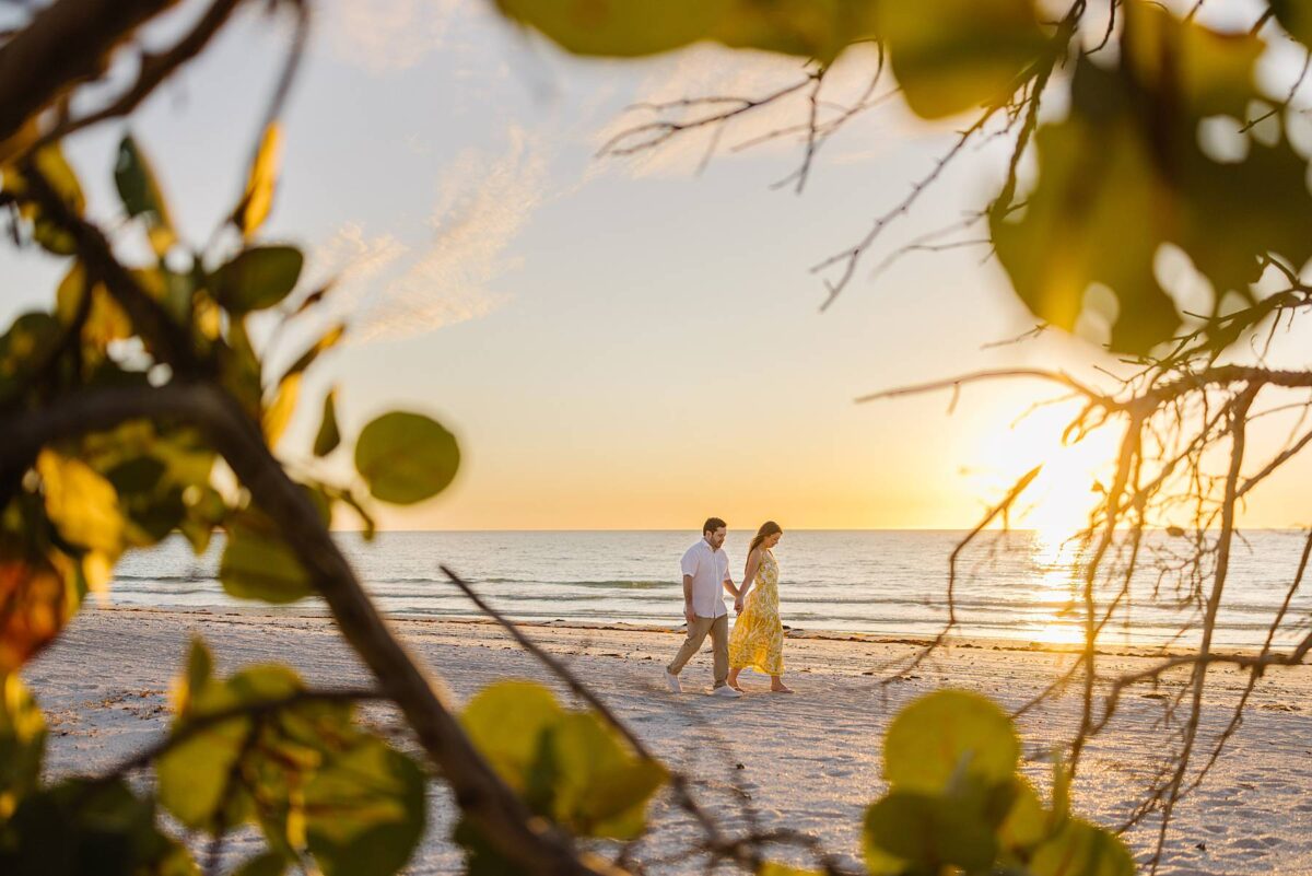 We still remember our first visit to Delnor-Wiggins Pass State Park and could have never imagined we would be documenting engagement sessions on its shoreline now over a decade later. From the moment we arrived and stepped out onto the sand, the evening felt effortless. After capturing a few photos surrounded by the trees, we set off to explore the beach. Golden hour was absolute perfection, creating a dreamy backdrop for portraits, and these two looked amazing in their soft, neutral tones. Elana’s outfits were perfect for the setting! Her white lace dress felt timeless and romantic, while her yellow floral dress added a gorgeous pop of color that fit the scene beautifully! We loved that she tied in colors from their wedding day, making the session feel even more personal and meaningful.