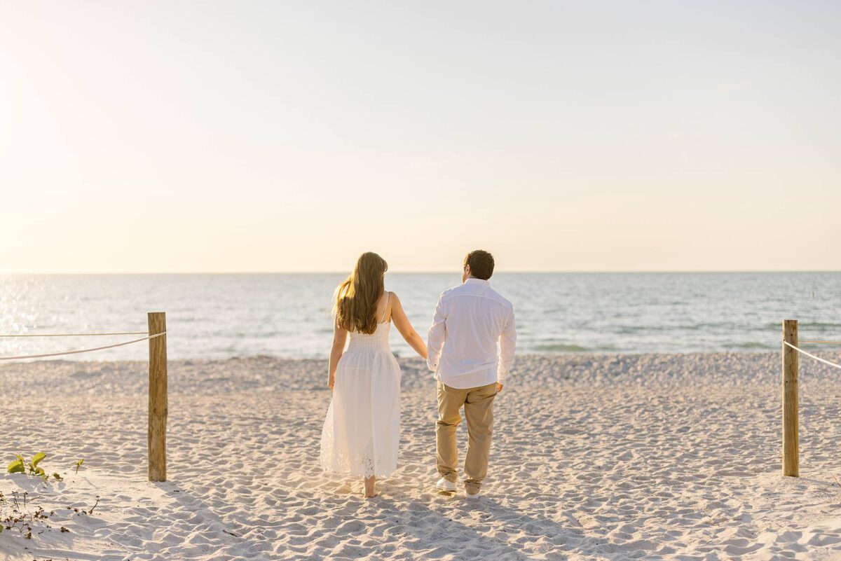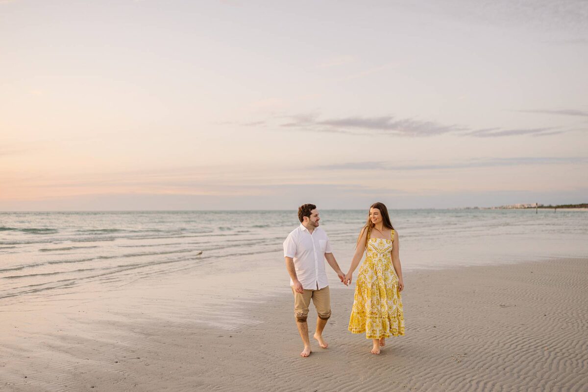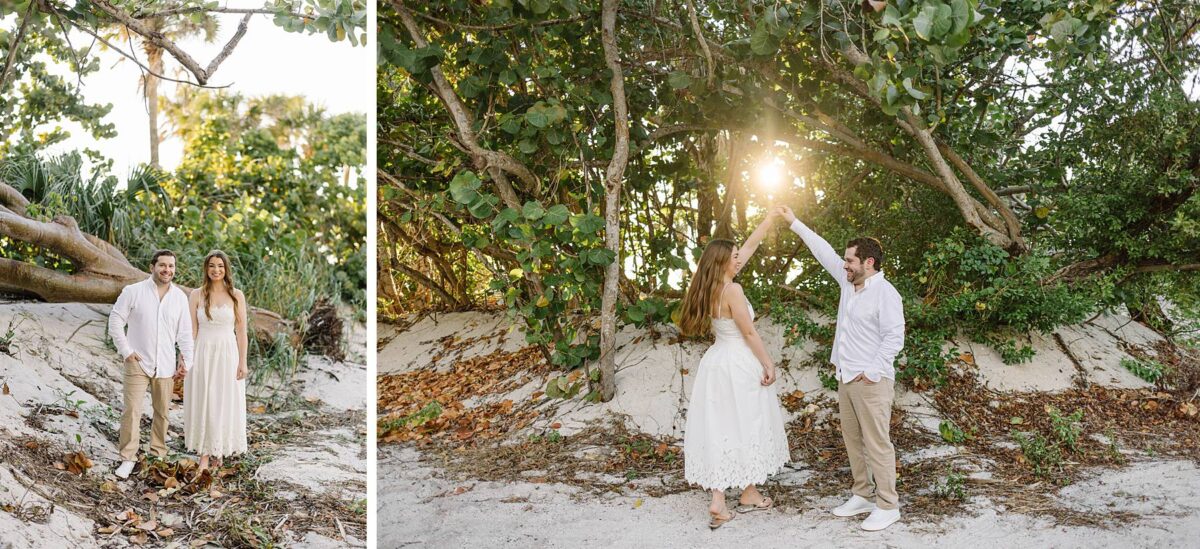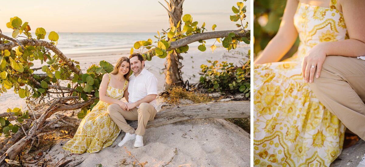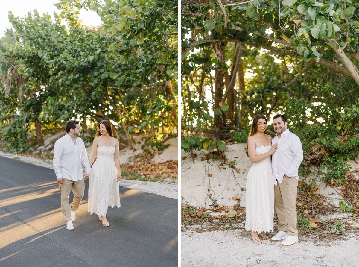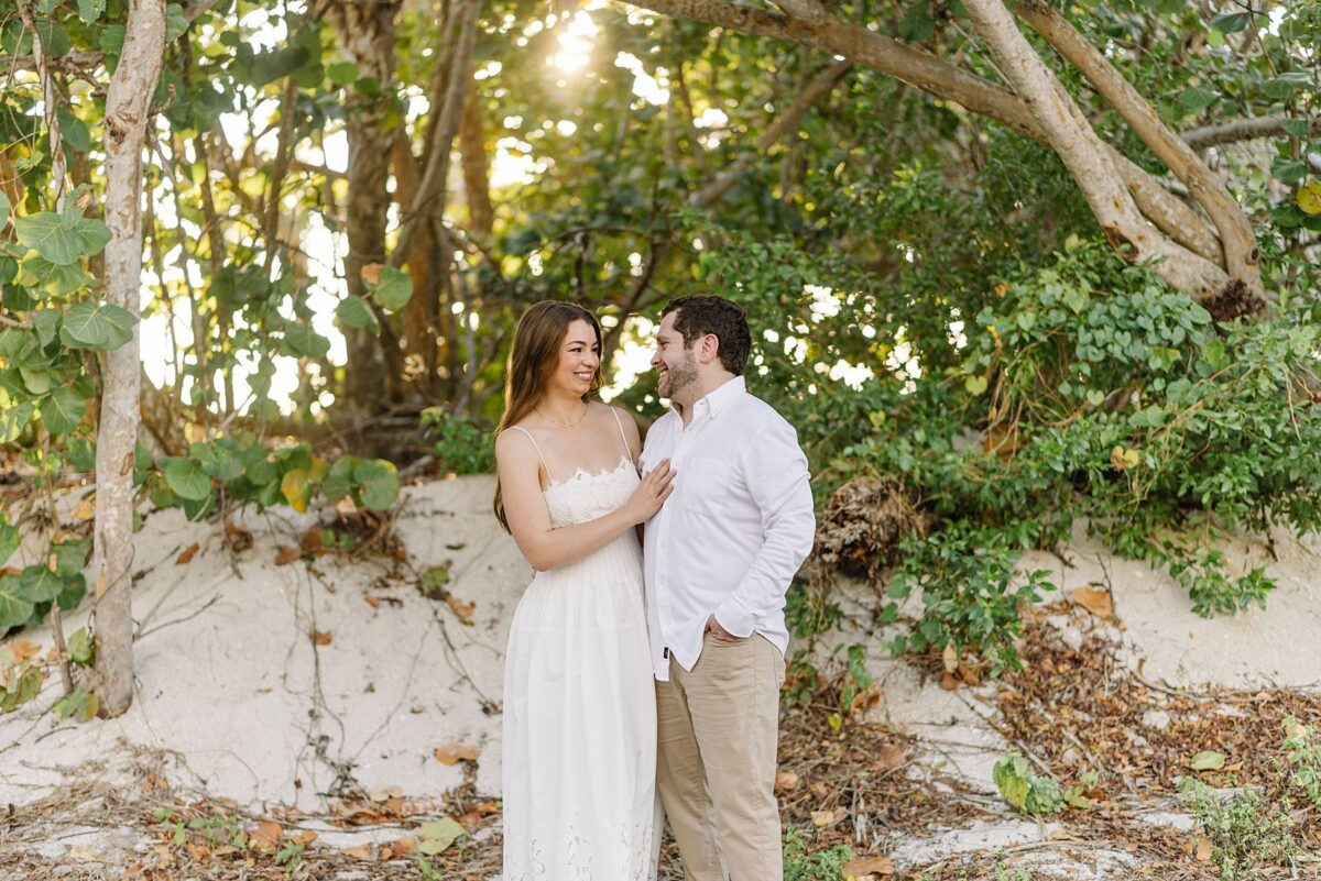 We still remember our first visit to Delnor-Wiggins Pass State Park and could have never imagined we would be documenting engagement sessions on its shoreline now over a decade later. From the moment we arrived and stepped out onto the sand, the evening felt effortless. After capturing a few photos surrounded by the trees, we set off to explore the beach. Golden hour was absolute perfection, creating a dreamy backdrop for portraits, and these two looked amazing in their soft, neutral tones. Elana’s outfits were perfect for the setting! Her white lace dress felt timeless and romantic, while her yellow floral dress added a gorgeous pop of color that fit the scene beautifully! We loved that she tied in colors from their wedding day, making the session feel even more personal and meaningful.