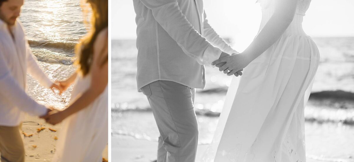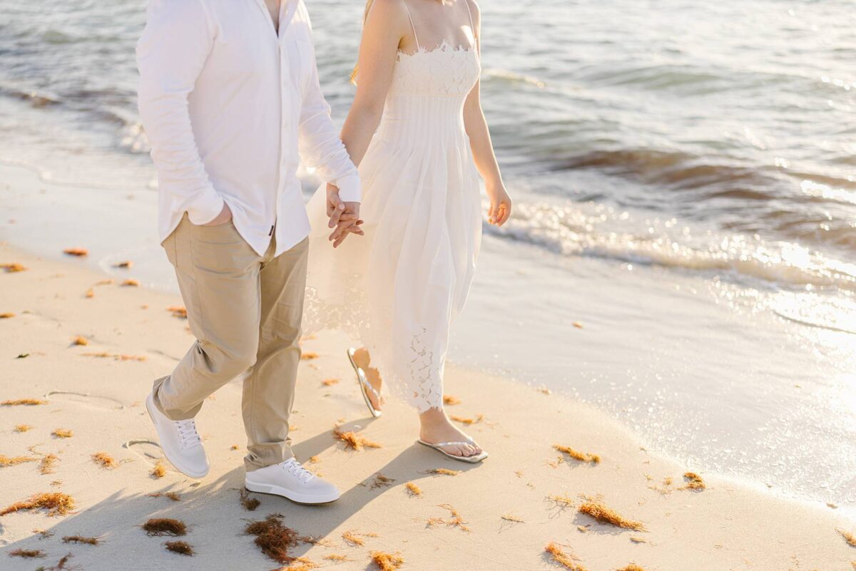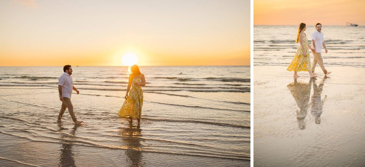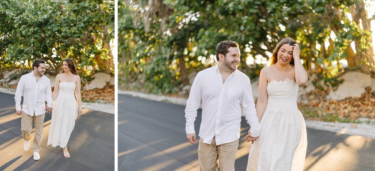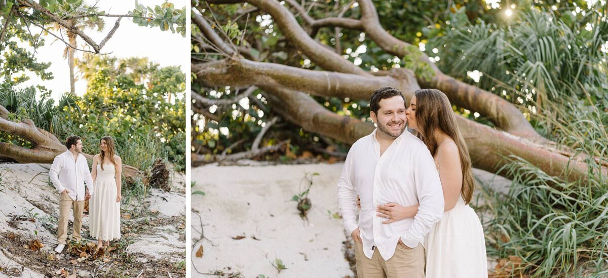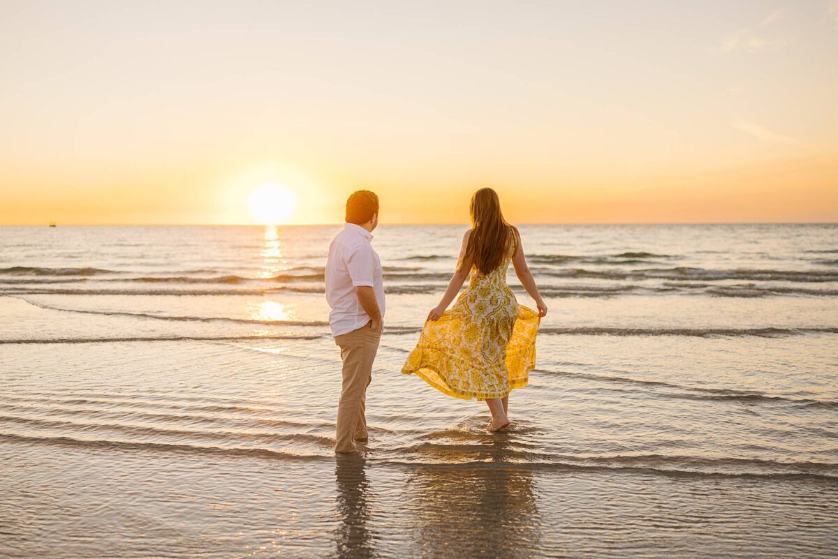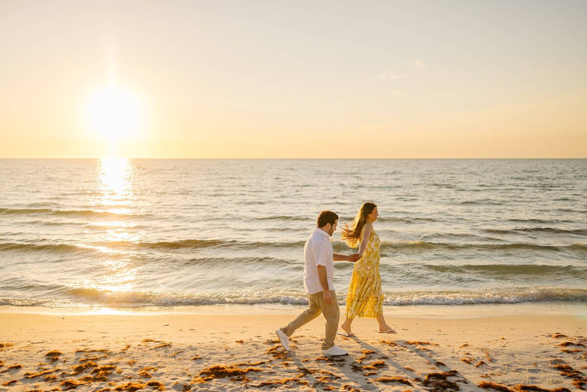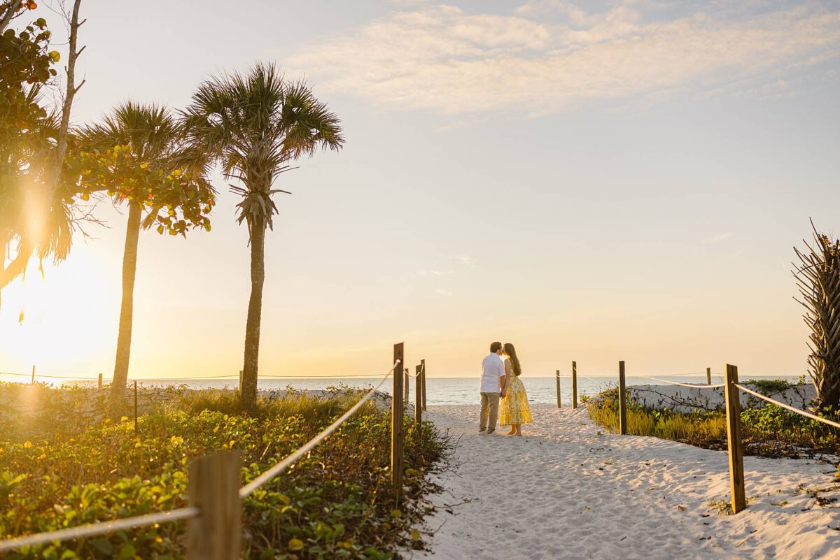 We still remember our first visit to Delnor-Wiggins Pass State Park and could have never imagined we would be documenting engagement sessions on its shoreline now over a decade later. From the moment we arrived and stepped out onto the sand, the evening felt effortless. After capturing a few photos surrounded by the trees, we set off to explore the beach. Golden hour was absolute perfection, creating a dreamy backdrop for portraits, and these two looked amazing in their soft, neutral tones. Elana’s outfits were perfect for the setting! Her white lace dress felt timeless and romantic, while her yellow floral dress added a gorgeous pop of color that fit the scene beautifully! We loved that she tied in colors from their wedding day, making the session feel even more personal and meaningful.
