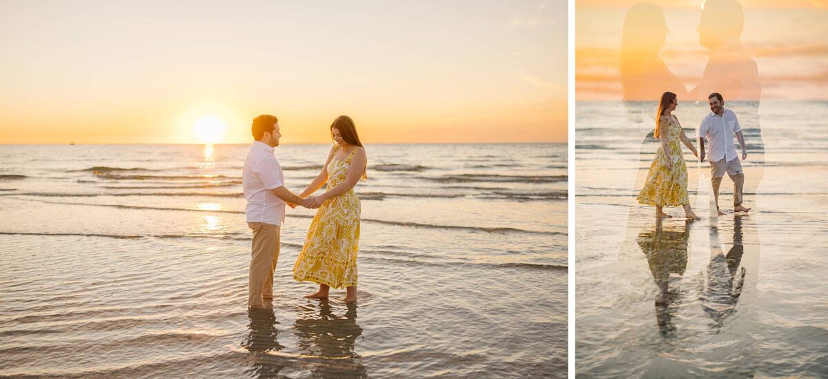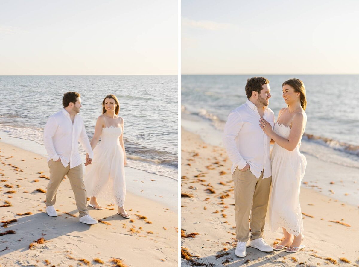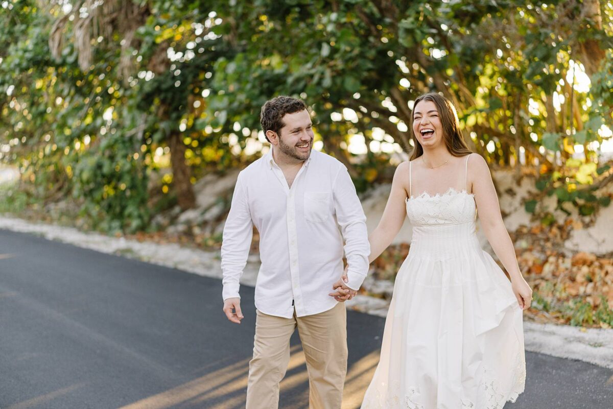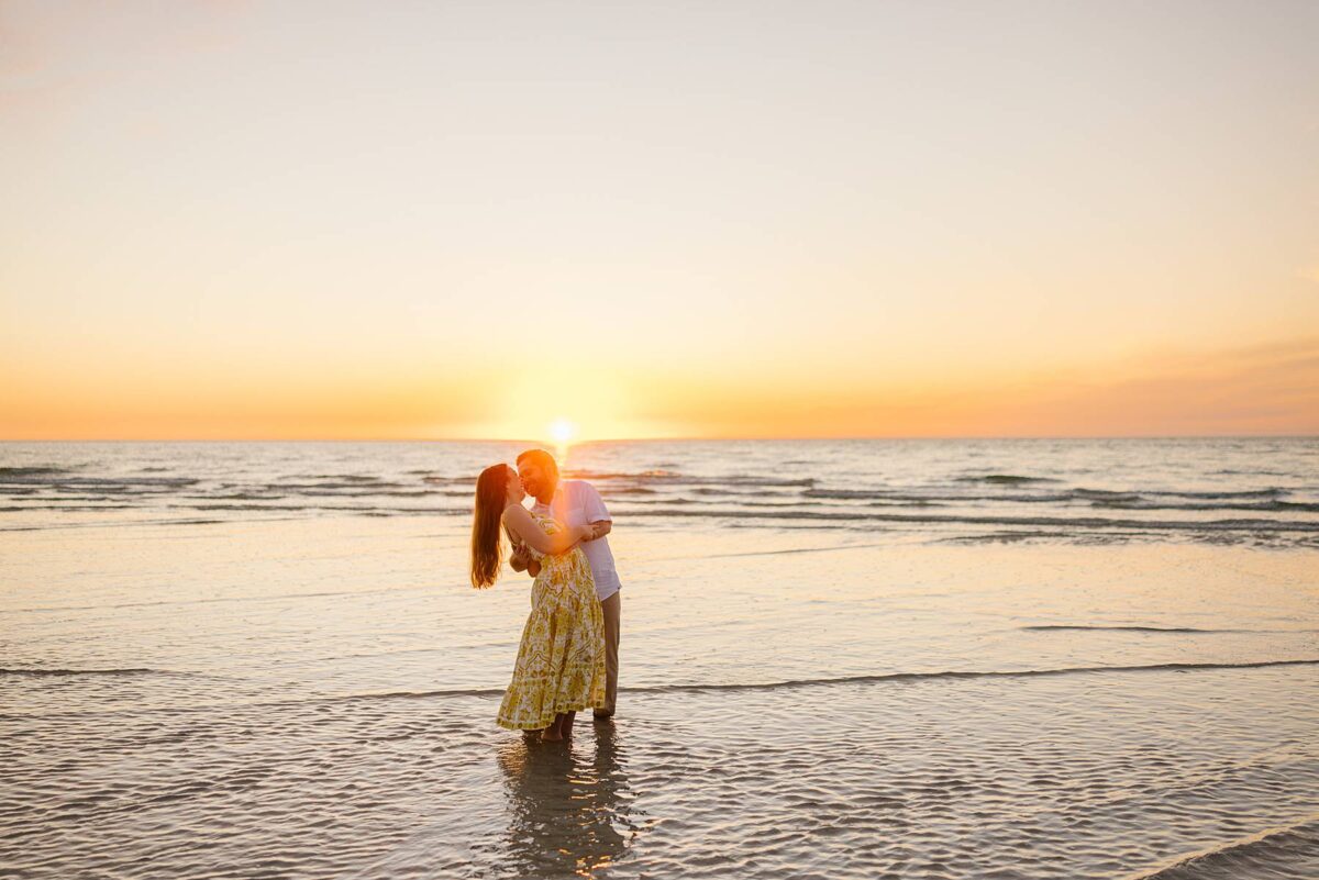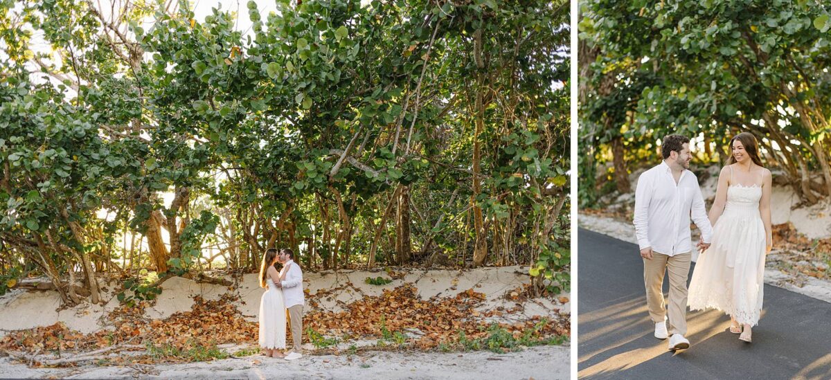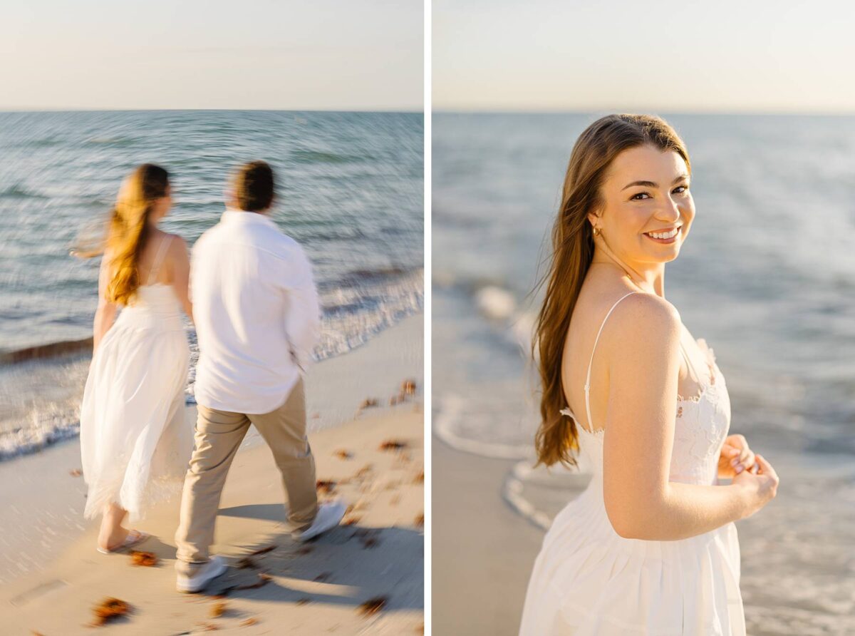 We still remember our first visit to Delnor-Wiggins Pass State Park and could have never imagined we would be documenting engagement sessions on its shoreline now over a decade later. From the moment we arrived and stepped out onto the sand, the evening felt effortless. After capturing a few photos surrounded by the trees, we set off to explore the beach. Golden hour was absolute perfection, creating a dreamy backdrop for portraits, and these two looked amazing in their soft, neutral tones. Elana’s outfits were perfect for the setting! Her white lace dress felt timeless and romantic, while her yellow floral dress added a gorgeous pop of color that fit the scene beautifully! We loved that she tied in colors from their wedding day, making the session feel even more personal and meaningful.