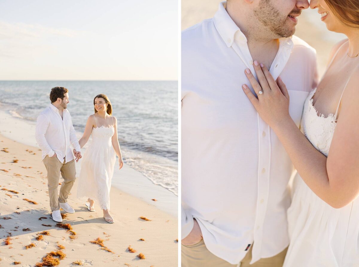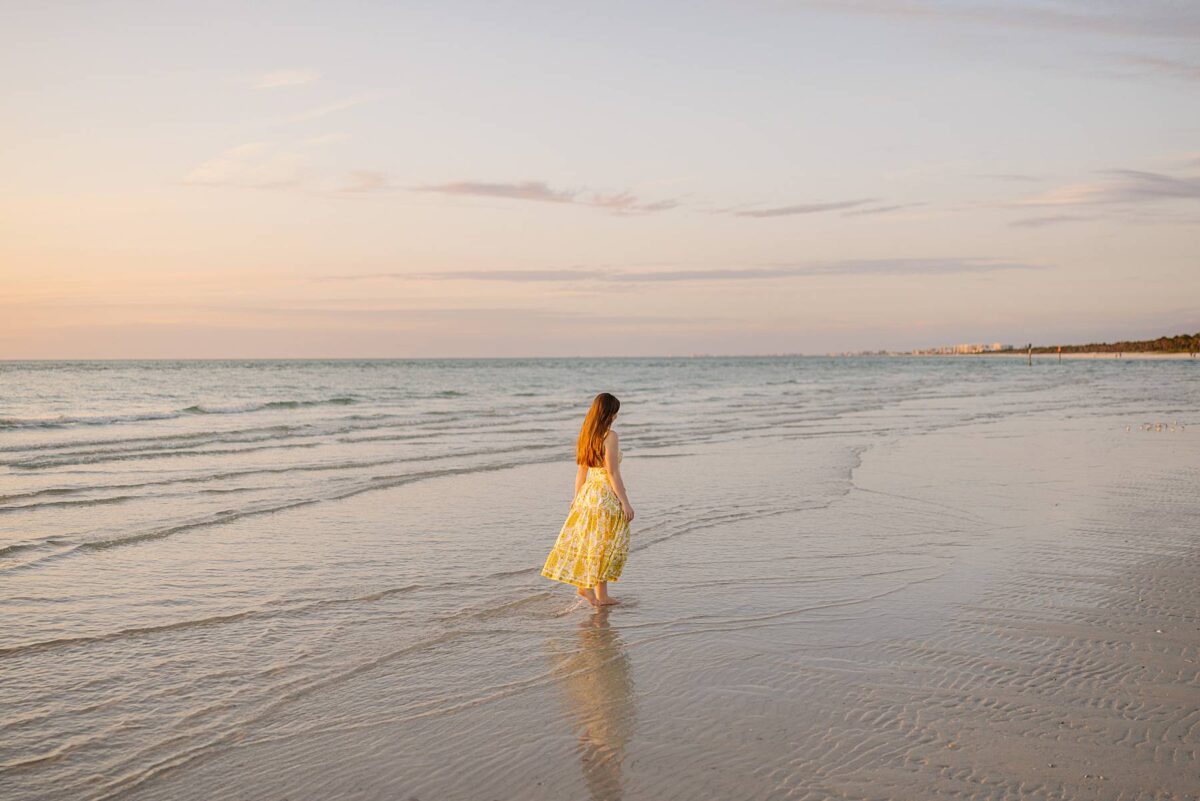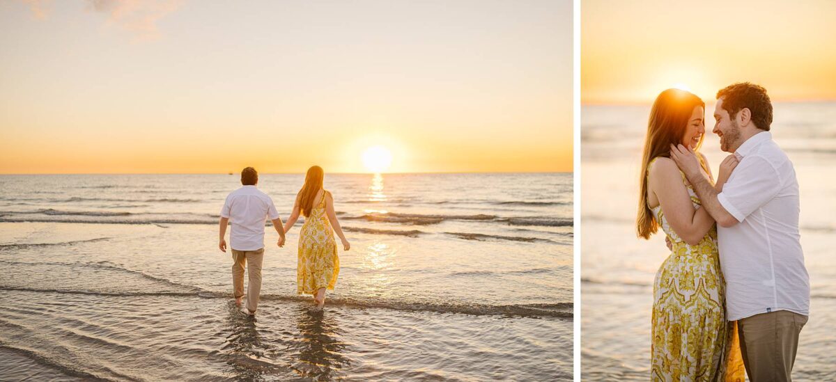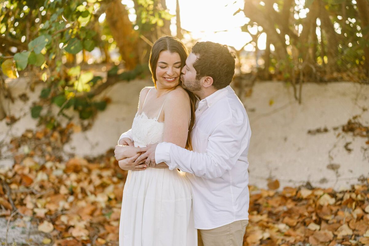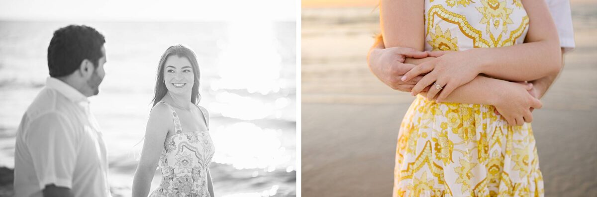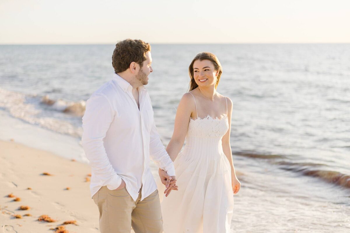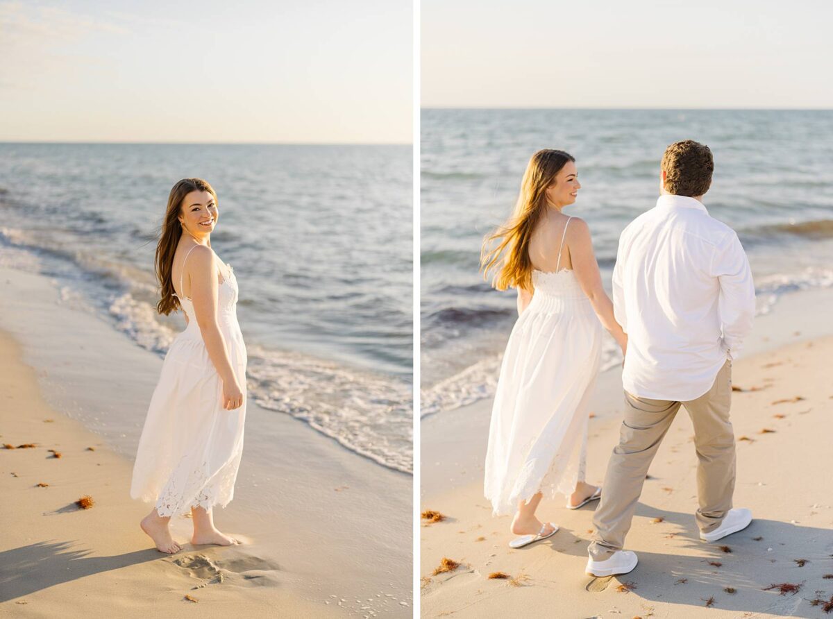 We still remember our first visit to Delnor-Wiggins Pass State Park and could have never imagined we would be documenting engagement sessions on its shoreline now over a decade later. From the moment we arrived and stepped out onto the sand, the evening felt effortless. After capturing a few photos surrounded by the trees, we set off to explore the beach. Golden hour was absolute perfection, creating a dreamy backdrop for portraits, and these two looked amazing in their soft, neutral tones. Elana’s outfits were perfect for the setting! Her white lace dress felt timeless and romantic, while her yellow floral dress added a gorgeous pop of color that fit the scene beautifully! We loved that she tied in colors from their wedding day, making the session feel even more personal and meaningful.