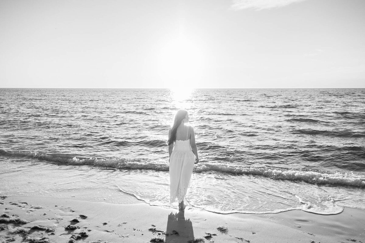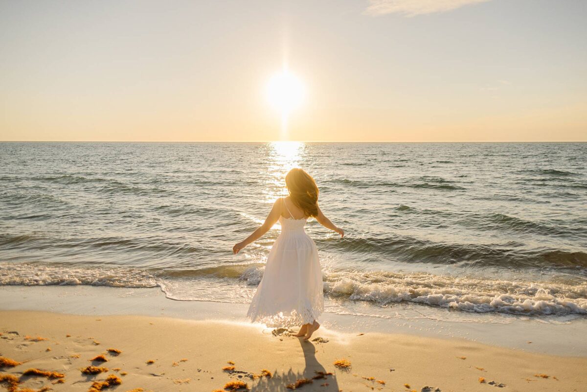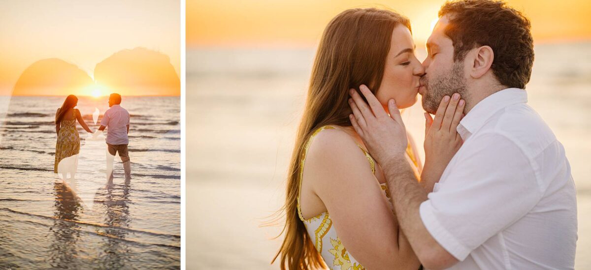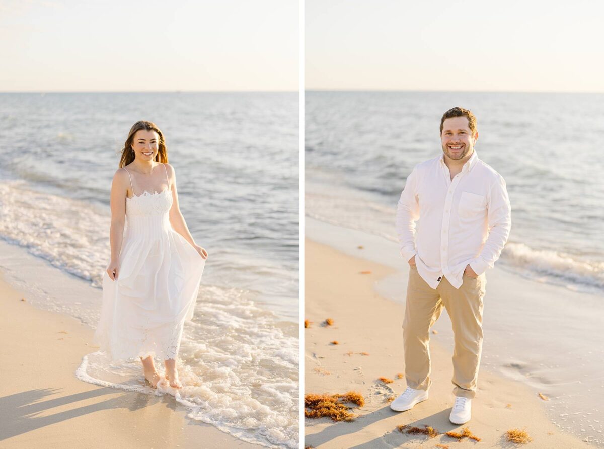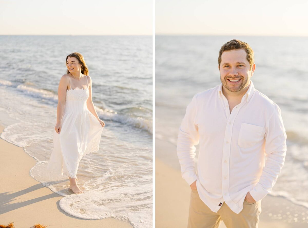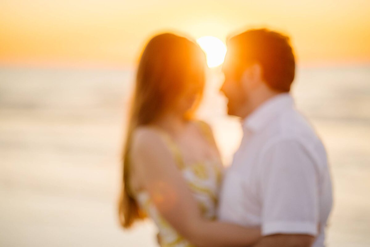 We still remember our first visit to Delnor-Wiggins Pass State Park and could have never imagined we would be documenting engagement sessions on its shoreline now over a decade later. From the moment we arrived and stepped out onto the sand, the evening felt effortless. After capturing a few photos surrounded by the trees, we set off to explore the beach. Golden hour was absolute perfection, creating a dreamy backdrop for portraits, and these two looked amazing in their soft, neutral tones. Elana’s outfits were perfect for the setting! Her white lace dress felt timeless and romantic, while her yellow floral dress added a gorgeous pop of color that fit the scene beautifully! We loved that she tied in colors from their wedding day, making the session feel even more personal and meaningful.