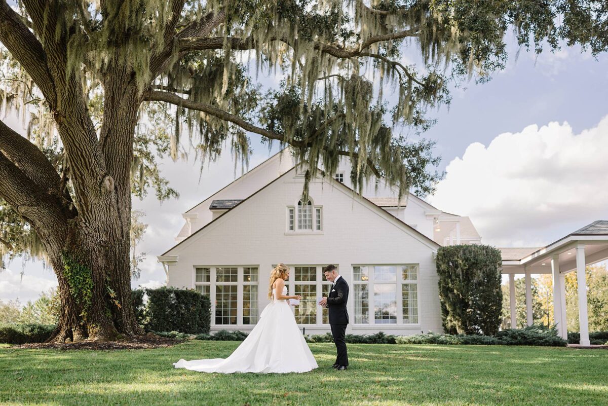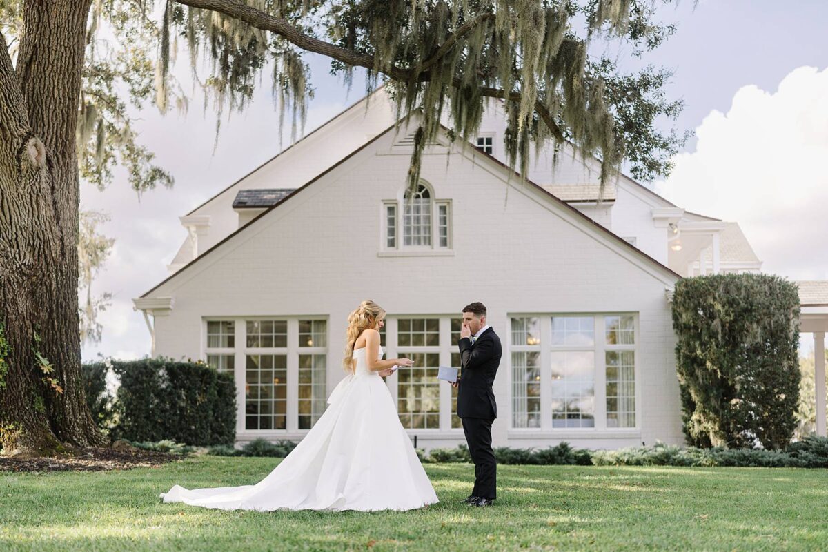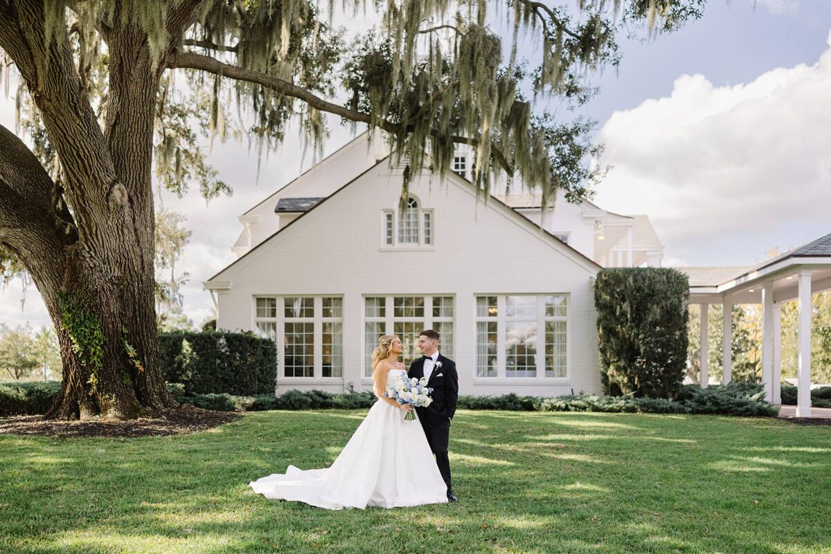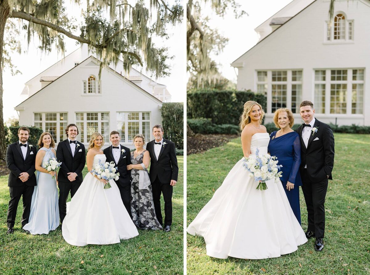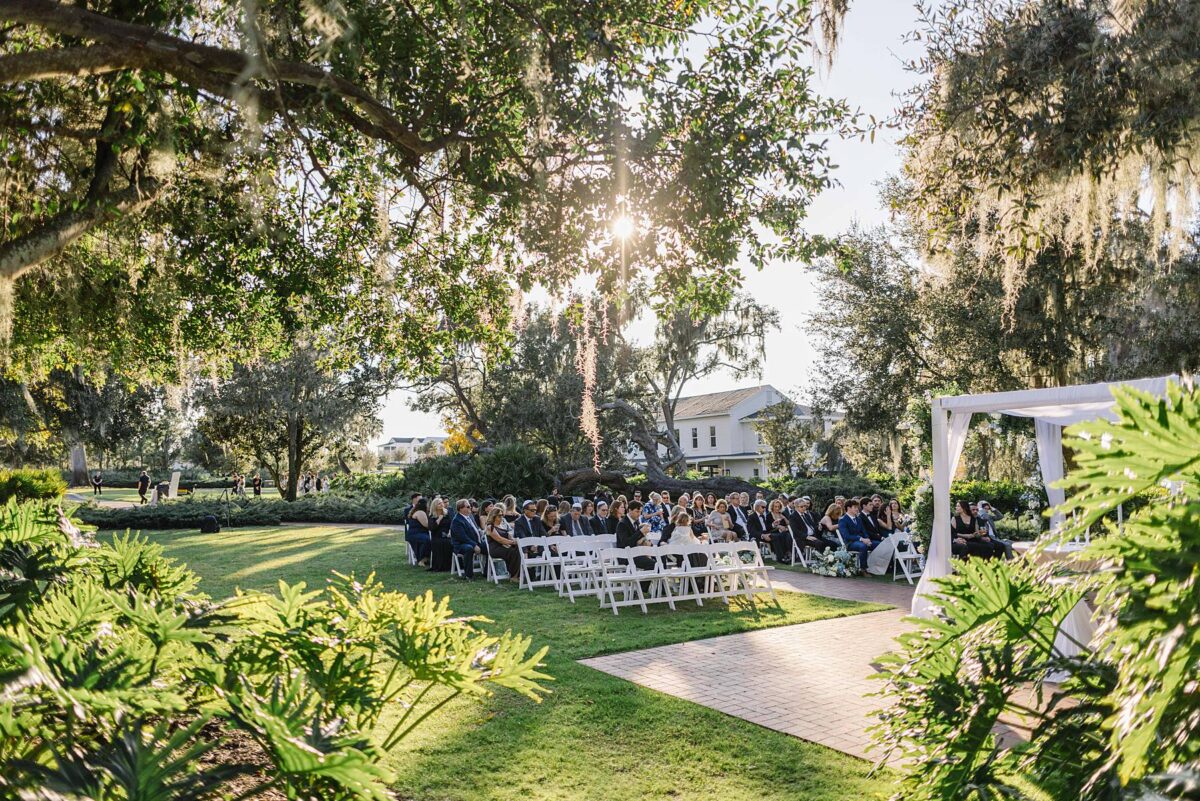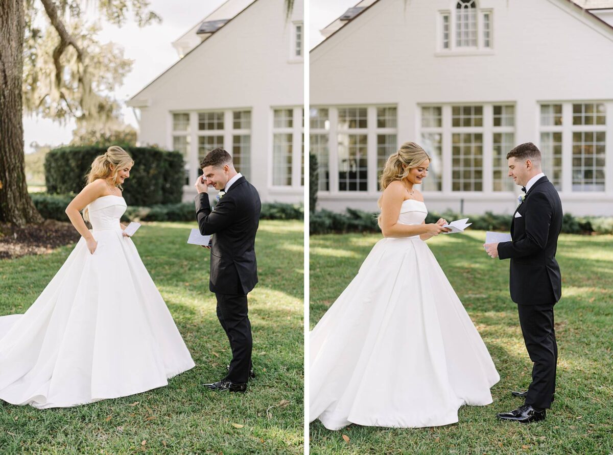 Jillian put on her gorgeous Rita Vinieris gown from Isabel O’Neil Bridal and stepped outside to greet her groom.  The two shared private vows under the oaks before we set off to explore the grounds for portraits.  The wedding party joined us for photos looking amazing in their Birdy Grey dresses and Men’s Wearhouse suits.  From the first time that we connected with Jillian and Noah for their engagement session on Sanibel Island, we were so excited for their wedding!  Their family and friends were a delight to serve, and we had the best time capturing portraits together, finishing up just before guests arrived.