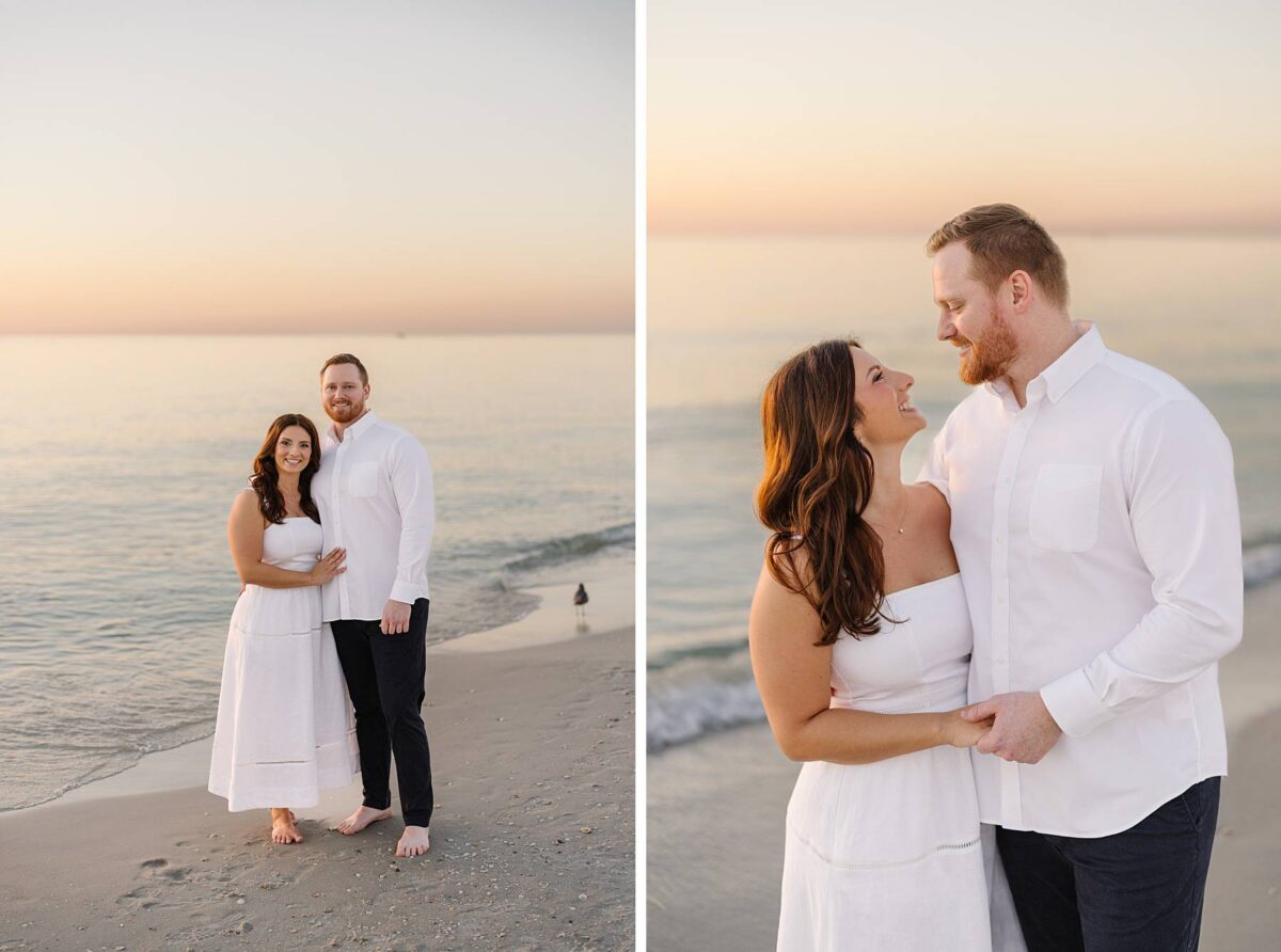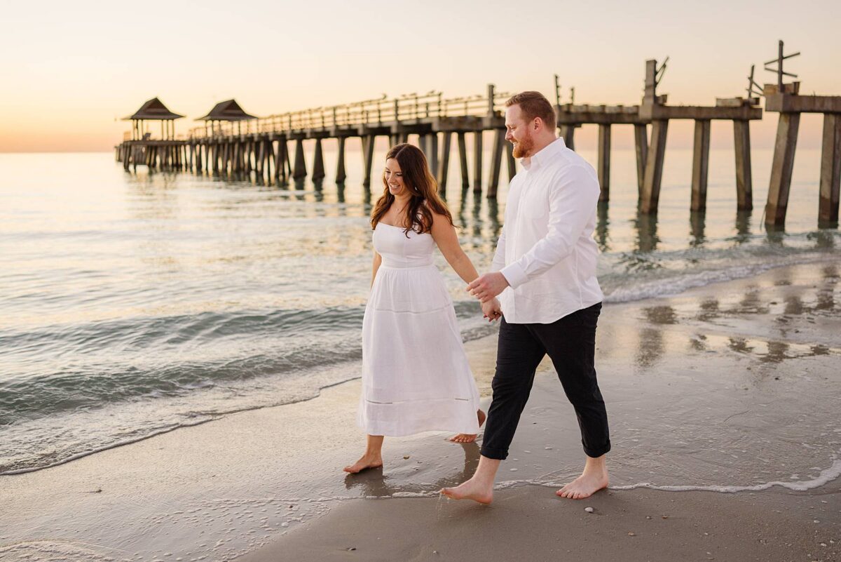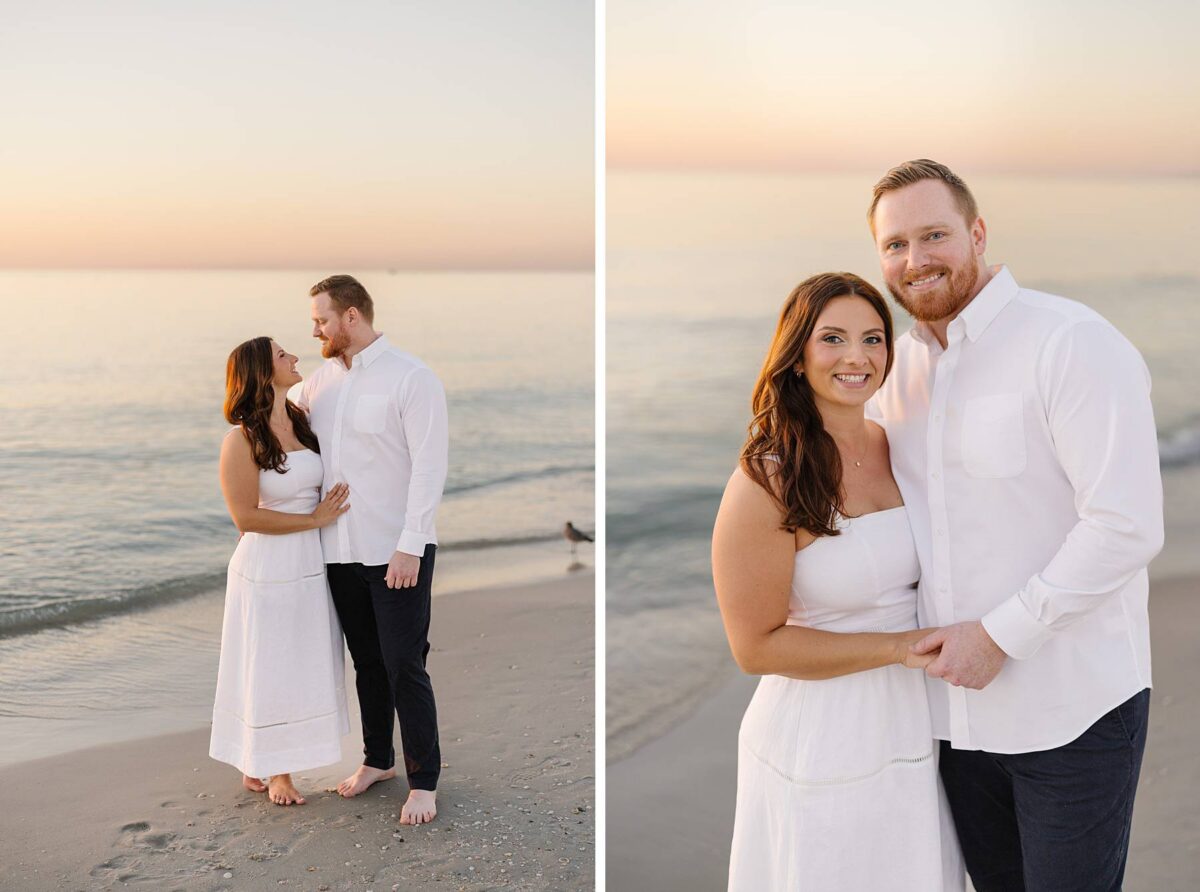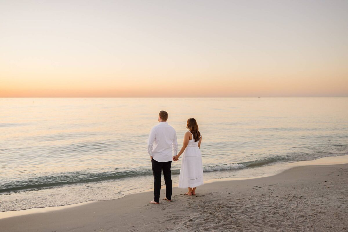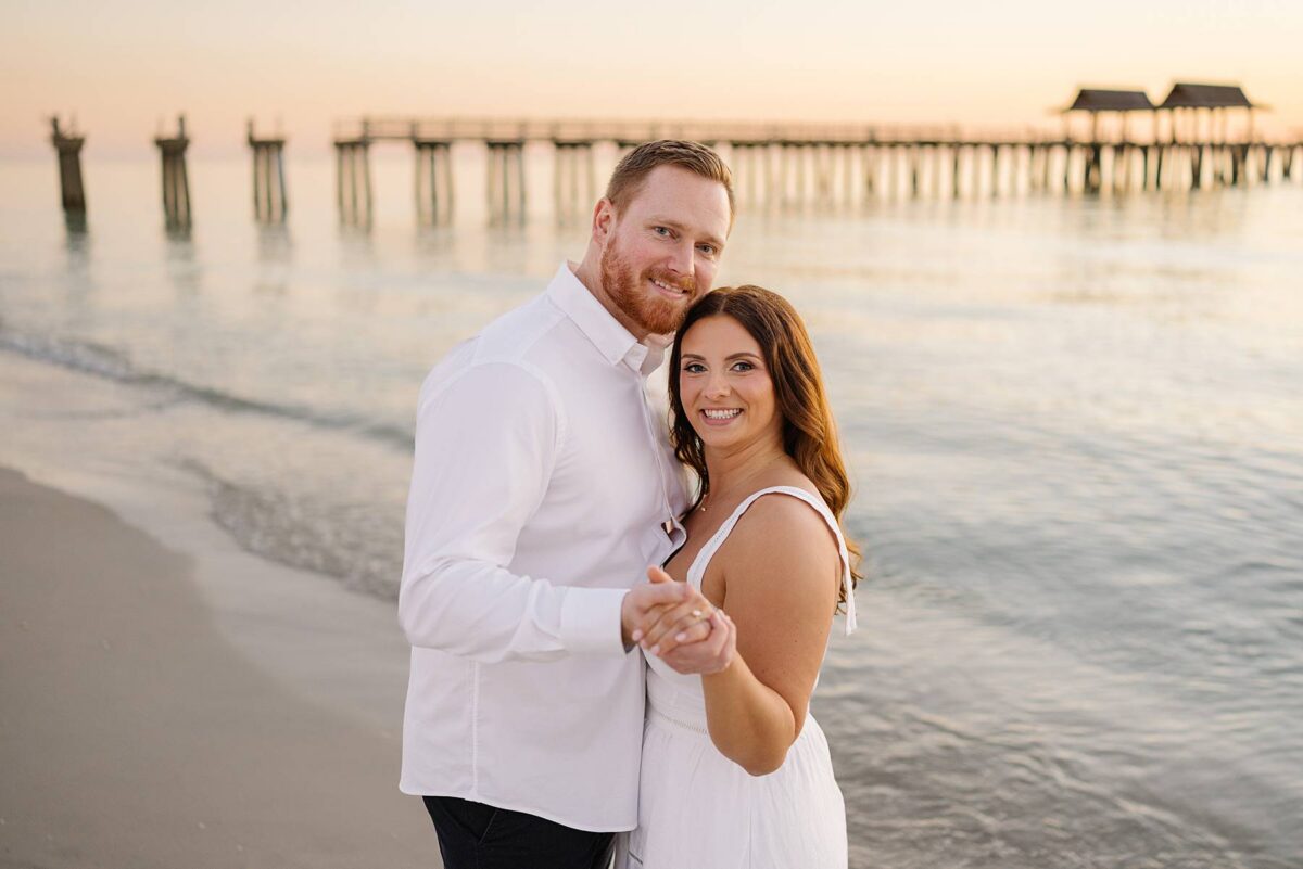 As the sun began to set, we made our way to the beach. Golden hour in Florida never disappoints, and this sunset was straight out of a dream. The sky glowed in soft pink and blue pastels while gentle waves rolled onto the shore. Photographing Jessica and Jordan as they walked along the water’s edge, completely soaking up this season as fiancés, was effortless and so much fun! We’ve loved getting to know these two, and had the best time chatting throughout their session. They first met through mutual friends, fell in love, and Jordan proposed at The Ritz-Carlton in Naples on a hot summer day. We truly can’t imagine a more breathtaking setting for a proposal. Of course Jessica said yes, and in a sweet full-circle moment they celebrated with tacos at the very same place they went to for their first date!