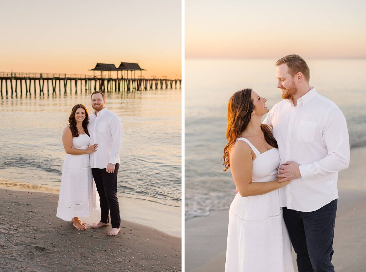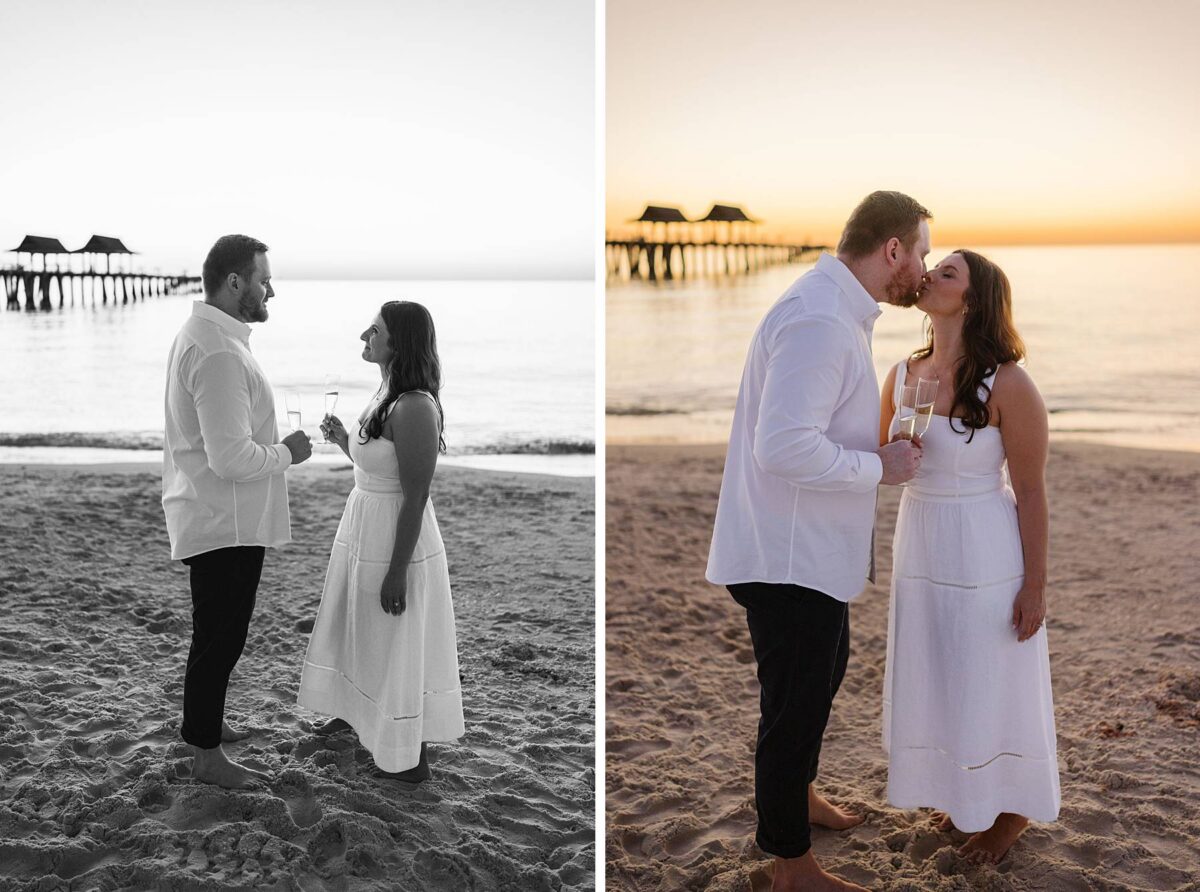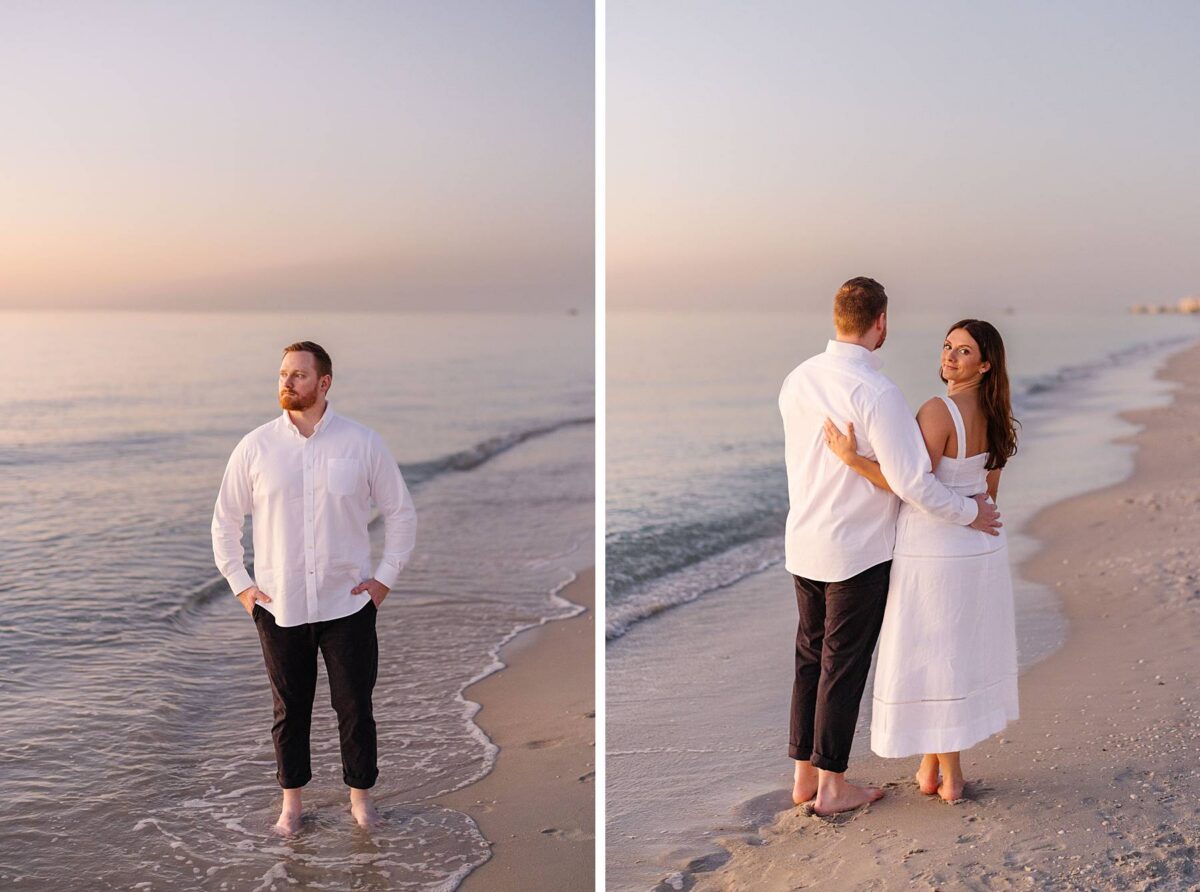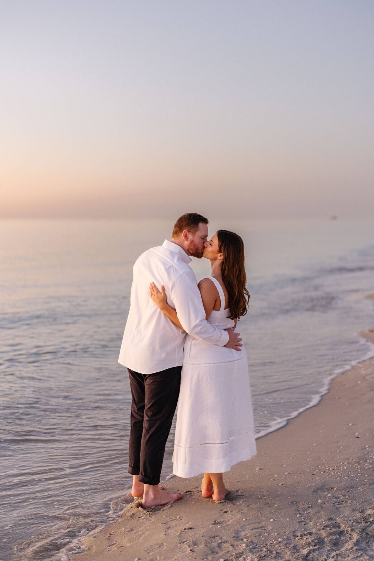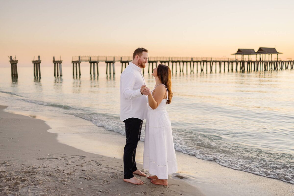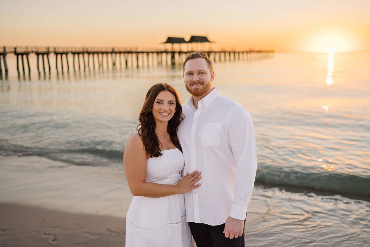 As the sun began to set, we made our way to the beach. Golden hour in Florida never disappoints, and this sunset was straight out of a dream. The sky glowed in soft pink and blue pastels while gentle waves rolled onto the shore. Photographing Jessica and Jordan as they walked along the water’s edge, completely soaking up this season as fiancés, was effortless and so much fun! We’ve loved getting to know these two, and had the best time chatting throughout their session. They first met through mutual friends, fell in love, and Jordan proposed at The Ritz-Carlton in Naples on a hot summer day. We truly can’t imagine a more breathtaking setting for a proposal. Of course Jessica said yes, and in a sweet full-circle moment they celebrated with tacos at the very same place they went to for their first date!