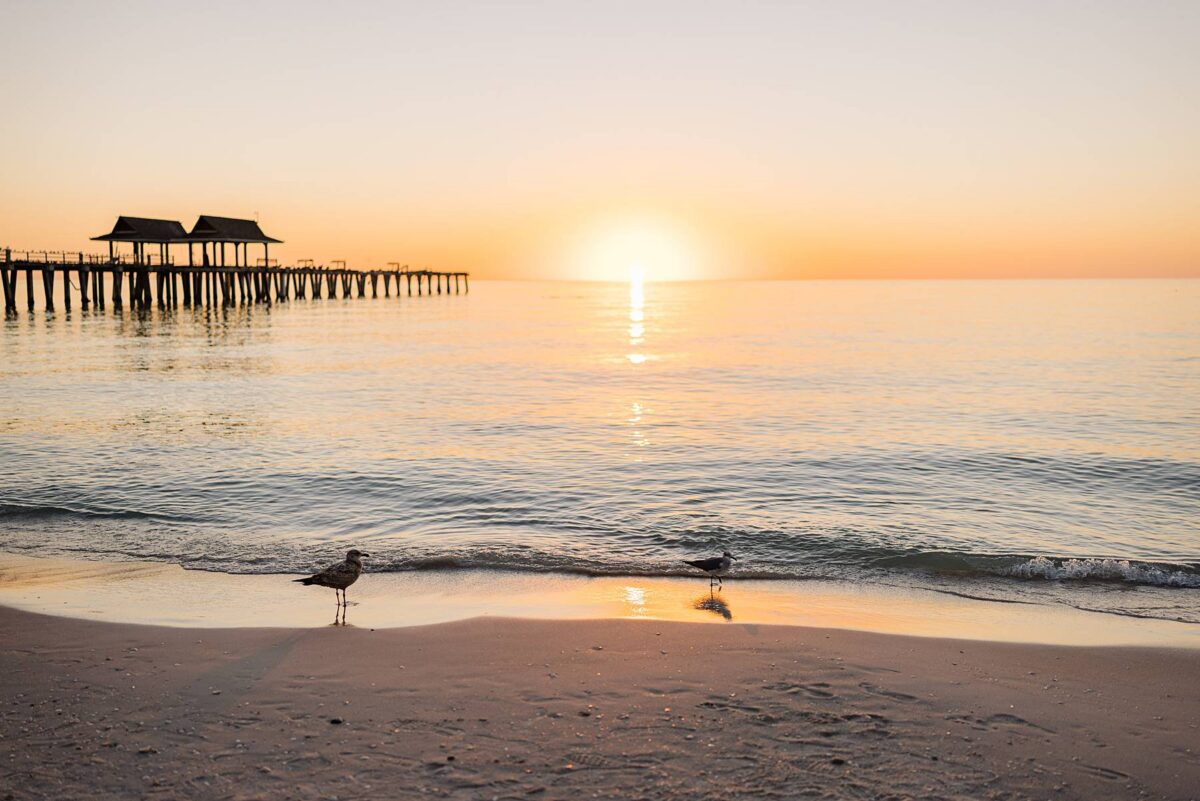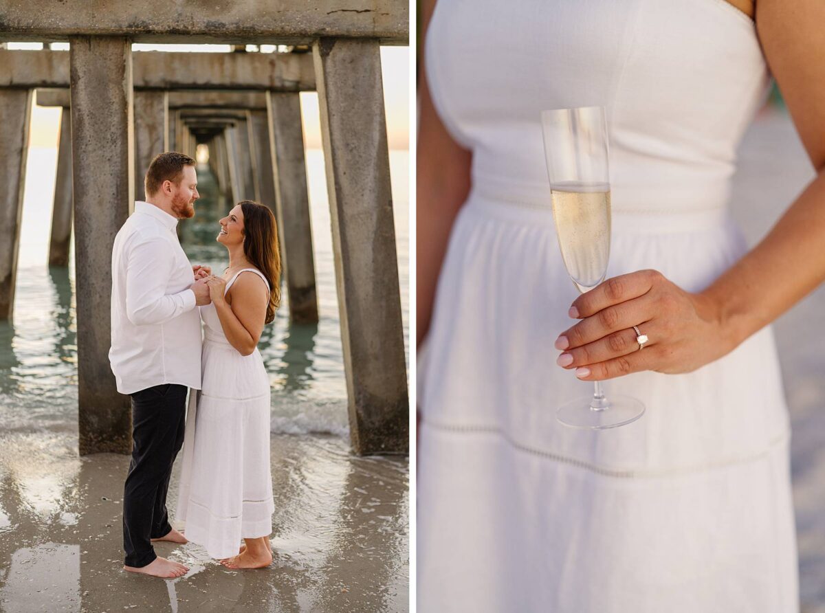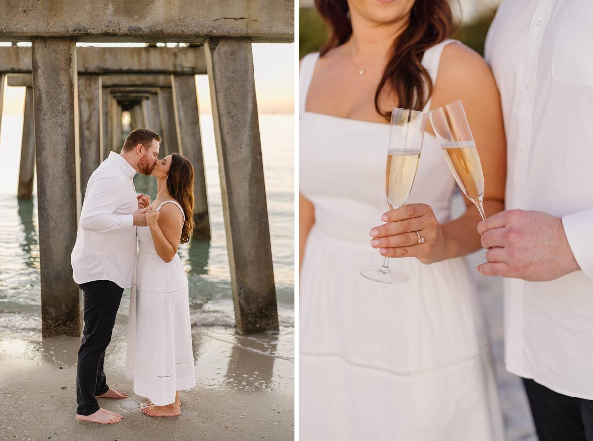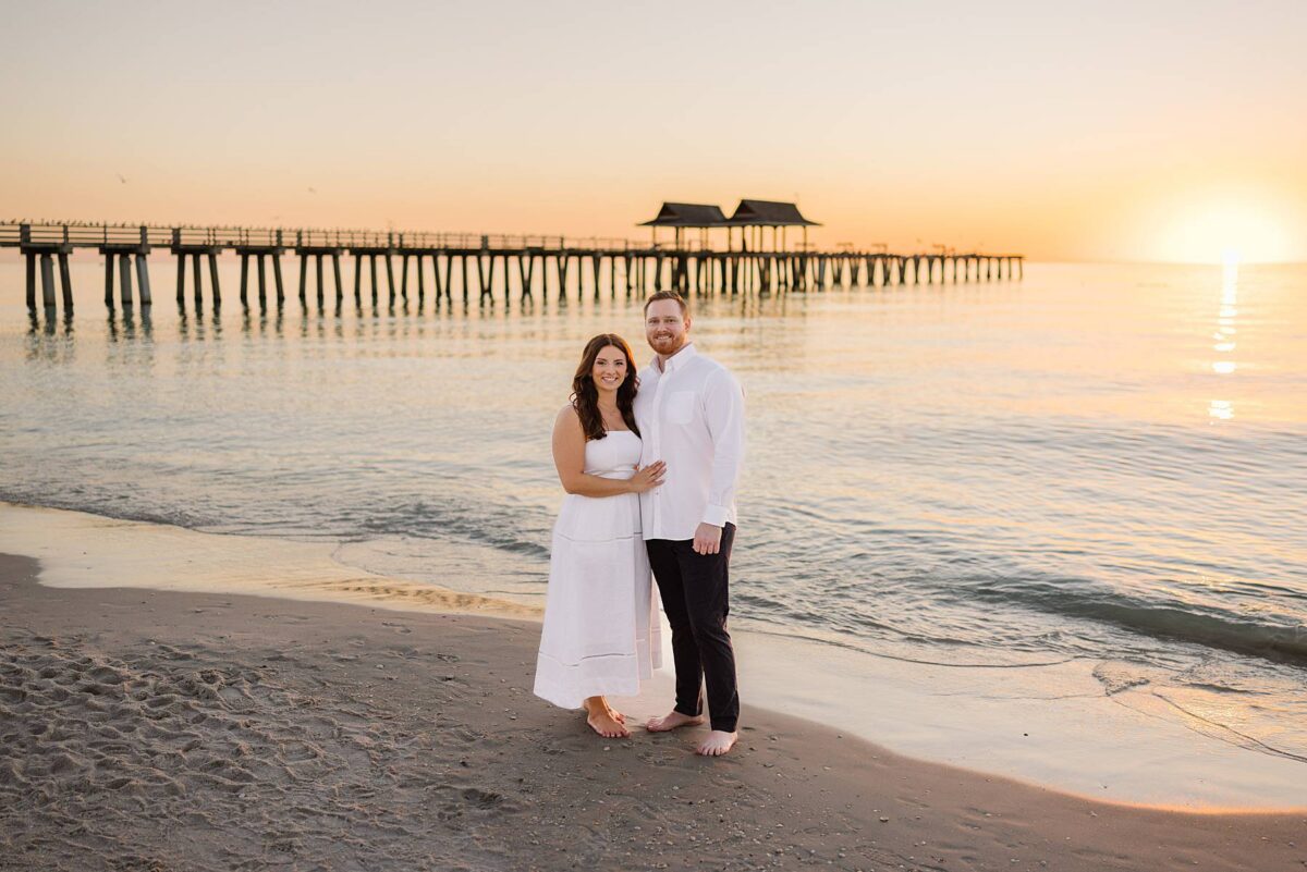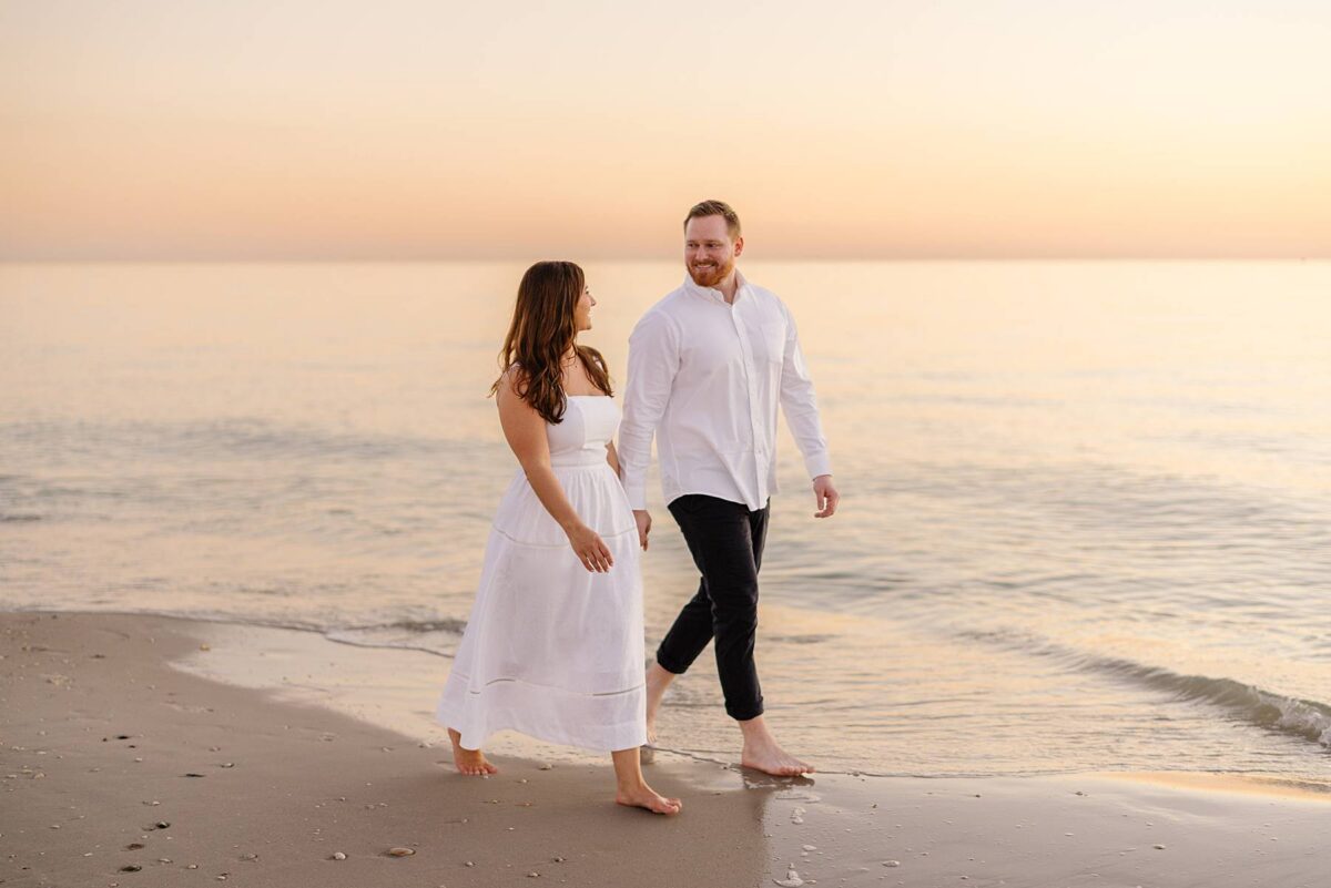 As the sun began to set, we made our way to the beach. Golden hour in Florida never disappoints, and this sunset was straight out of a dream. The sky glowed in soft pink and blue pastels while gentle waves rolled onto the shore. Photographing Jessica and Jordan as they walked along the water’s edge, completely soaking up this season as fiancés, was effortless and so much fun! We’ve loved getting to know these two, and had the best time chatting throughout their session. They first met through mutual friends, fell in love, and Jordan proposed at The Ritz-Carlton in Naples on a hot summer day. We truly can’t imagine a more breathtaking setting for a proposal. Of course Jessica said yes, and in a sweet full-circle moment they celebrated with tacos at the very same place they went to for their first date!