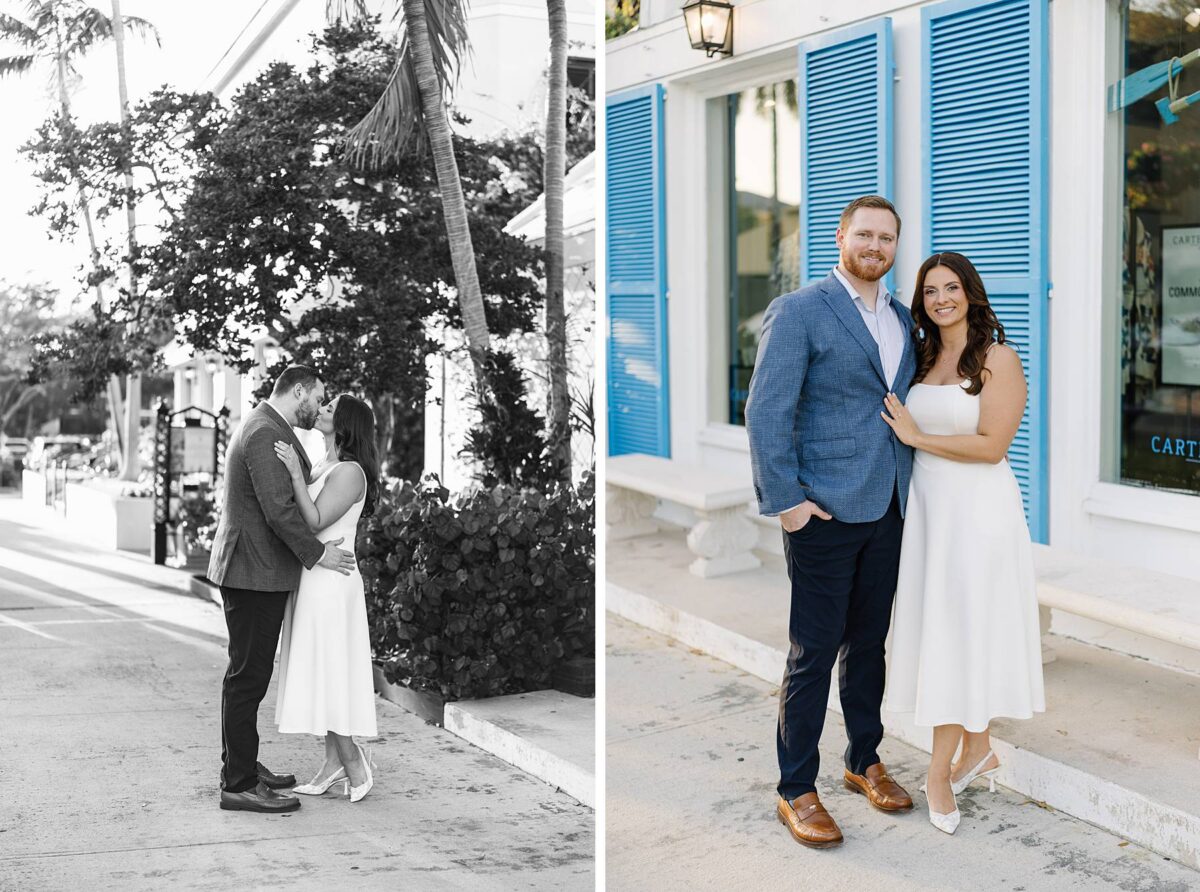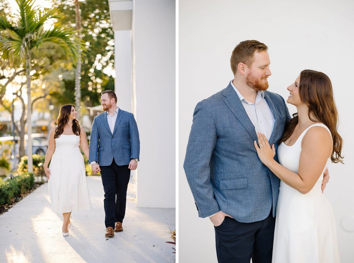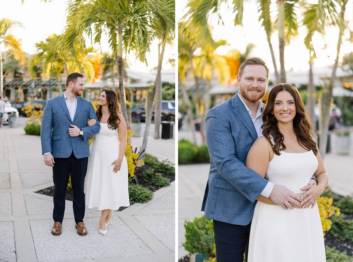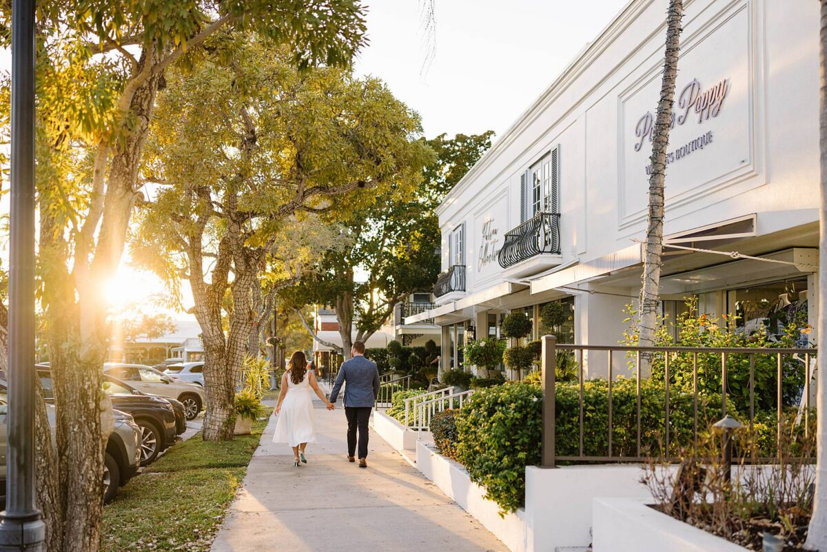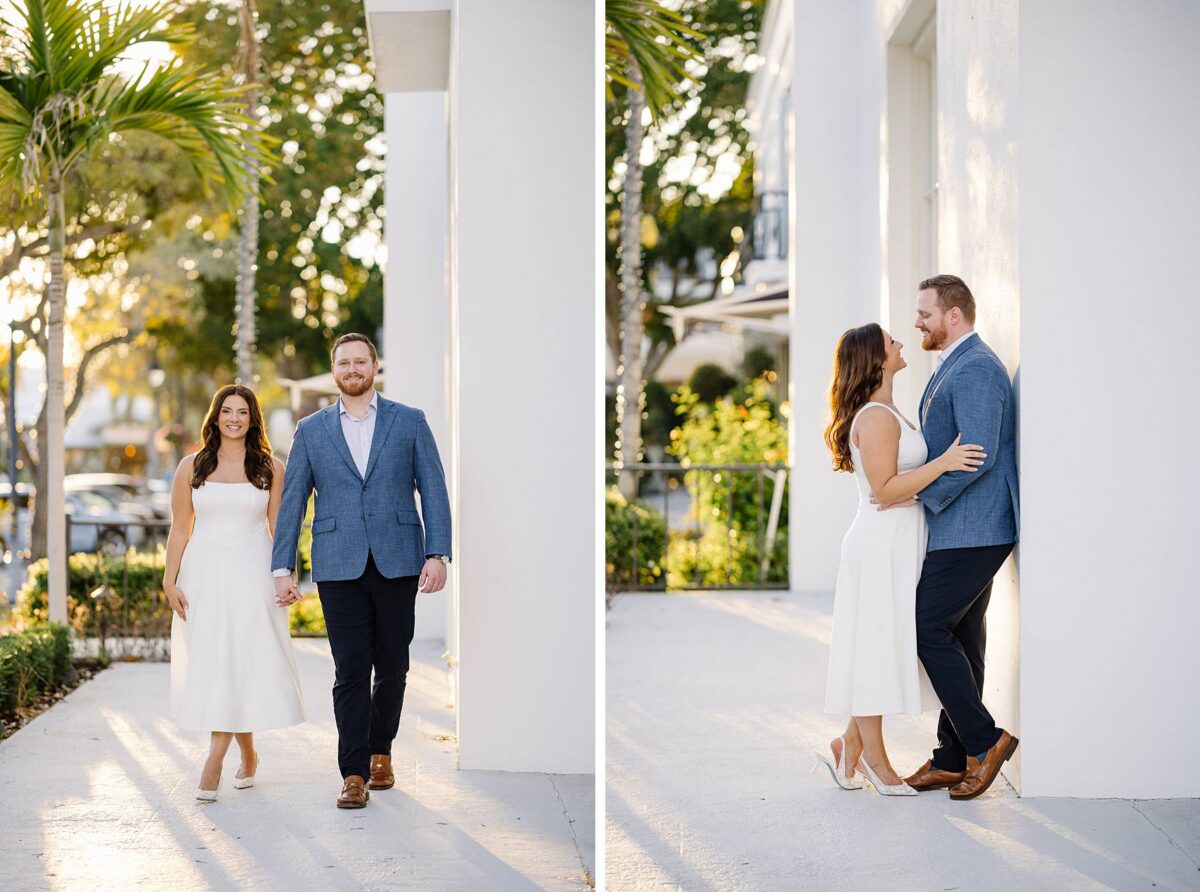 From the moment Jessica and Jordan reached out to book their wedding, we could not wait to connect for their engagement session in Naples. We met on one of the most gorgeous evenings yet, and their session was absolute perfection from start to finish! We began by strolling through the streets together, capturing portraits in all of our favorite spots. The soft neutral tones of the surrounding shops, textured walls, and palm-lined sidewalks create the most beautiful backdrops, and these two looked absolutely amazing! Their outfits were perfect for the setting, and we loved the way their colors blended flawlessly.