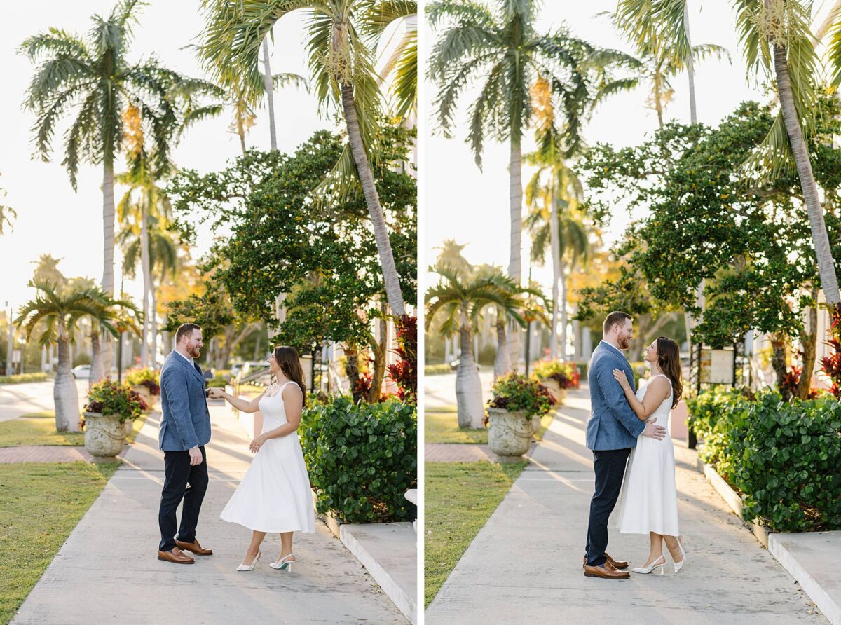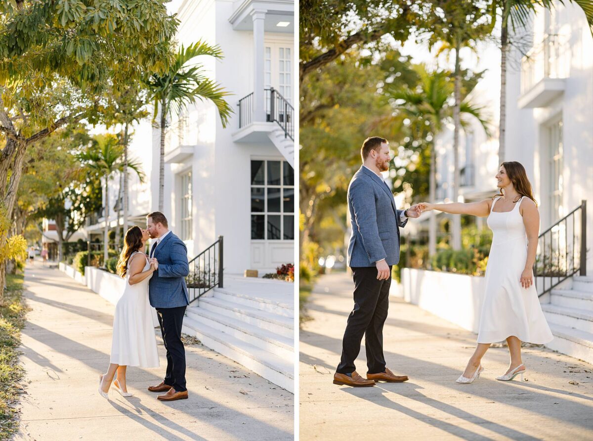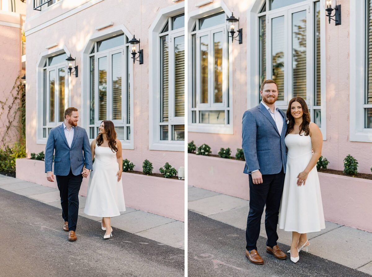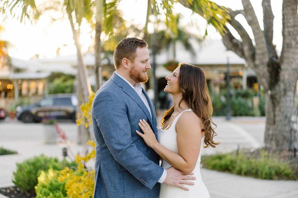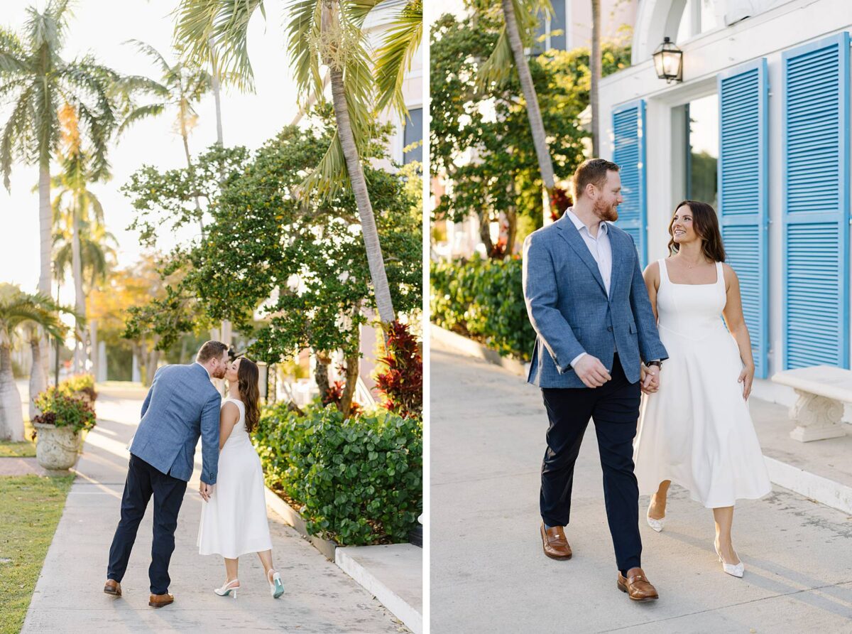 From the moment Jessica and Jordan reached out to book their wedding, we could not wait to connect for their engagement session in Naples. We met on one of the most gorgeous evenings yet, and their session was absolute perfection from start to finish! We began by strolling through the streets together, capturing portraits in all of our favorite spots. The soft neutral tones of the surrounding shops, textured walls, and palm-lined sidewalks create the most beautiful backdrops, and these two looked absolutely amazing! Their outfits were perfect for the setting, and we loved the way their colors blended flawlessly.