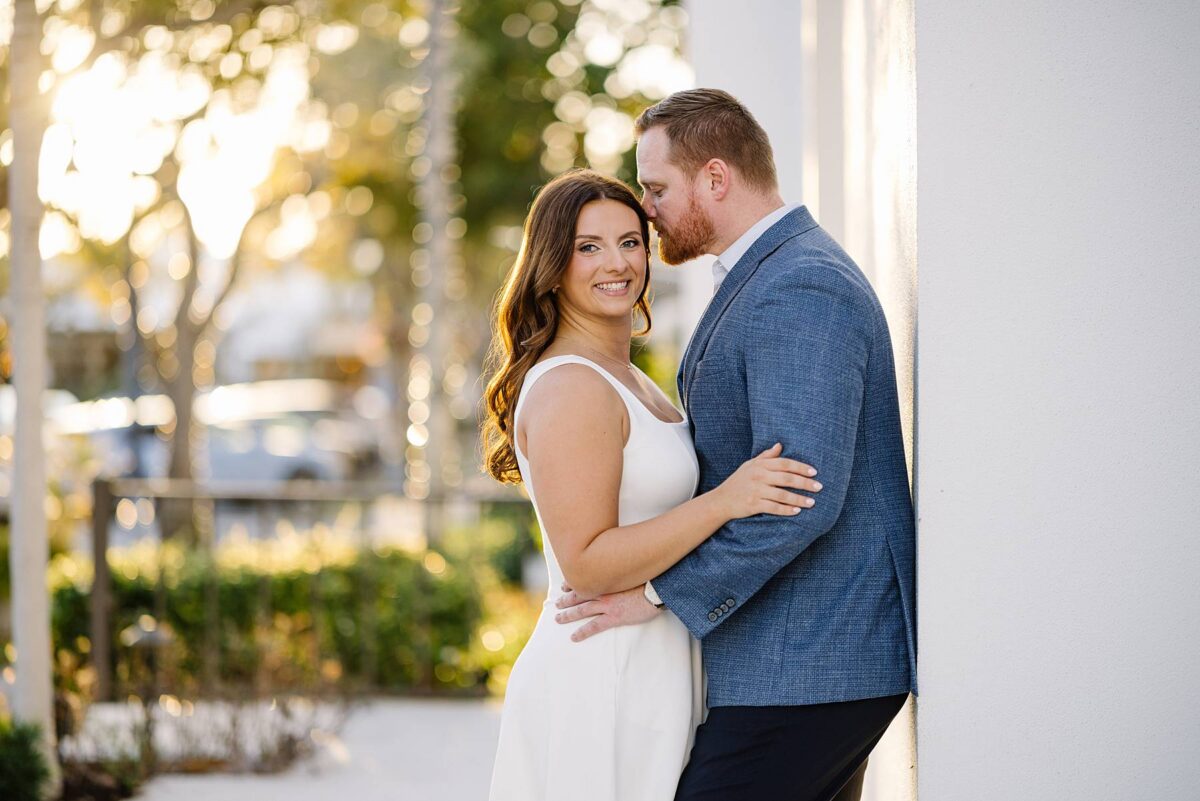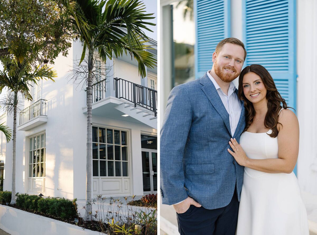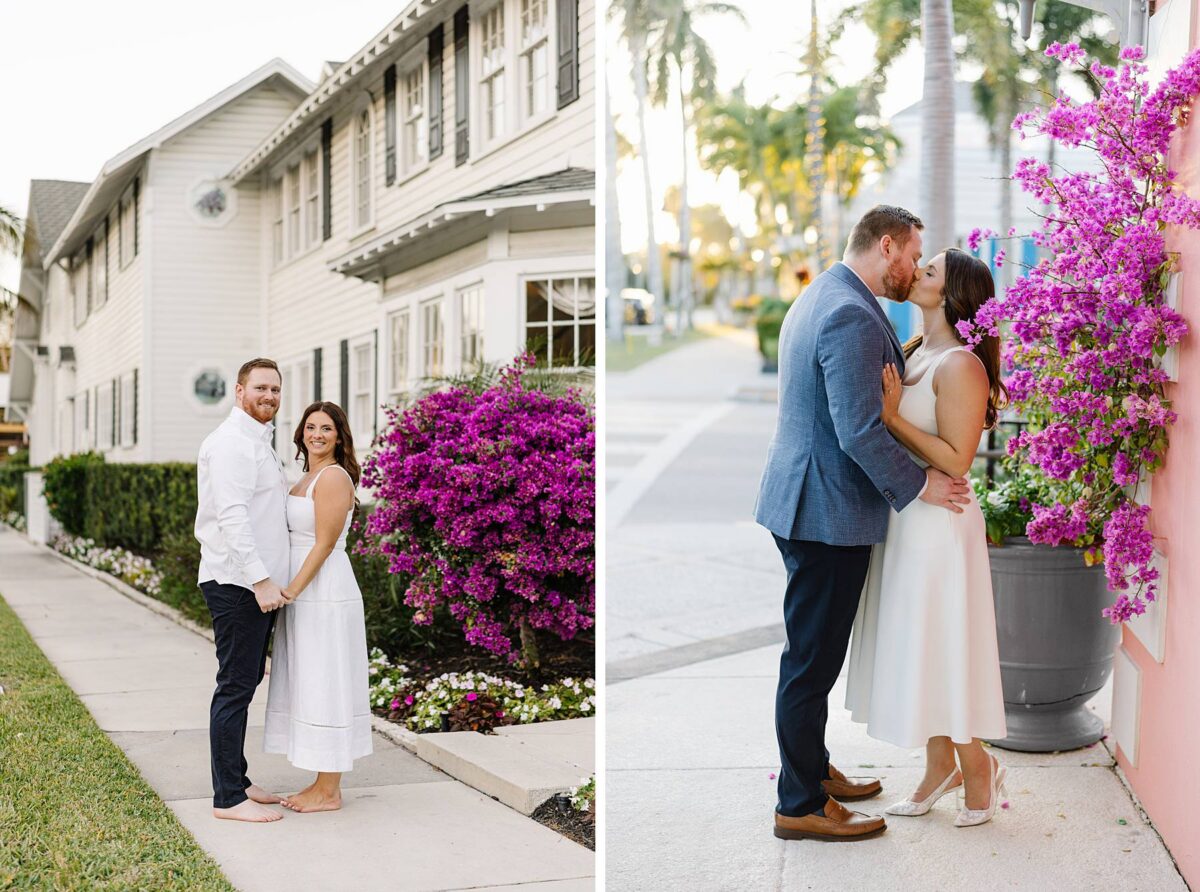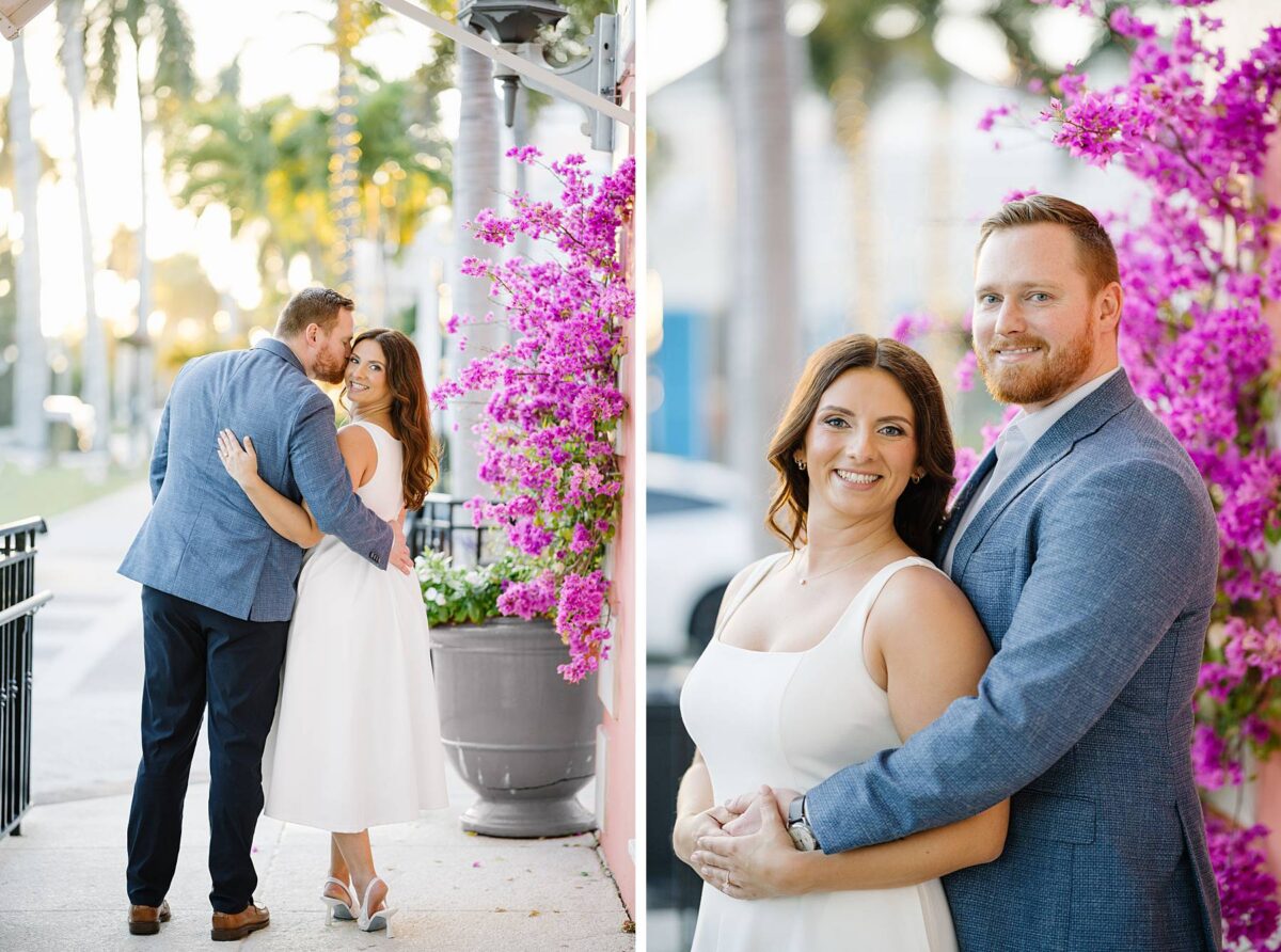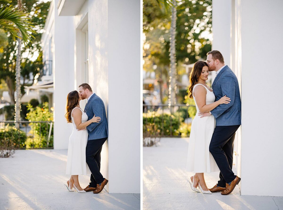 From the moment Jessica and Jordan reached out to book their wedding, we could not wait to connect for their engagement session in Naples. We met on one of the most gorgeous evenings yet, and their session was absolute perfection from start to finish! We began by strolling through the streets together, capturing portraits in all of our favorite spots. The soft neutral tones of the surrounding shops, textured walls, and palm-lined sidewalks create the most beautiful backdrops, and these two looked absolutely amazing! Their outfits were perfect for the setting, and we loved the way their colors blended flawlessly.