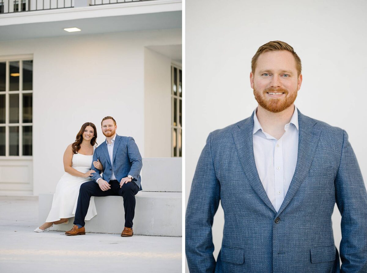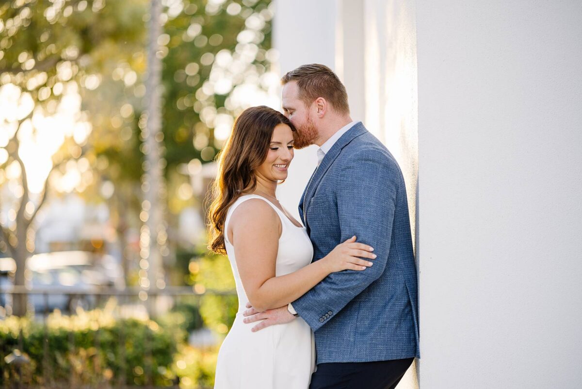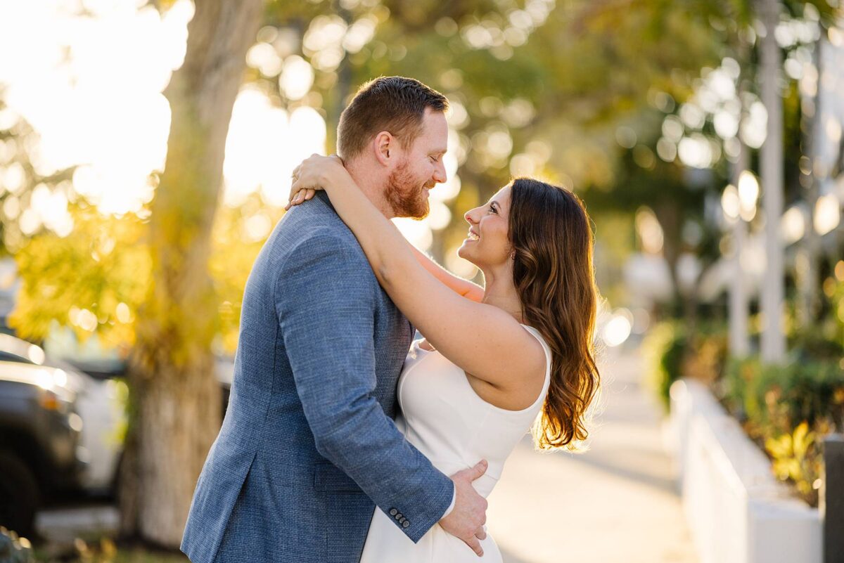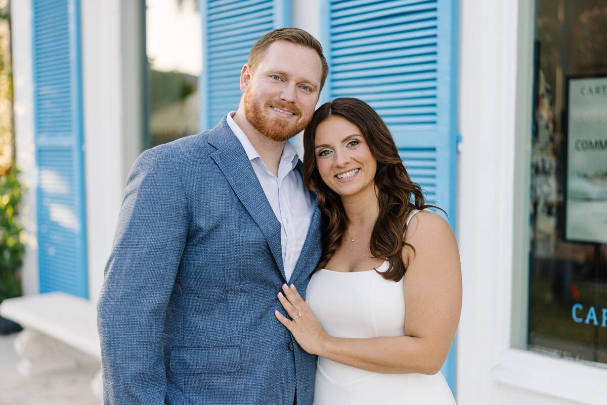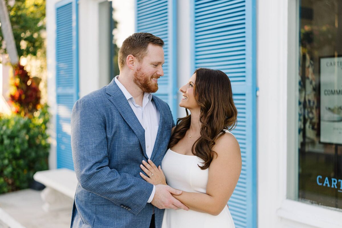 From the moment Jessica and Jordan reached out to book their wedding, we could not wait to connect for their engagement session in Naples. We met on one of the most gorgeous evenings yet, and their session was absolute perfection from start to finish! We began by strolling through the streets together, capturing portraits in all of our favorite spots. The soft neutral tones of the surrounding shops, textured walls, and palm-lined sidewalks create the most beautiful backdrops, and these two looked absolutely amazing! Their outfits were perfect for the setting, and we loved the way their colors blended flawlessly.