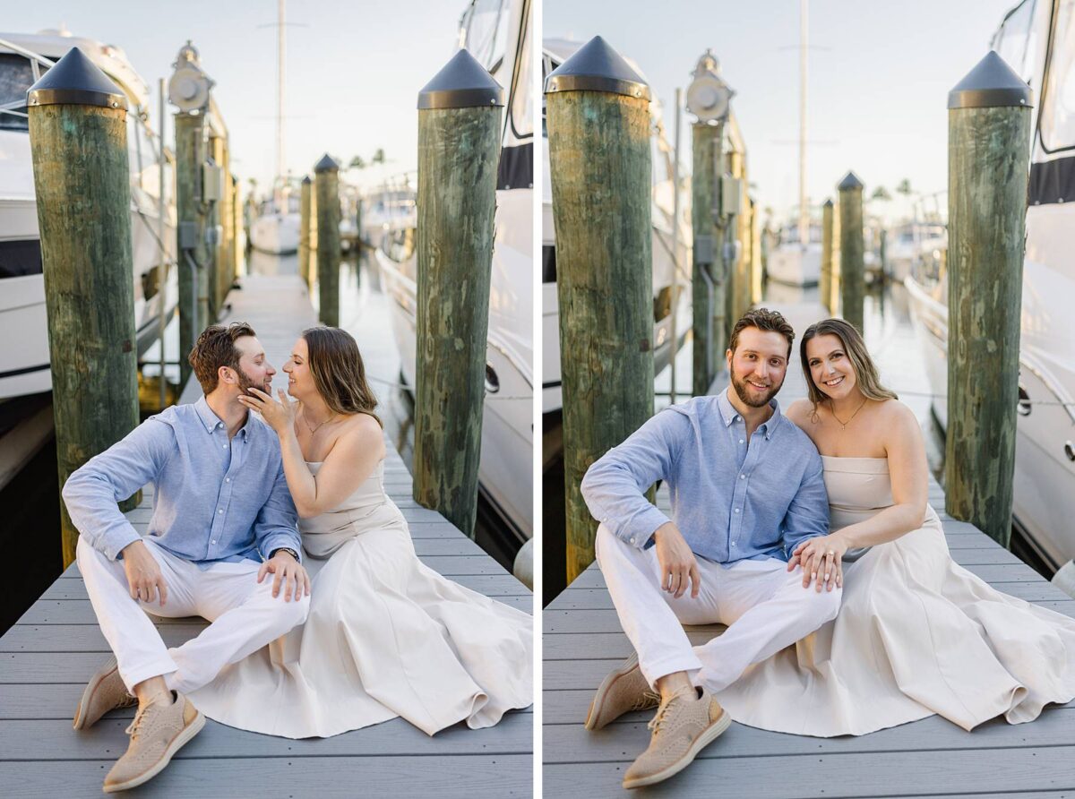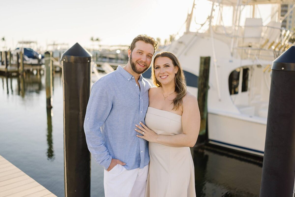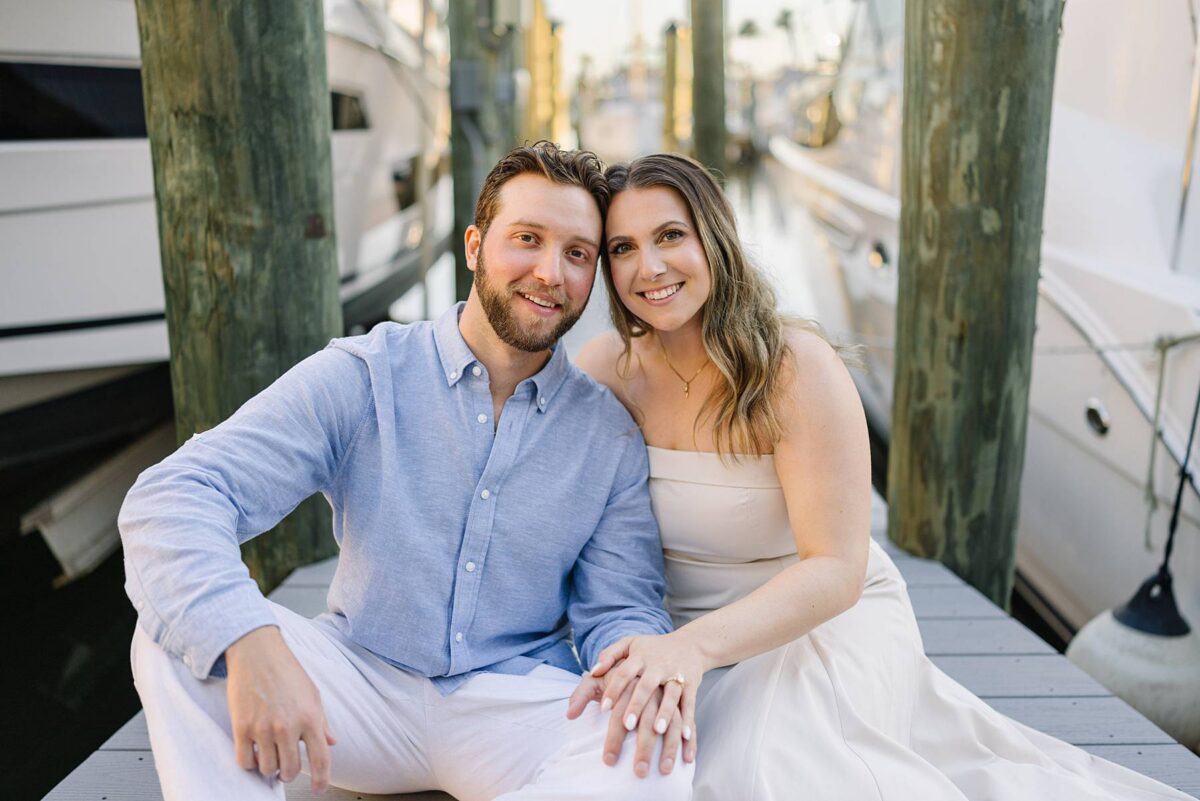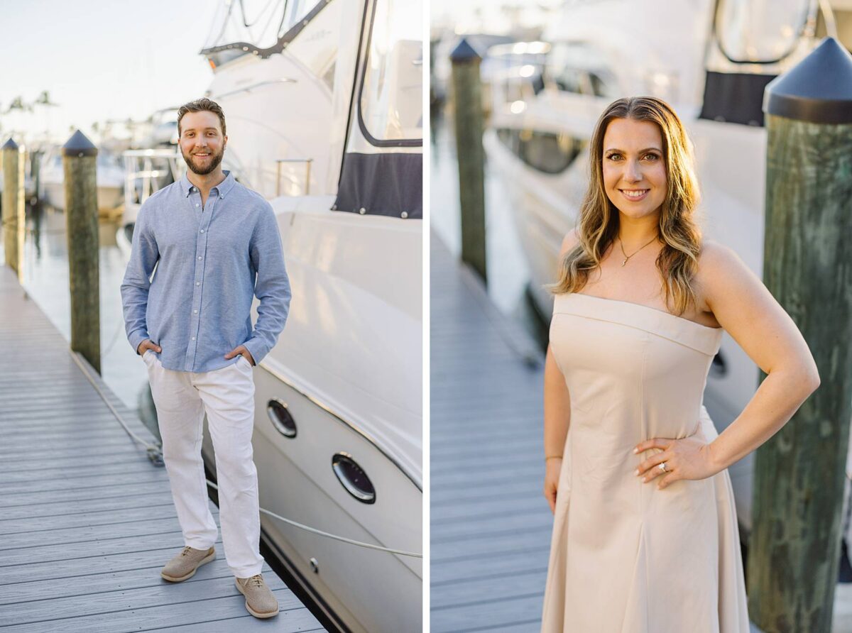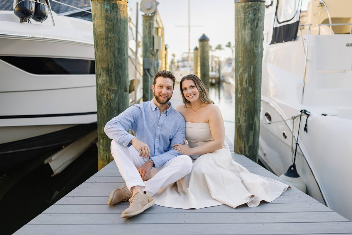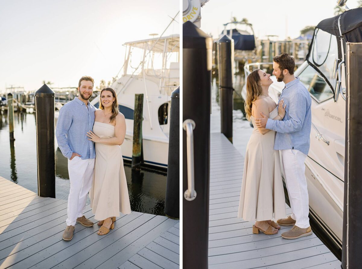 We met for their session at Tarpon Point Marina in Cape Coral on yet another stunning evening surrounded by yachts that created the perfect nautical backdrop for portraits. Kallie’s dress was gorgeous, and the tones and colors of their outfits coordinated beautifully with the setting! As we explored, we had the best time getting to hear their story. These two met in college at the University of Pittsburgh and love spending time in the great outdoors whether it be fishing or skiing together. It didn’t take long to know that they had found the one, and they are now planning their wedding for next spring.