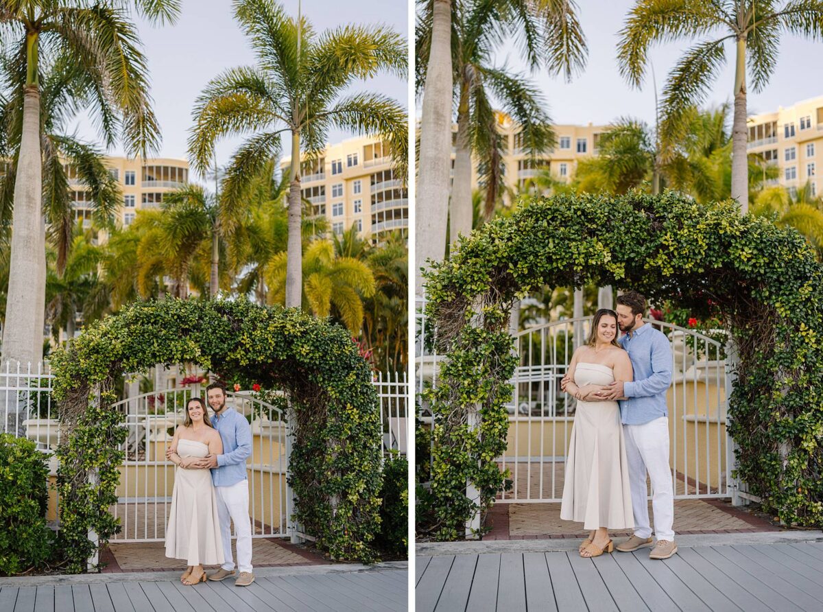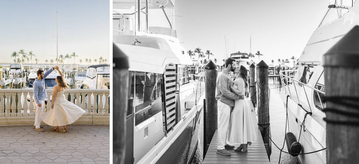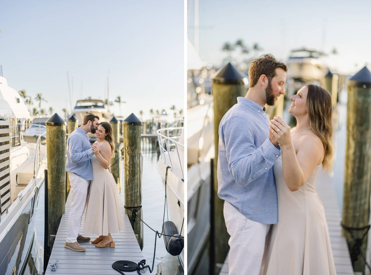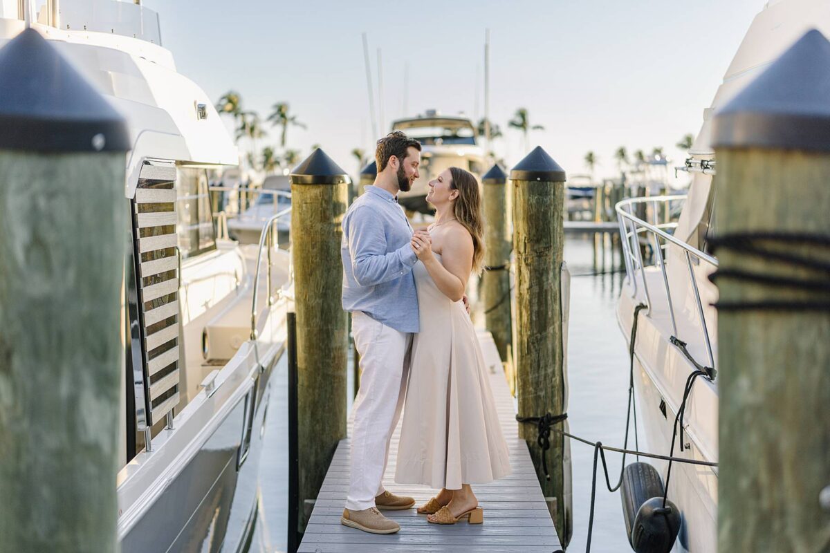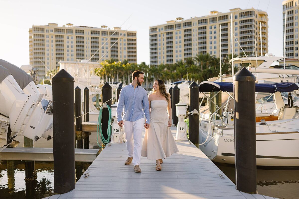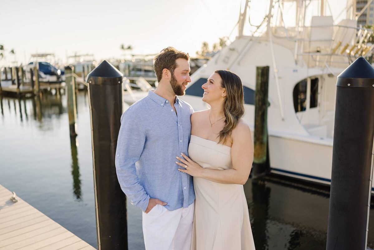 We met for their session at Tarpon Point Marina in Cape Coral on yet another stunning evening surrounded by yachts that created the perfect nautical backdrop for portraits. Kallie’s dress was gorgeous, and the tones and colors of their outfits coordinated beautifully with the setting! As we explored, we had the best time getting to hear their story. These two met in college at the University of Pittsburgh and love spending time in the great outdoors whether it be fishing or skiing together. It didn’t take long to know that they had found the one, and they are now planning their wedding for next spring.
