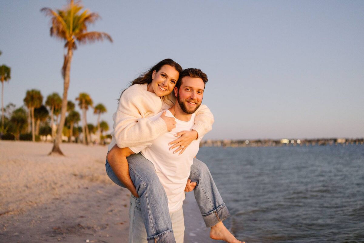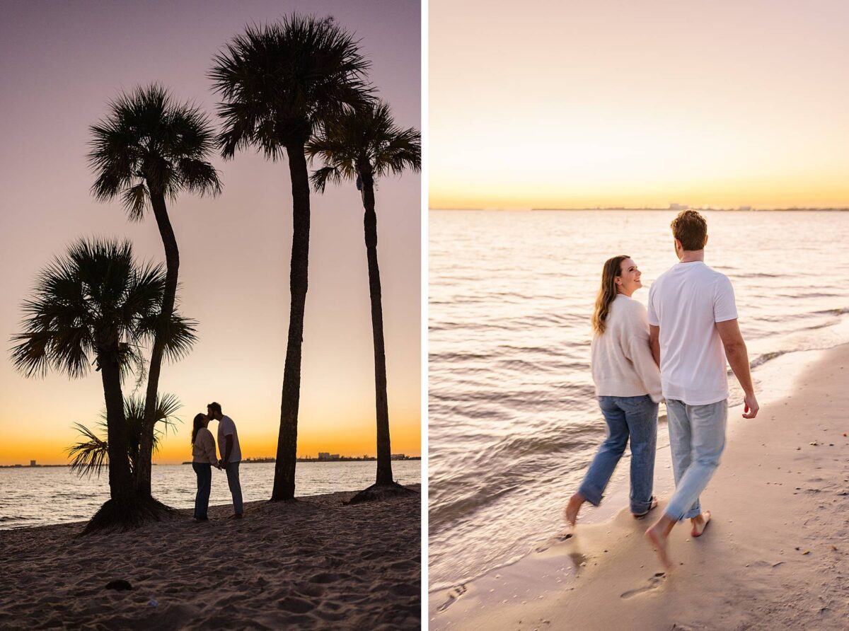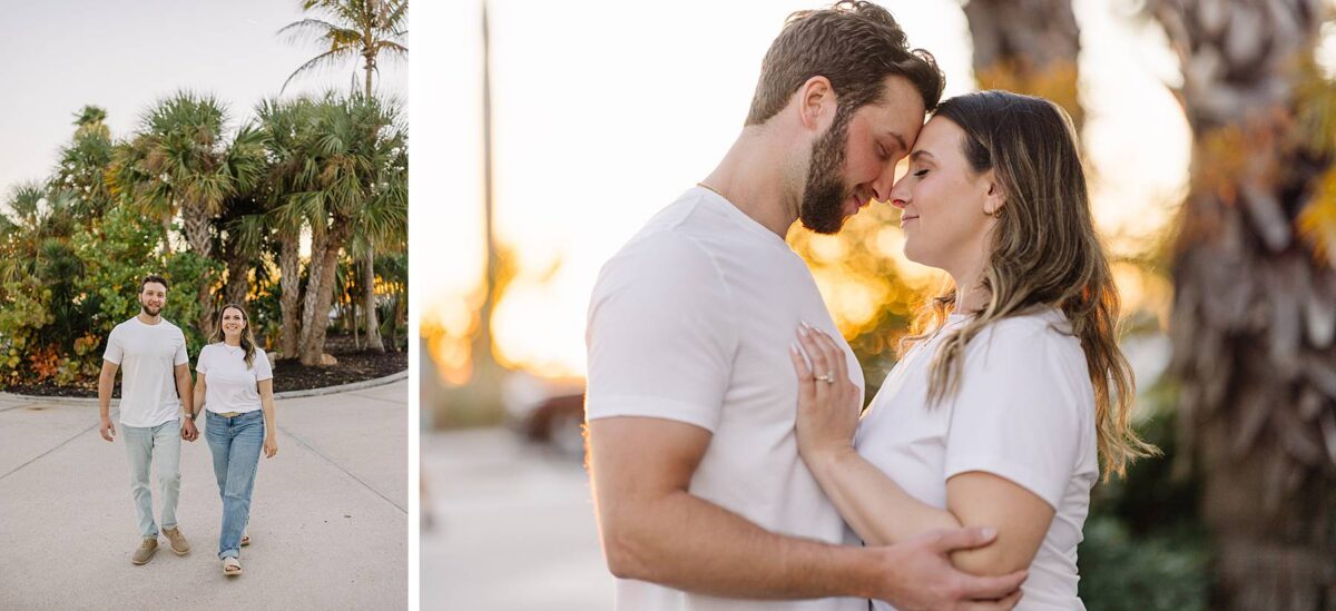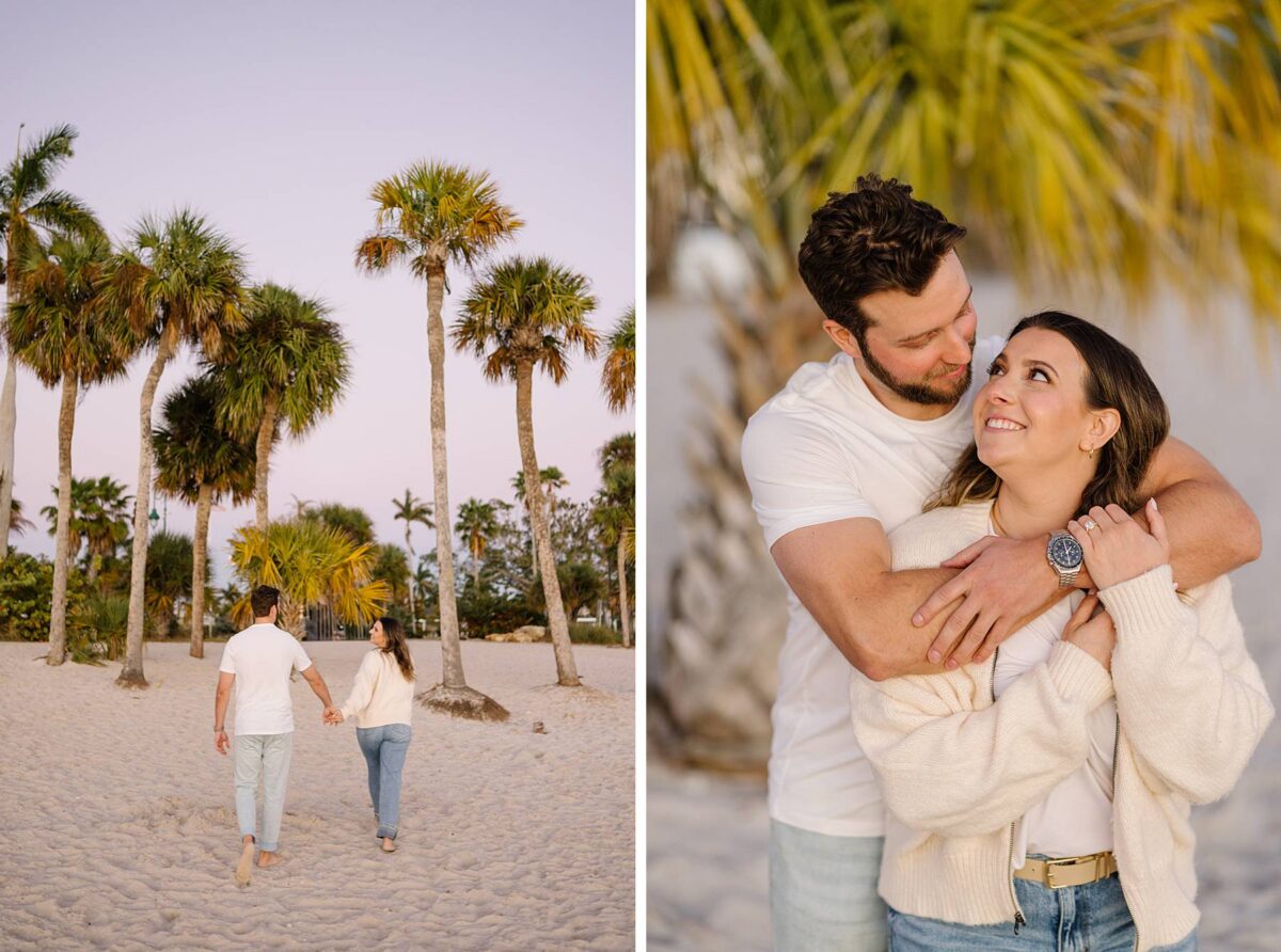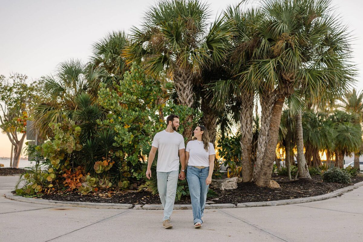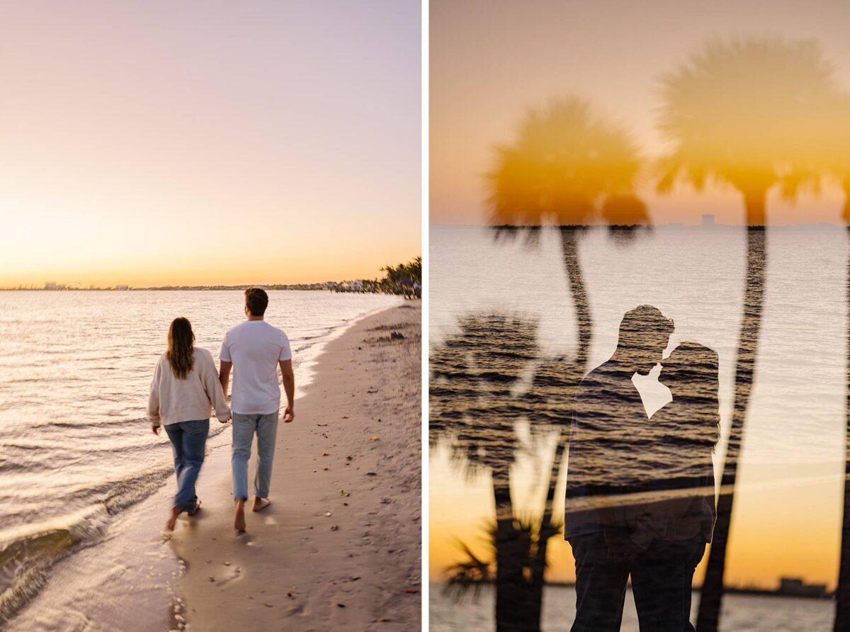 As the sun began to dip lower in the sky, we made our way to the Cape Coral Yacht Club to finish up at the beach. The golden hour light was pure magic, and we strolled along the shore, capturing candids as they soaked up their last evening in Florida. They had flown down for a work trip at the JW Marriott Marco Island Beach Resort, and their session was the perfect way to wrap up their stay! We ended the night capturing portraits among the palm trees, silhouetting them against the final rays of light. It was such a romantic, peaceful, and beautiful way to reflect this exciting season of their lives. We are so happy for these two as they continue to plan their dream wedding and are so grateful to have captured this chapter of their love story!