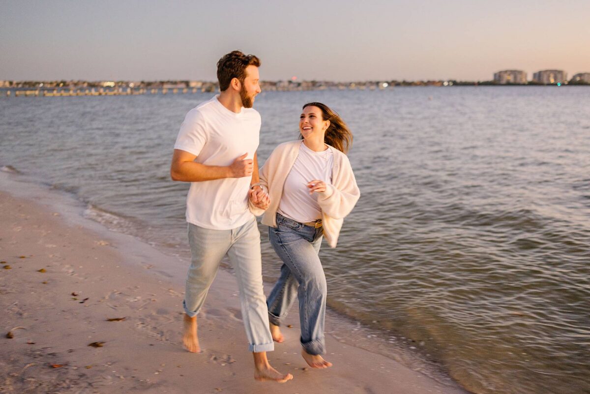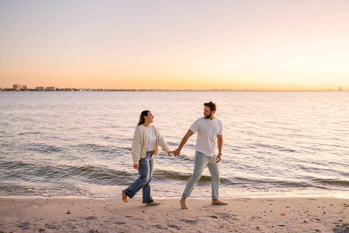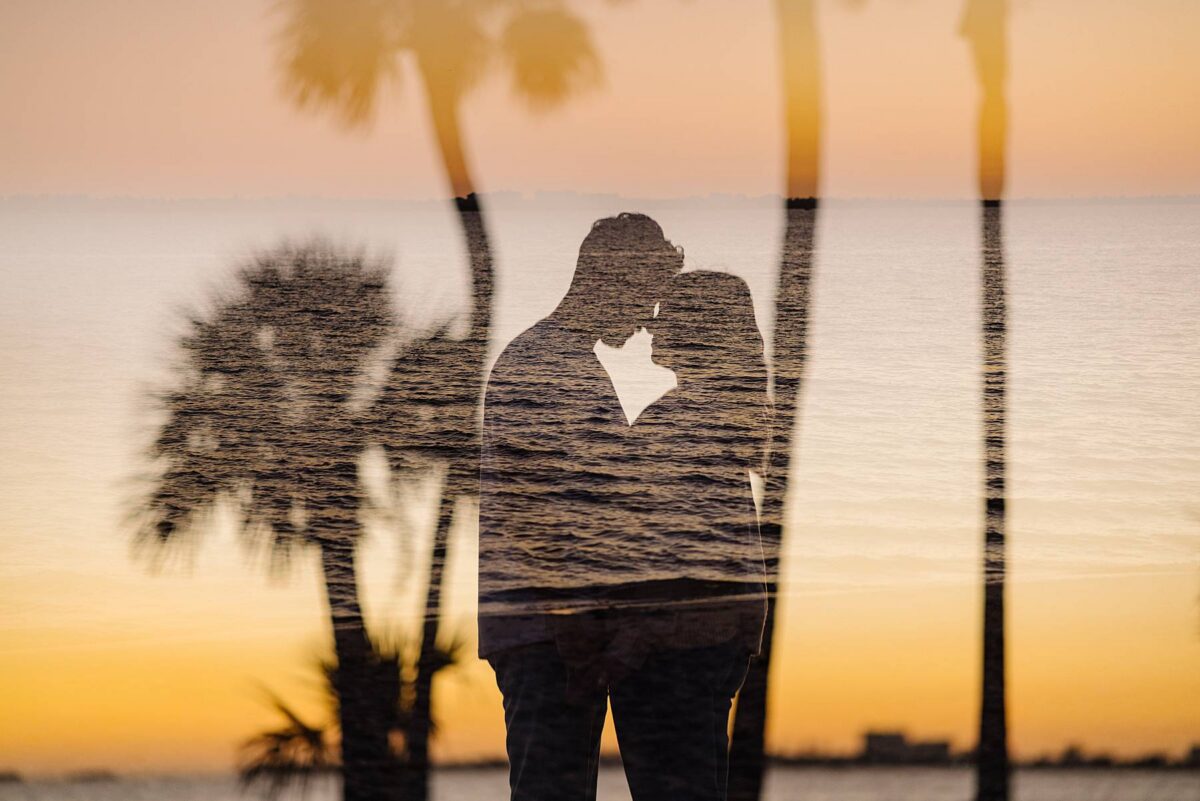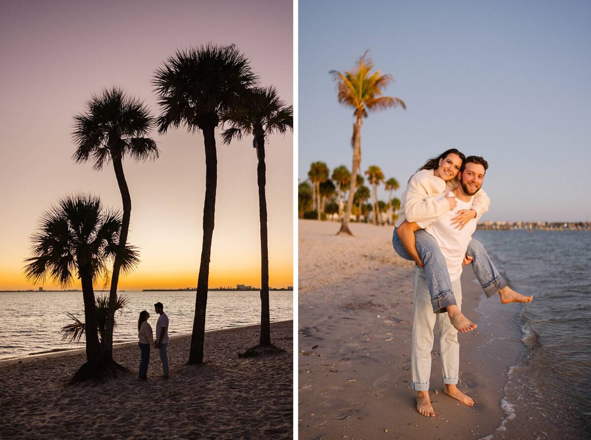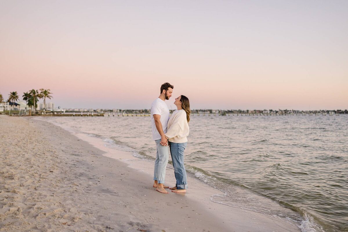 As the sun began to dip lower in the sky, we made our way to the Cape Coral Yacht Club to finish up at the beach. The golden hour light was pure magic, and we strolled along the shore, capturing candids as they soaked up their last evening in Florida. They had flown down for a work trip at the JW Marriott Marco Island Beach Resort, and their session was the perfect way to wrap up their stay! We ended the night capturing portraits among the palm trees, silhouetting them against the final rays of light. It was such a romantic, peaceful, and beautiful way to reflect this exciting season of their lives. We are so happy for these two as they continue to plan their dream wedding and are so grateful to have captured this chapter of their love story!