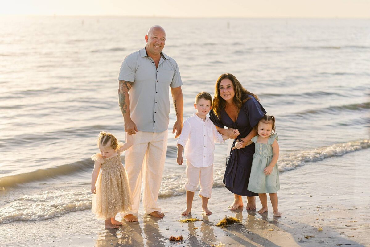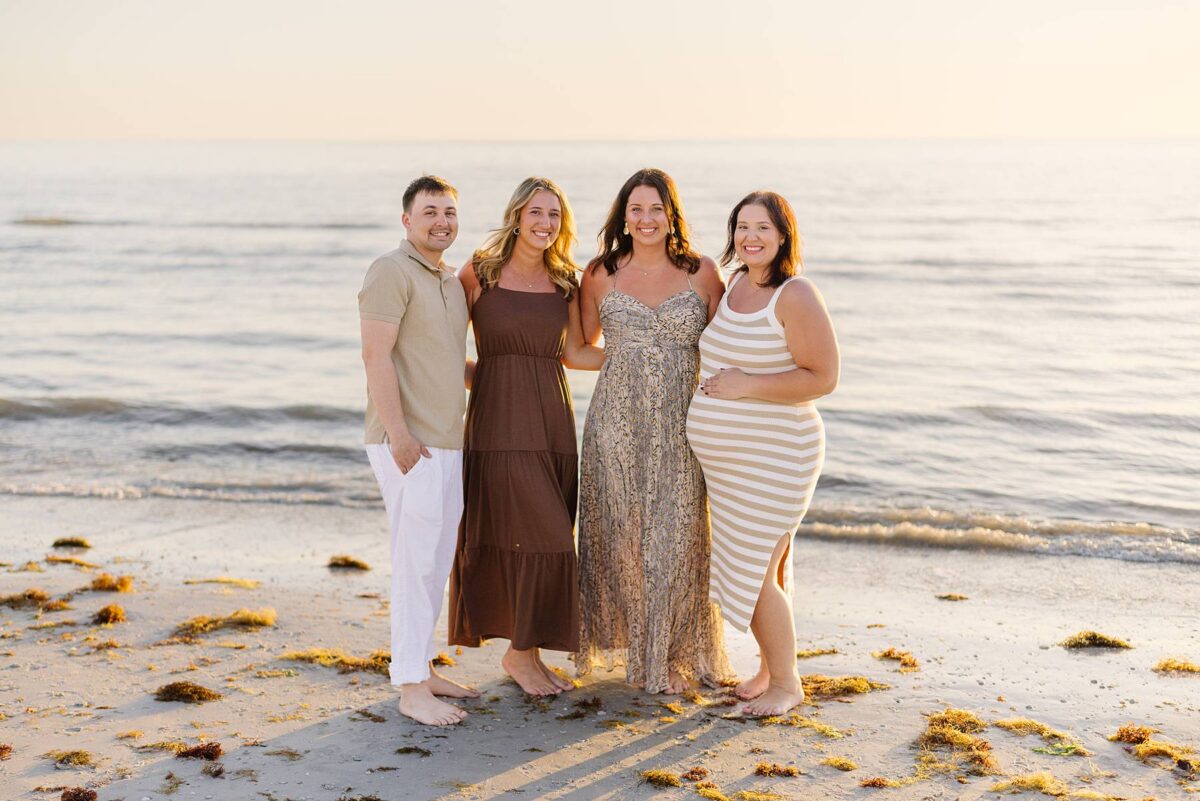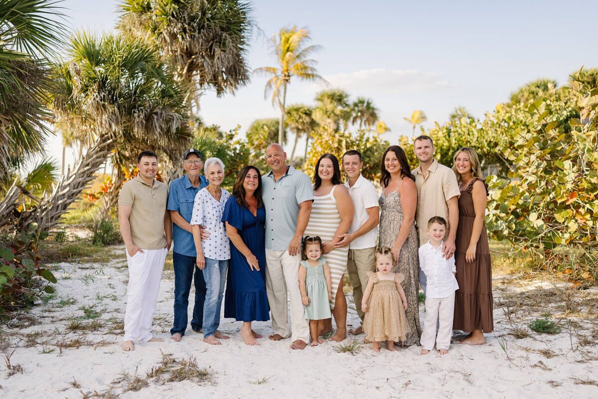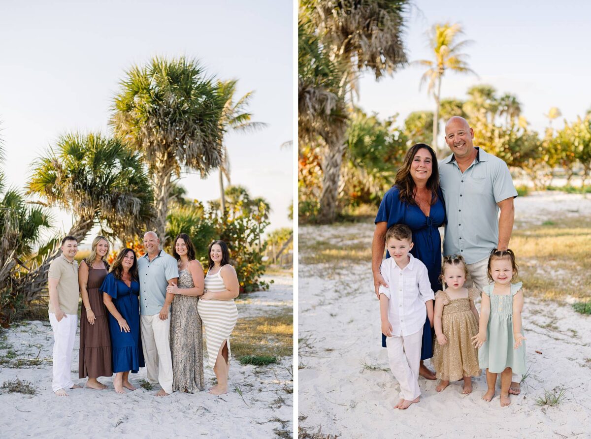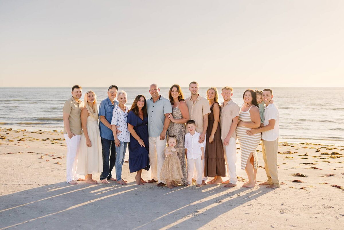 As we finished out the session, golden hour was absolute perfection. The sun wrapped the beach in a gorgeous warm glow, slowly shifting into soft pink and purple tones as it dipped below the horizon. Alyssa’s family chose outfits that complemented the setting flawlessly with blues, greens, browns, tans, and neutrals that blended beautifully with the sand and sea. As the sun set, we couldn’t help but reflect on how incredible it has been to photograph families in Florida. Capturing love, connection, and joy in a place as stunning as Fort Myers Beach is something we will never take for granted!