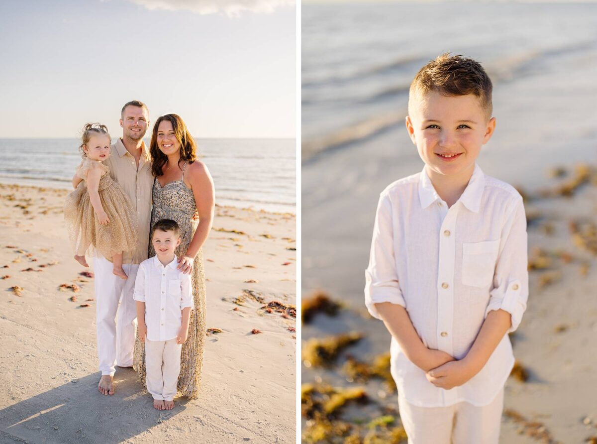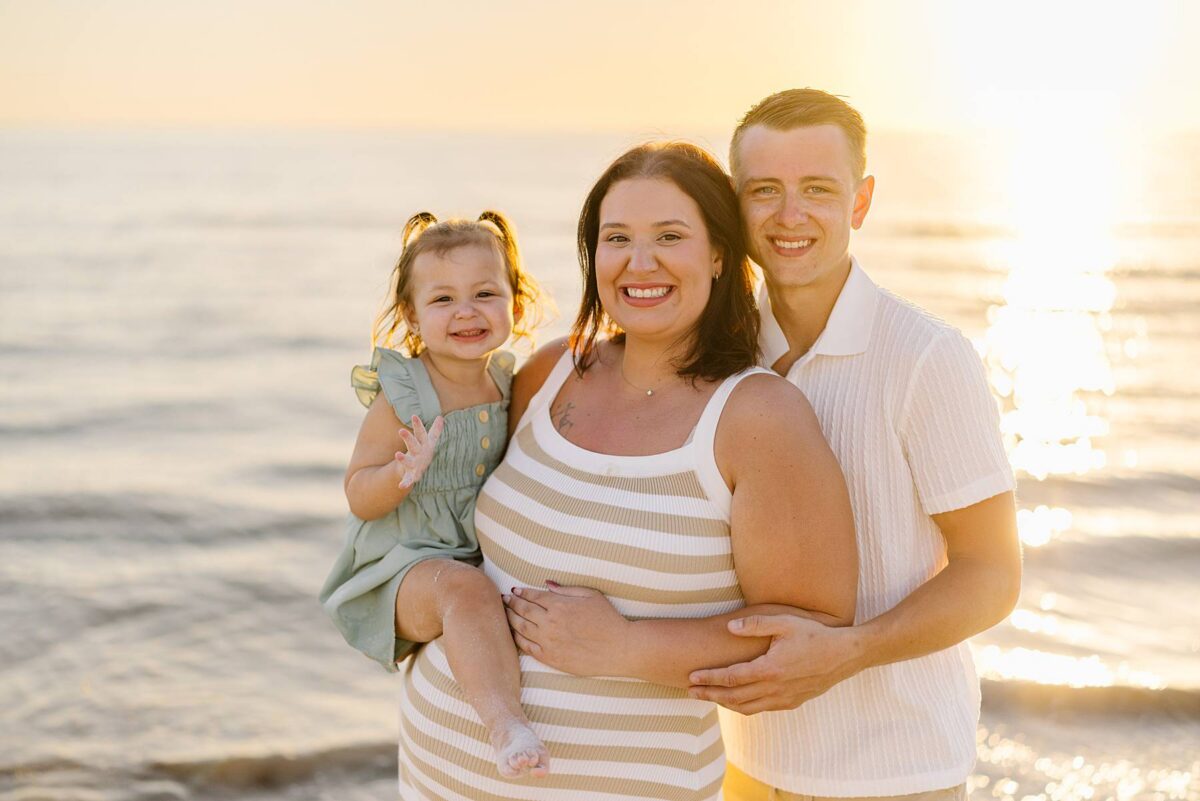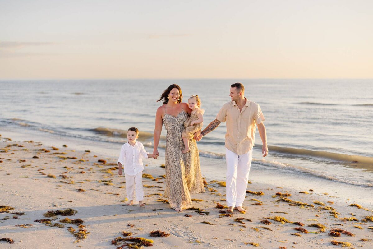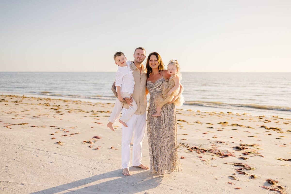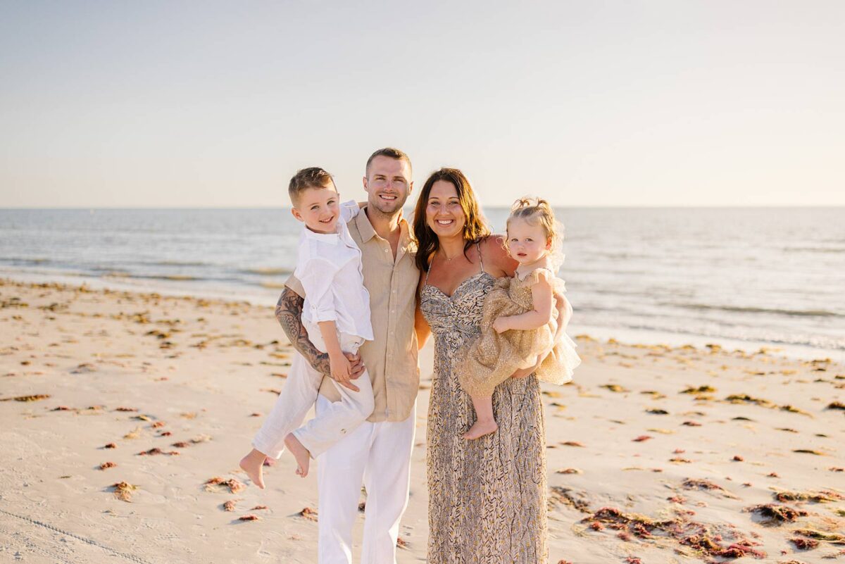 As we finished out the session, golden hour was absolute perfection. The sun wrapped the beach in a gorgeous warm glow, slowly shifting into soft pink and purple tones as it dipped below the horizon. Alyssa’s family chose outfits that complemented the setting flawlessly with blues, greens, browns, tans, and neutrals that blended beautifully with the sand and sea. As the sun set, we couldn’t help but reflect on how incredible it has been to photograph families in Florida. Capturing love, connection, and joy in a place as stunning as Fort Myers Beach is something we will never take for granted!