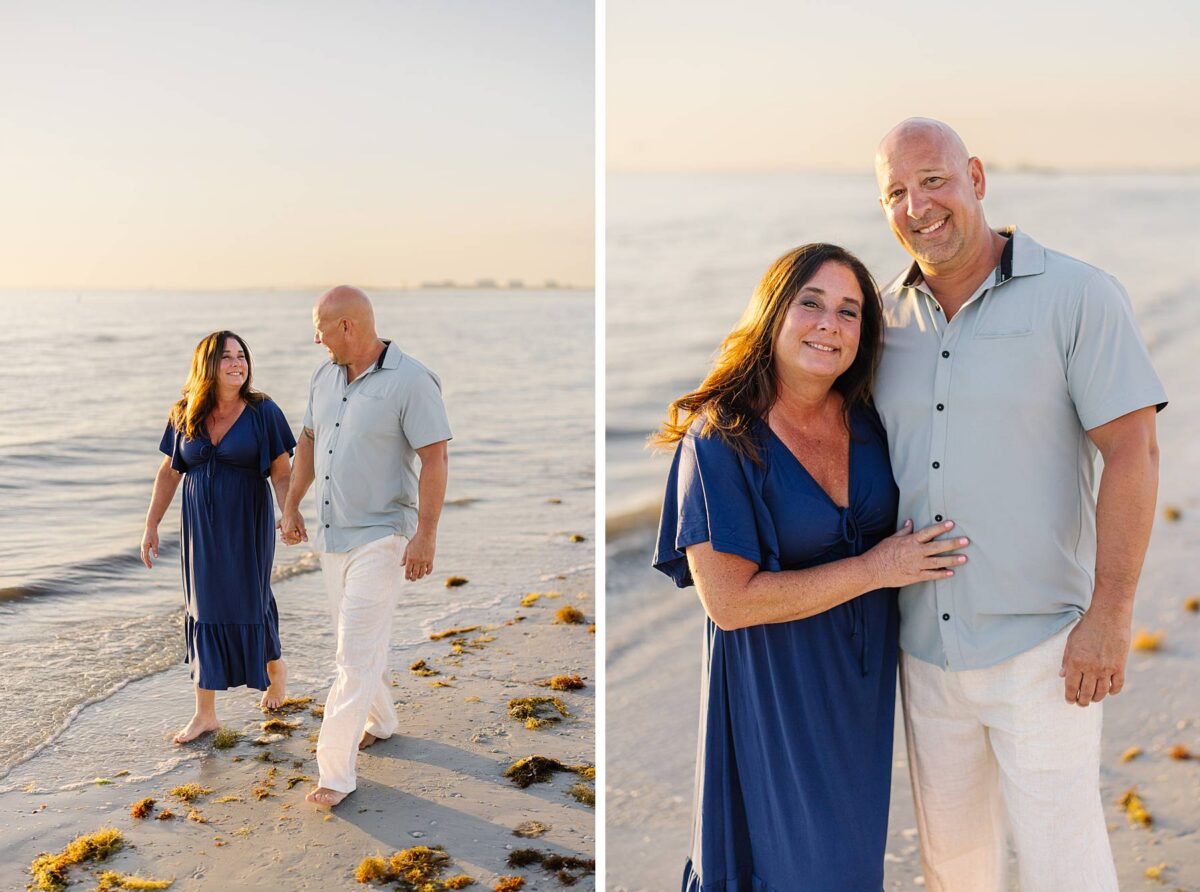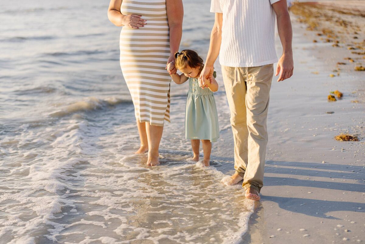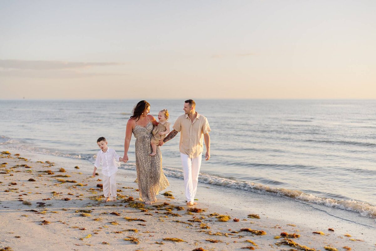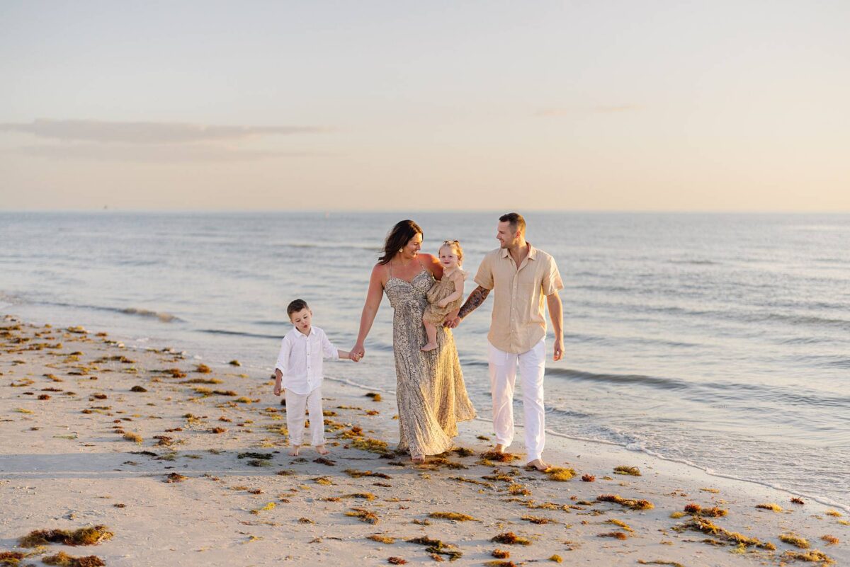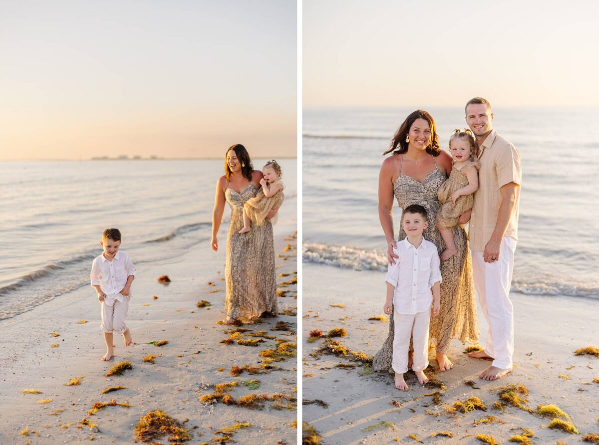 As we finished out the session, golden hour was absolute perfection. The sun wrapped the beach in a gorgeous warm glow, slowly shifting into soft pink and purple tones as it dipped below the horizon. Alyssa’s family chose outfits that complemented the setting flawlessly with blues, greens, browns, tans, and neutrals that blended beautifully with the sand and sea. As the sun set, we couldn’t help but reflect on how incredible it has been to photograph families in Florida. Capturing love, connection, and joy in a place as stunning as Fort Myers Beach is something we will never take for granted!