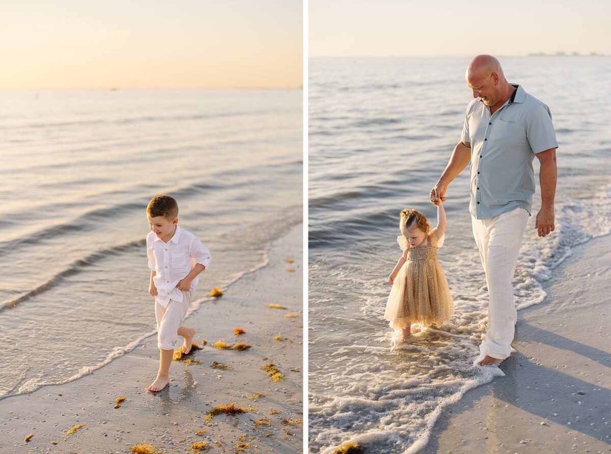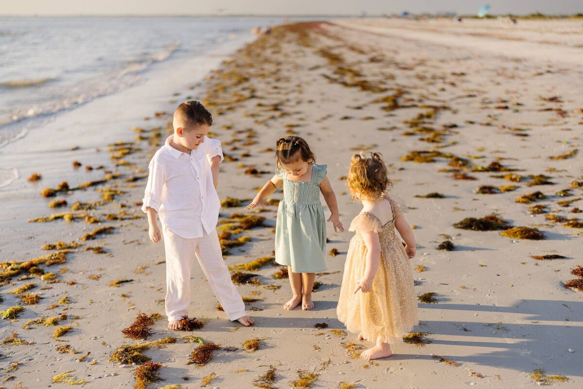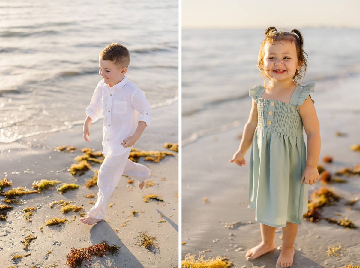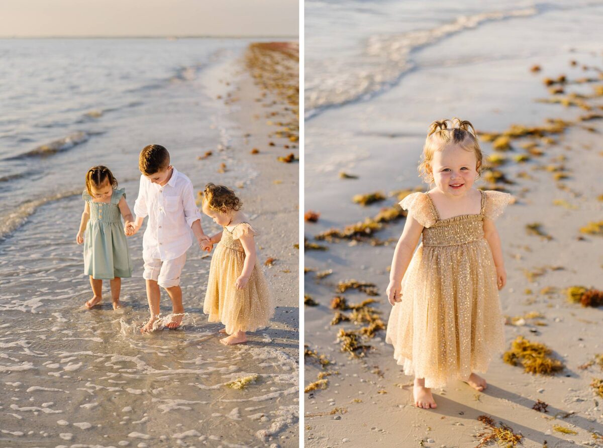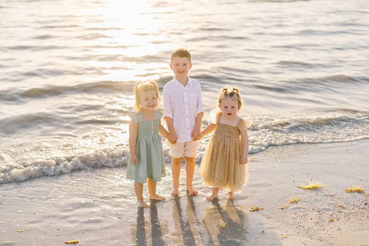 We began their session tucked among the palm trees, capturing photos of each group. There is something especially meaningful about photographing multiple generations. Watching great-grandparents, and grandparents with their kids and grandkids soaking enjoying this short but sweet season of life together is always such a gift. We could hardly believe how much the kids had grown in just one year! As we made our way out onto the beach, the kids had a blast running, splashing, and playing in the waves, completely carefree. The water, tiny shells, and the endless stretch of sand felt simply magical, and there is nothing quite like the beach through a child’s eyes!
